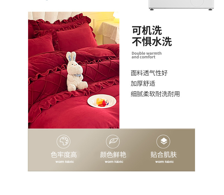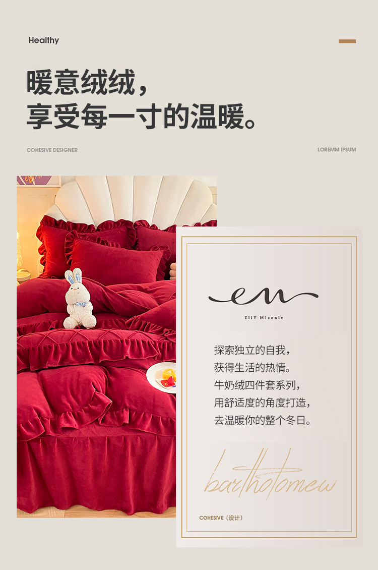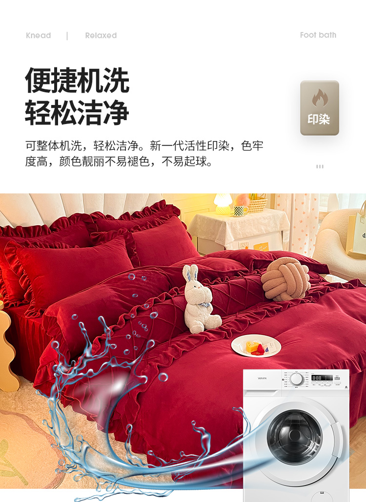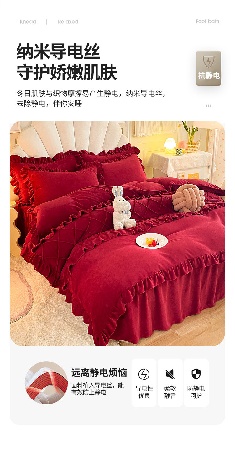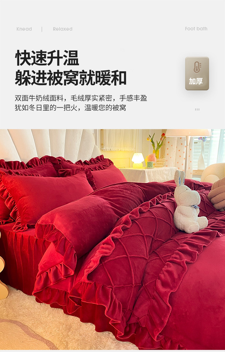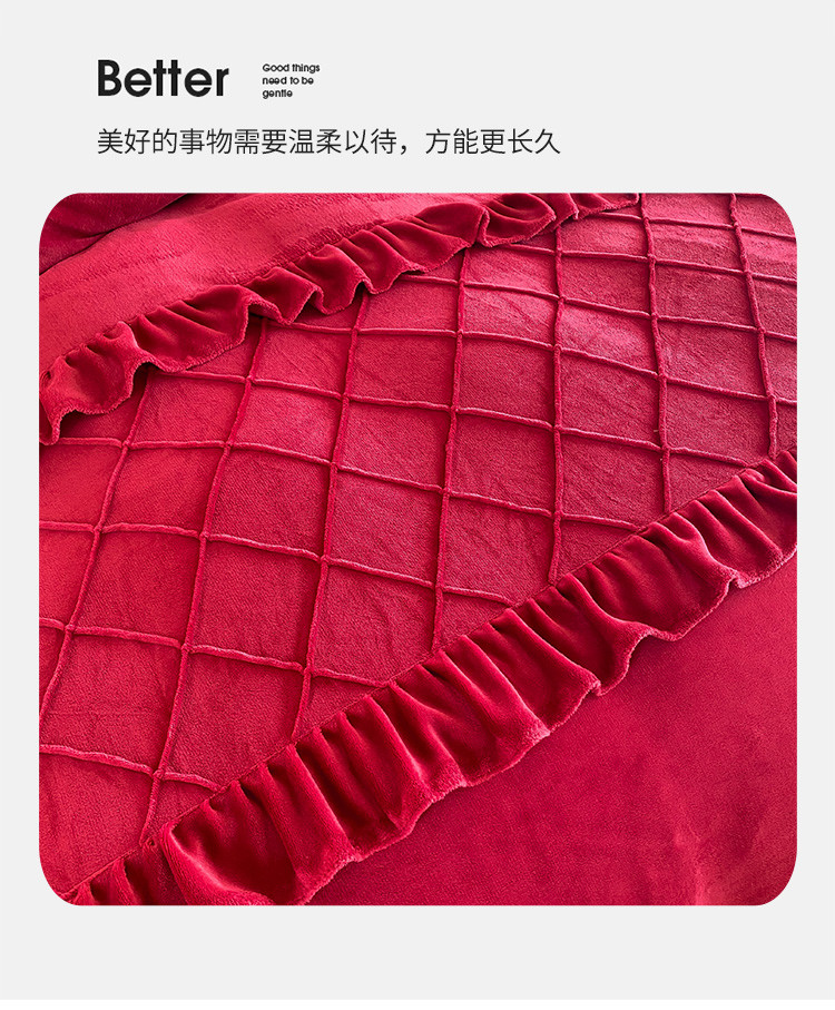 当前位置: 91家纺网 > 商品网购 > 床品套件 > 四件套 > 牛奶绒四件套 > 芭比蔓 2024新款直播供货韩版花边款牛奶绒四件套 宝石红