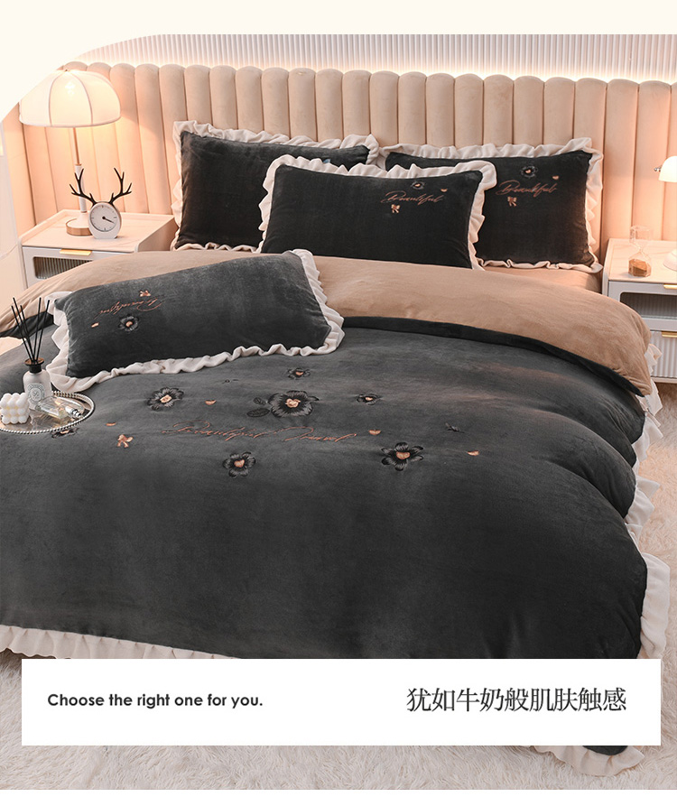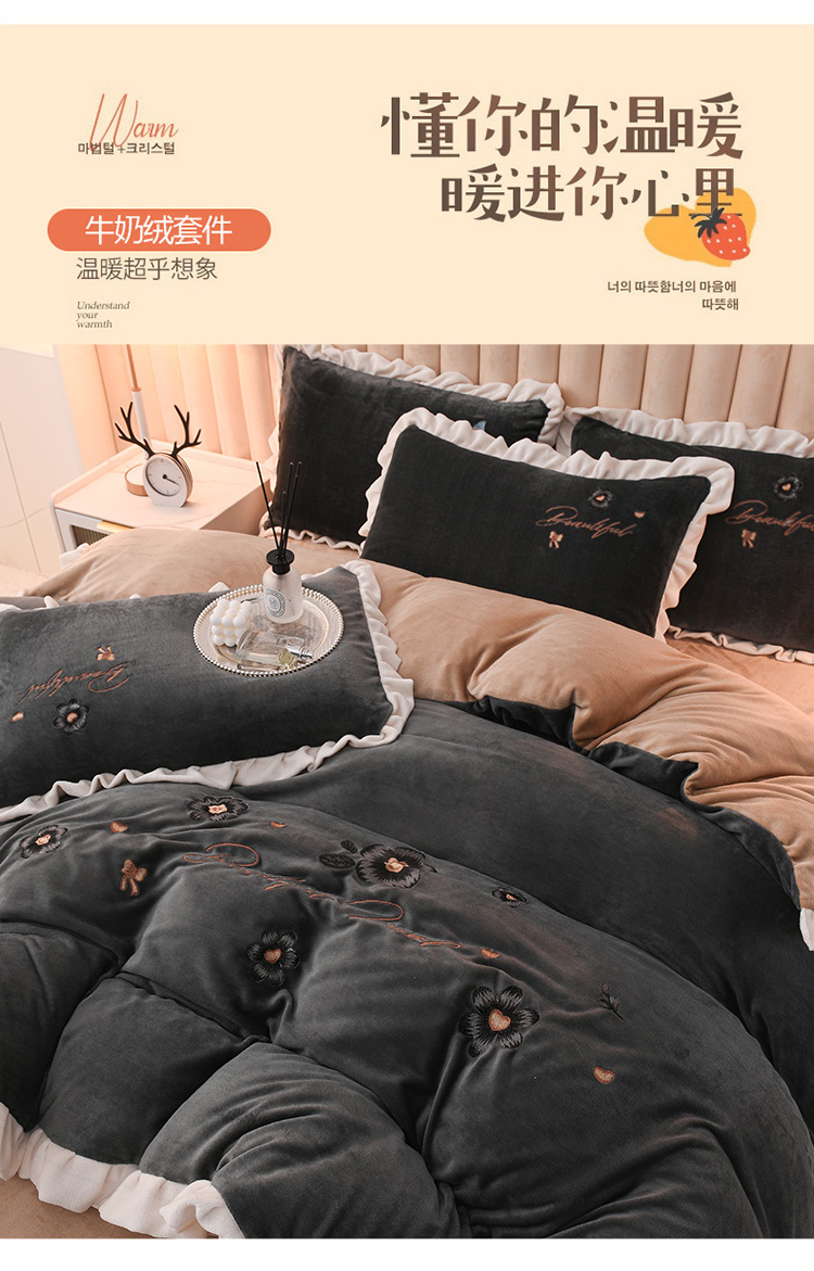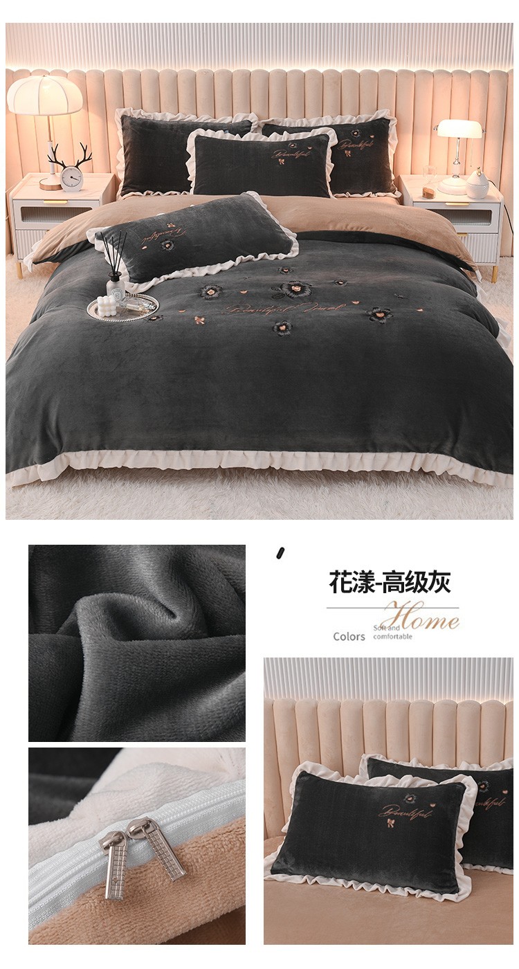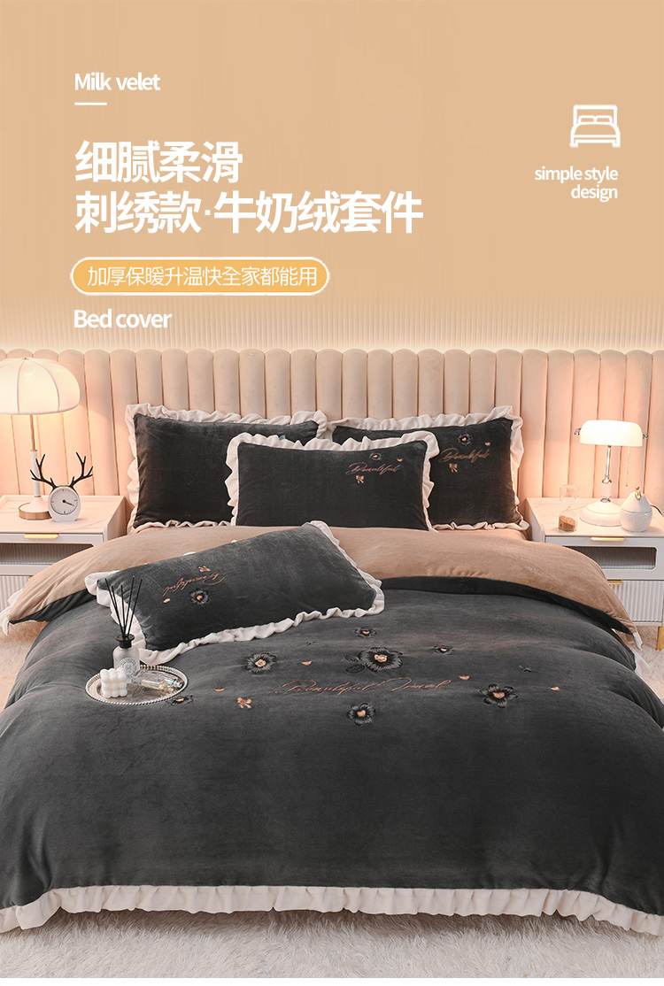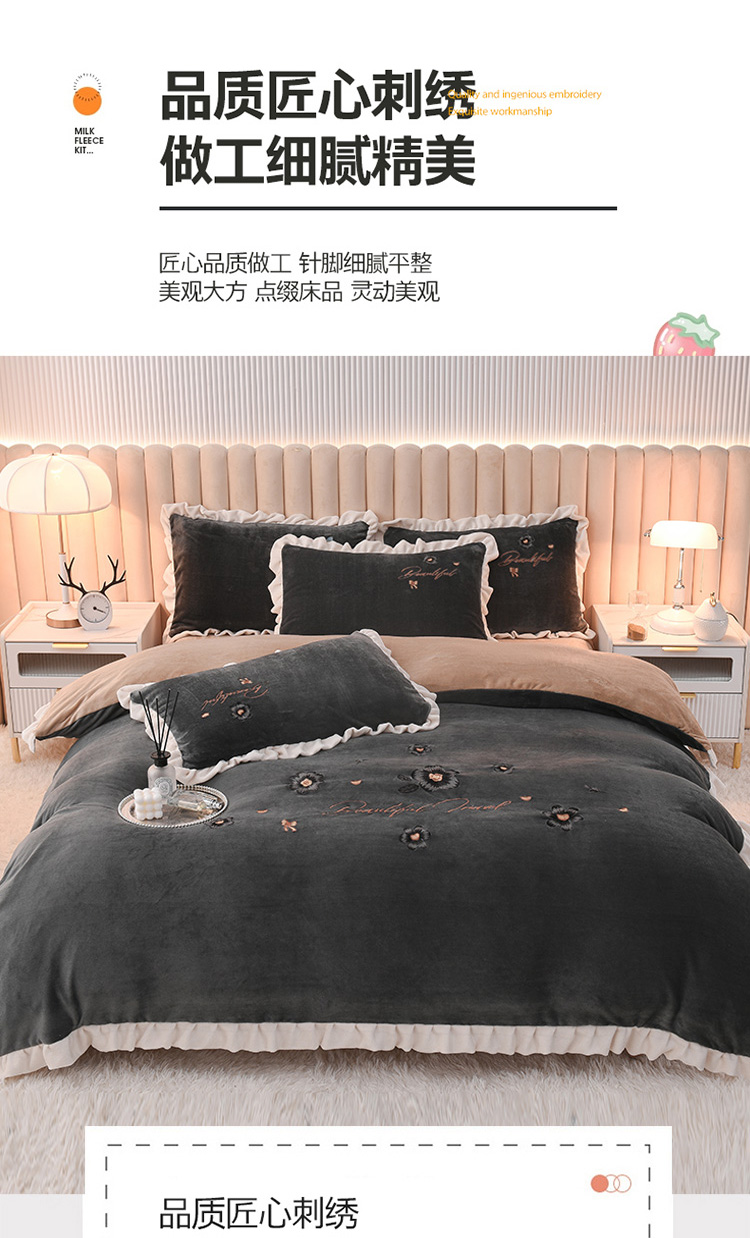 芃成 2022新款加厚保暖牛奶绒绣花四件套 花漾 高级灰