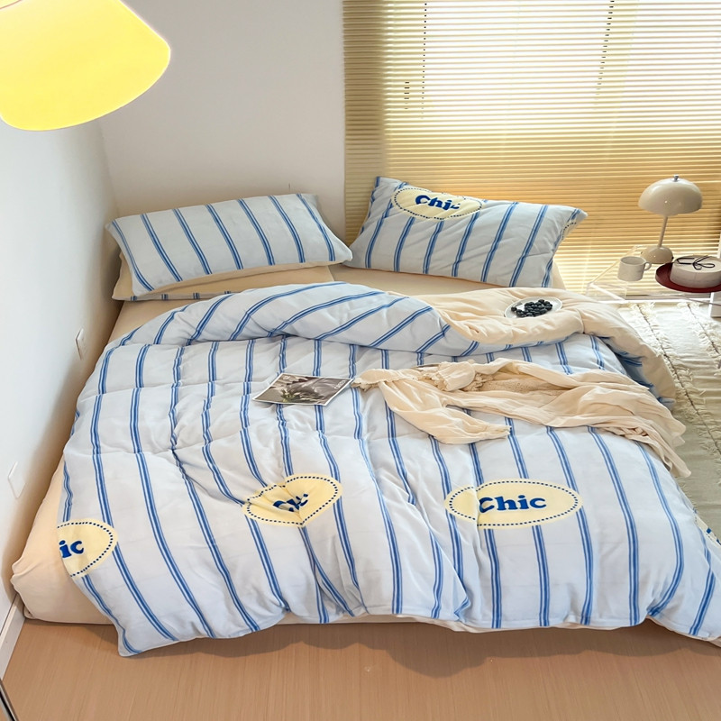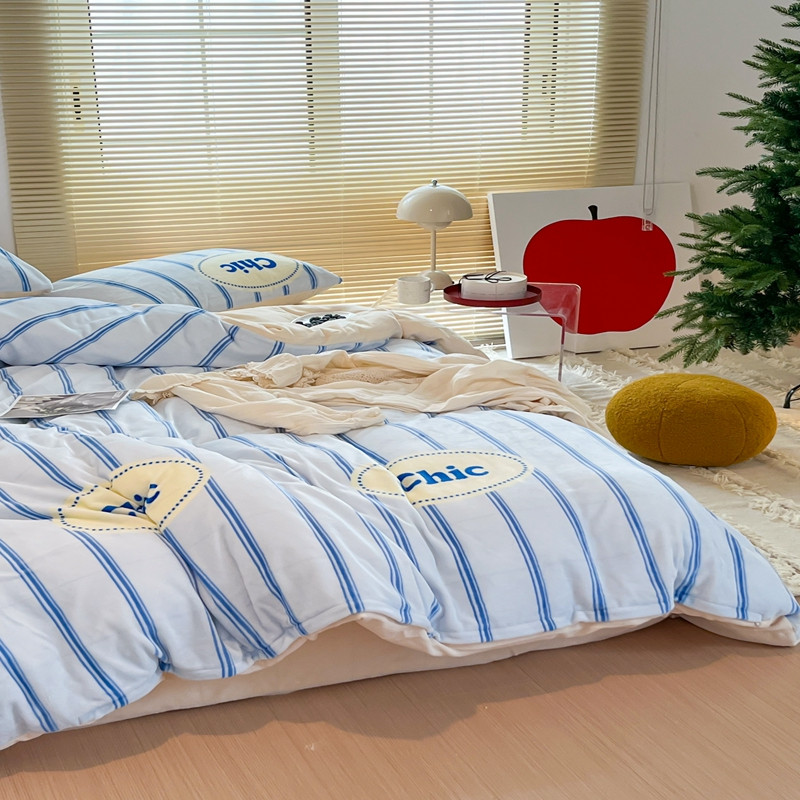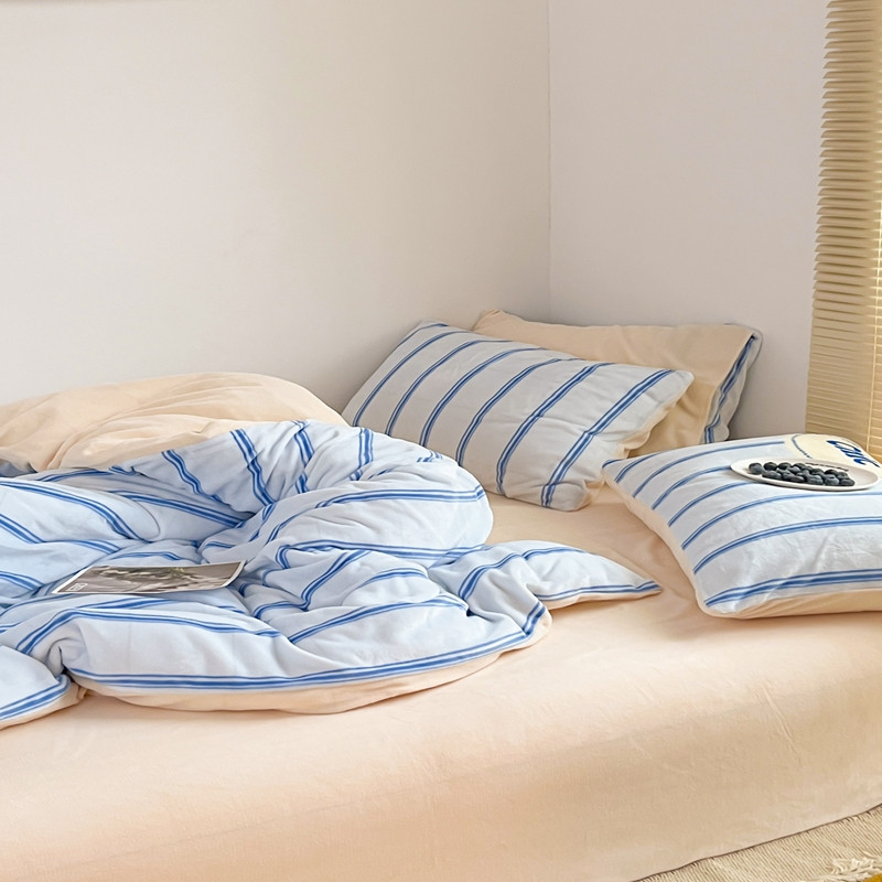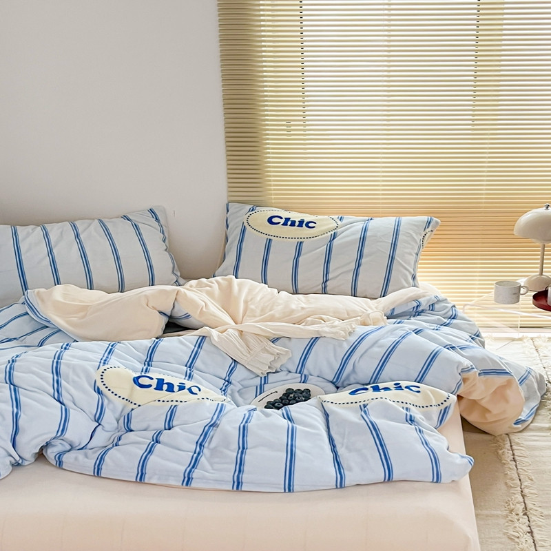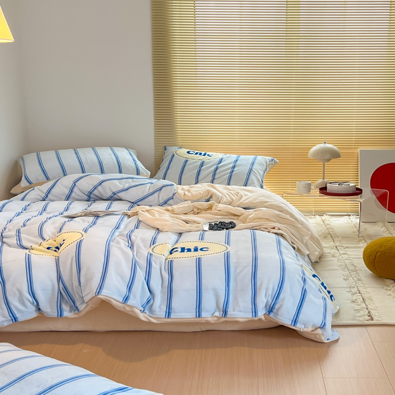 商品名称:昔可 2022新款简约条纹系列牛奶绒四件套 chic条纹蓝