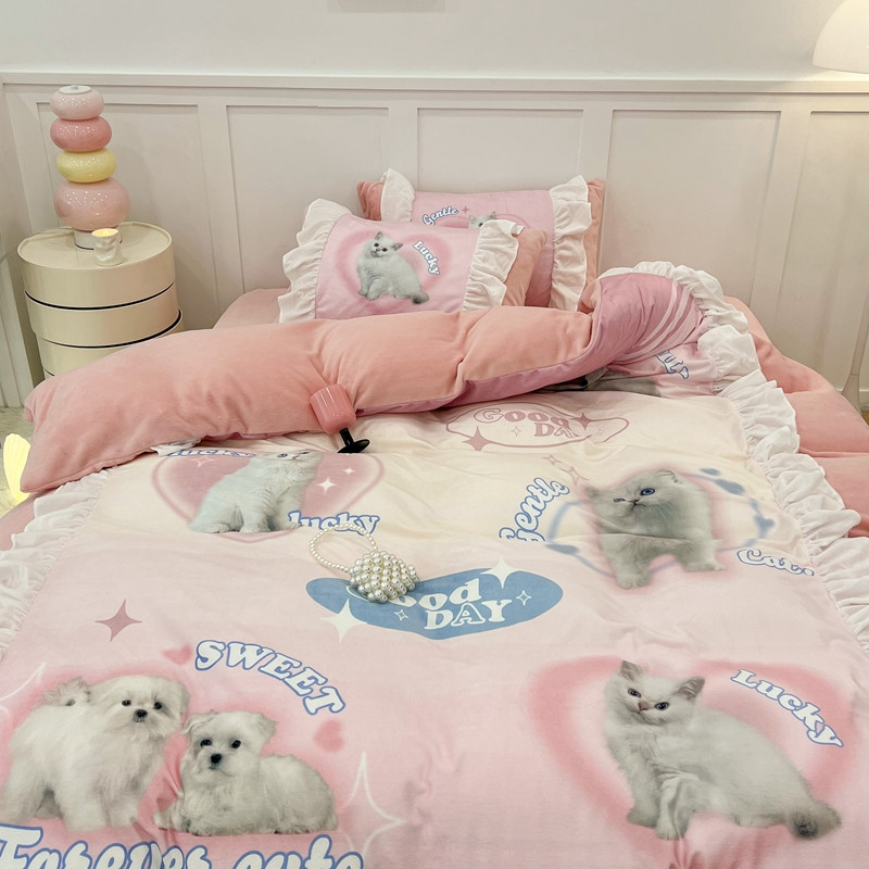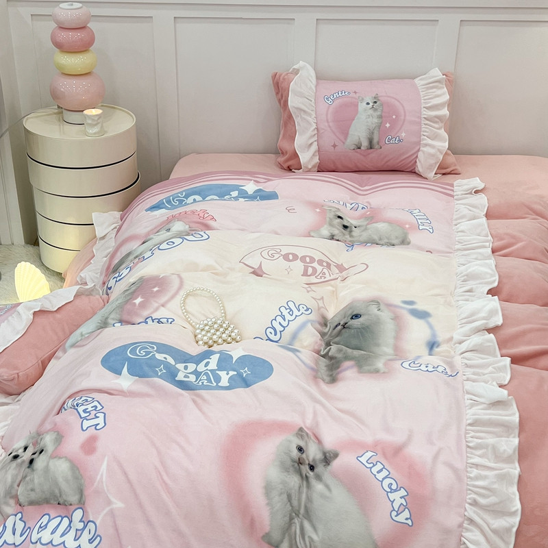 商品名称:昔可 2022新款数码印花花边款牛奶绒四件套 蜜桃粉猫