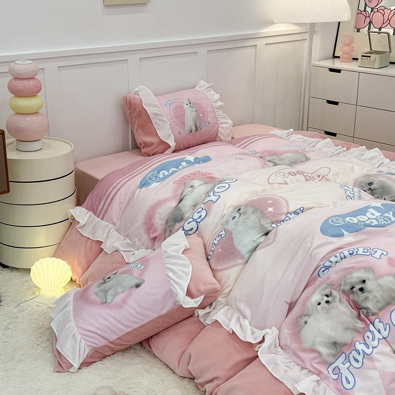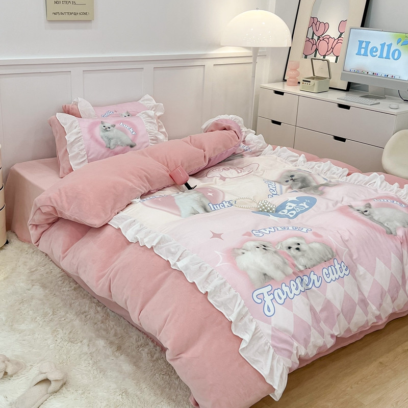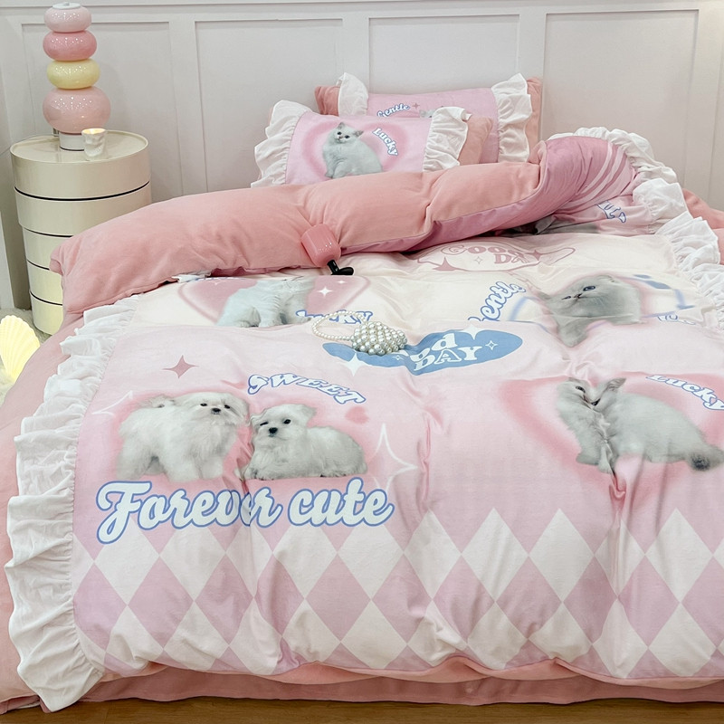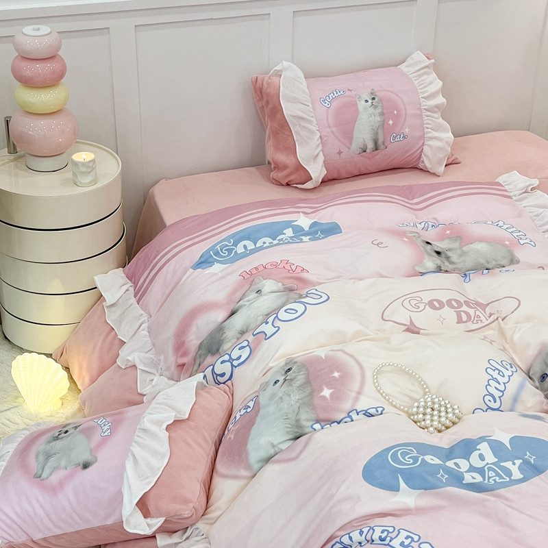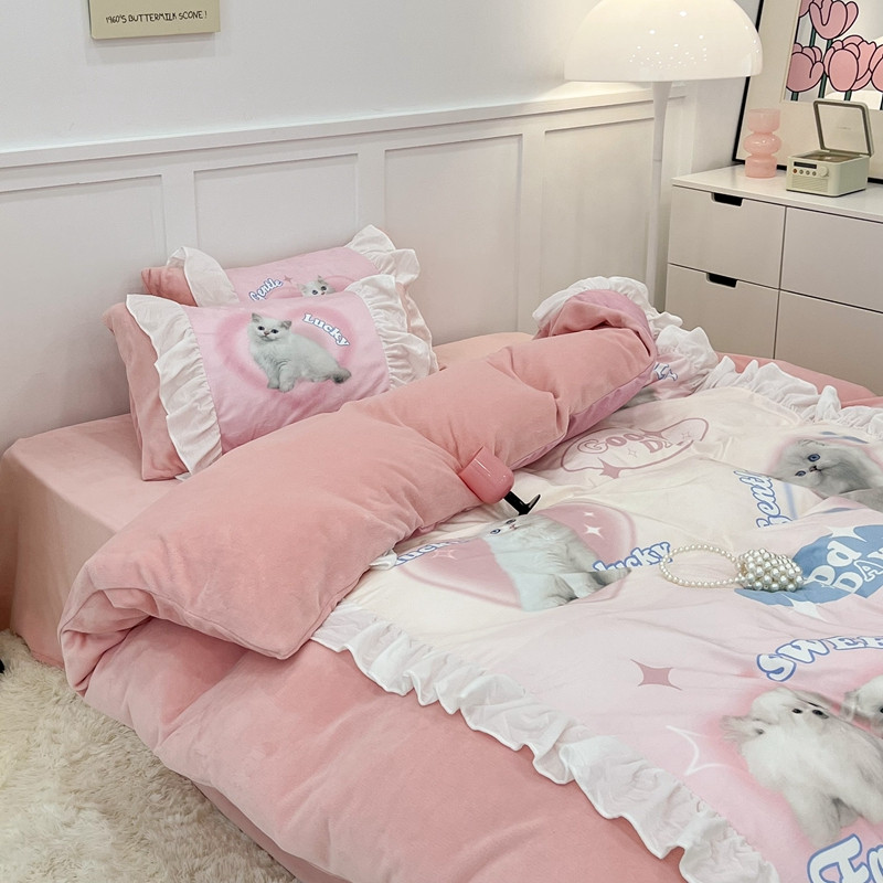 昔可 2022新款数码印花花边款牛奶绒四件套 蜜桃粉猫