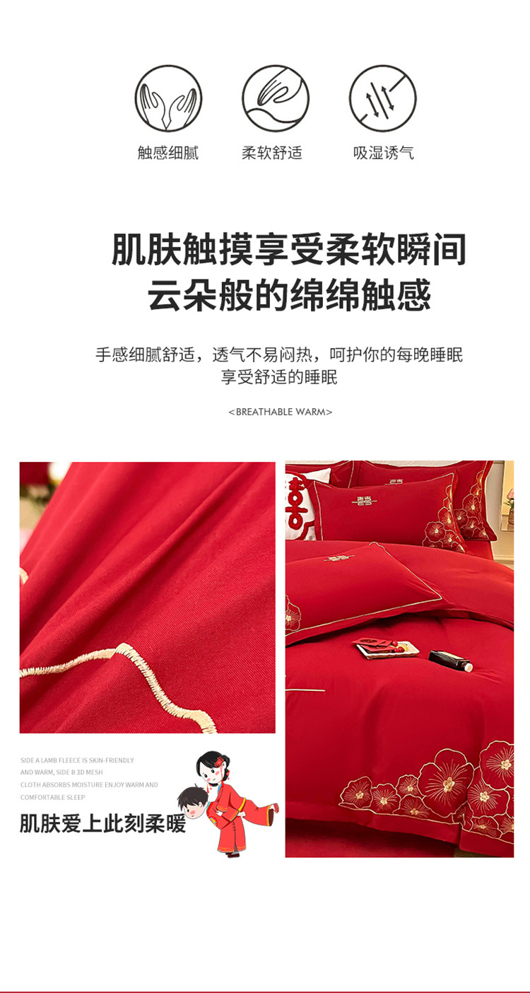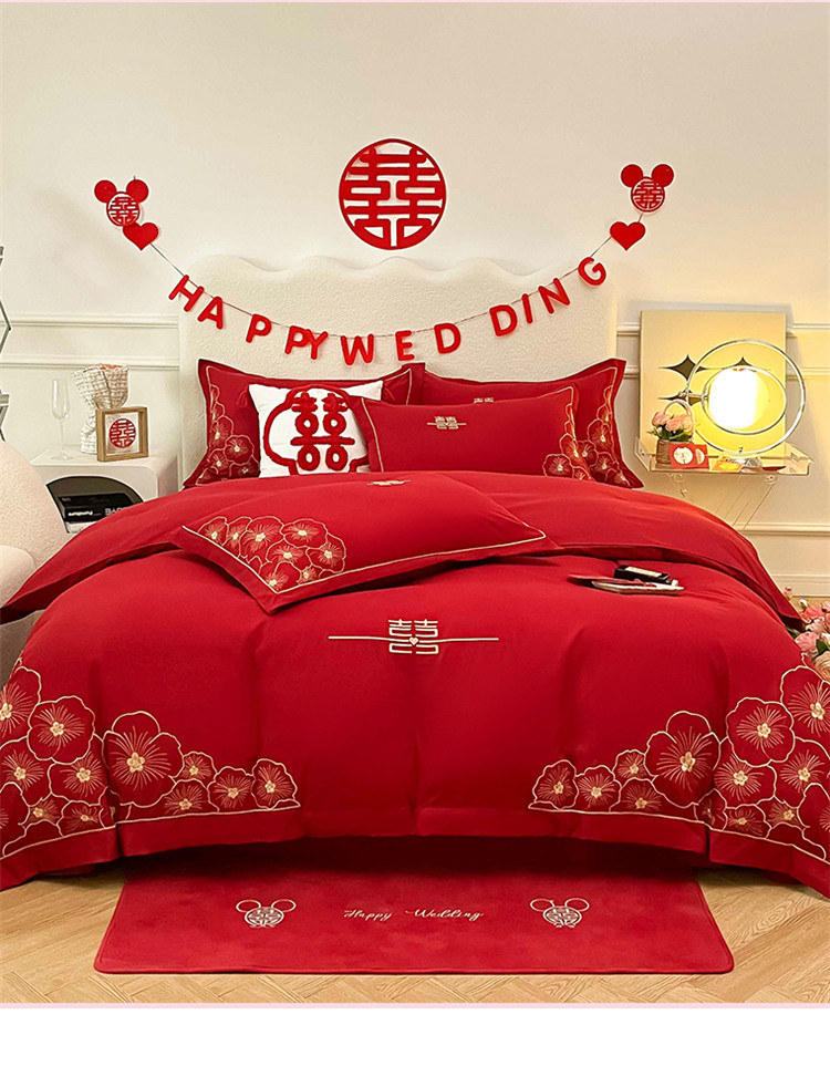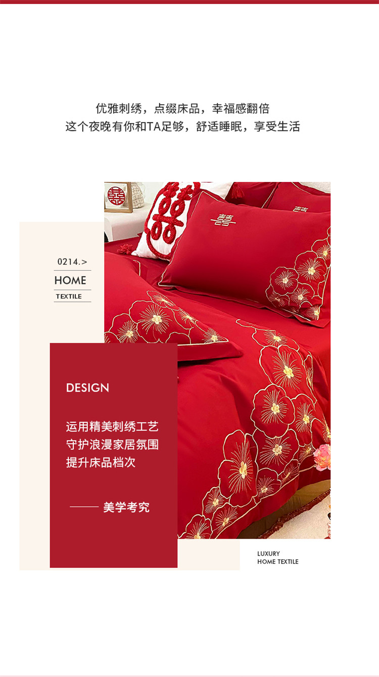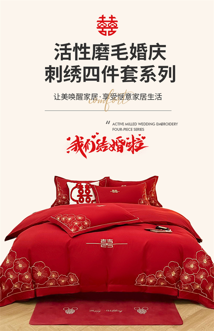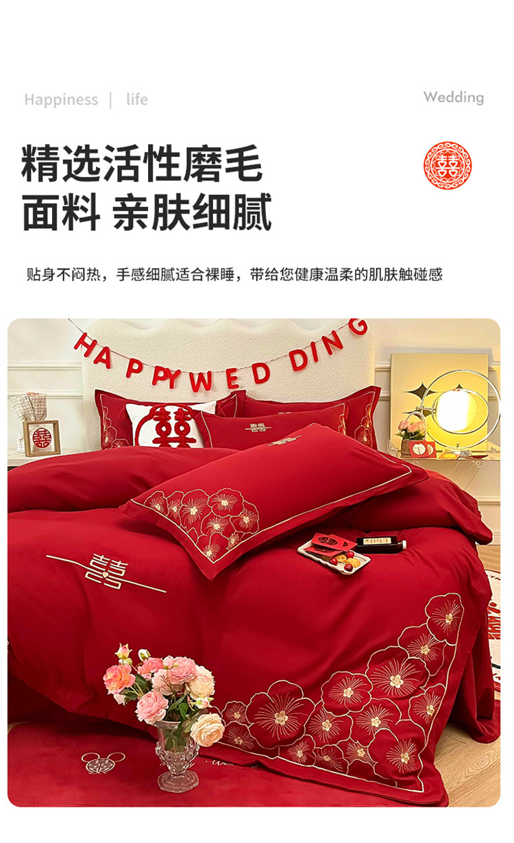 千希家纺家纺 2022新款婚庆磨毛刺绣大红色结婚四件套 花仙子