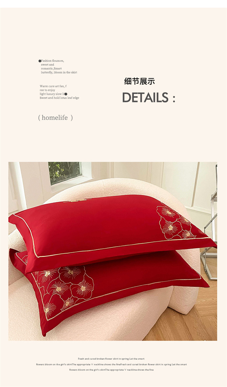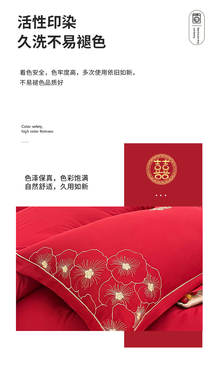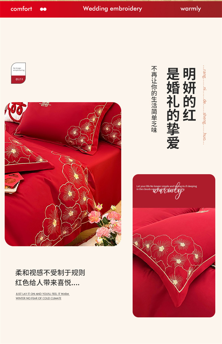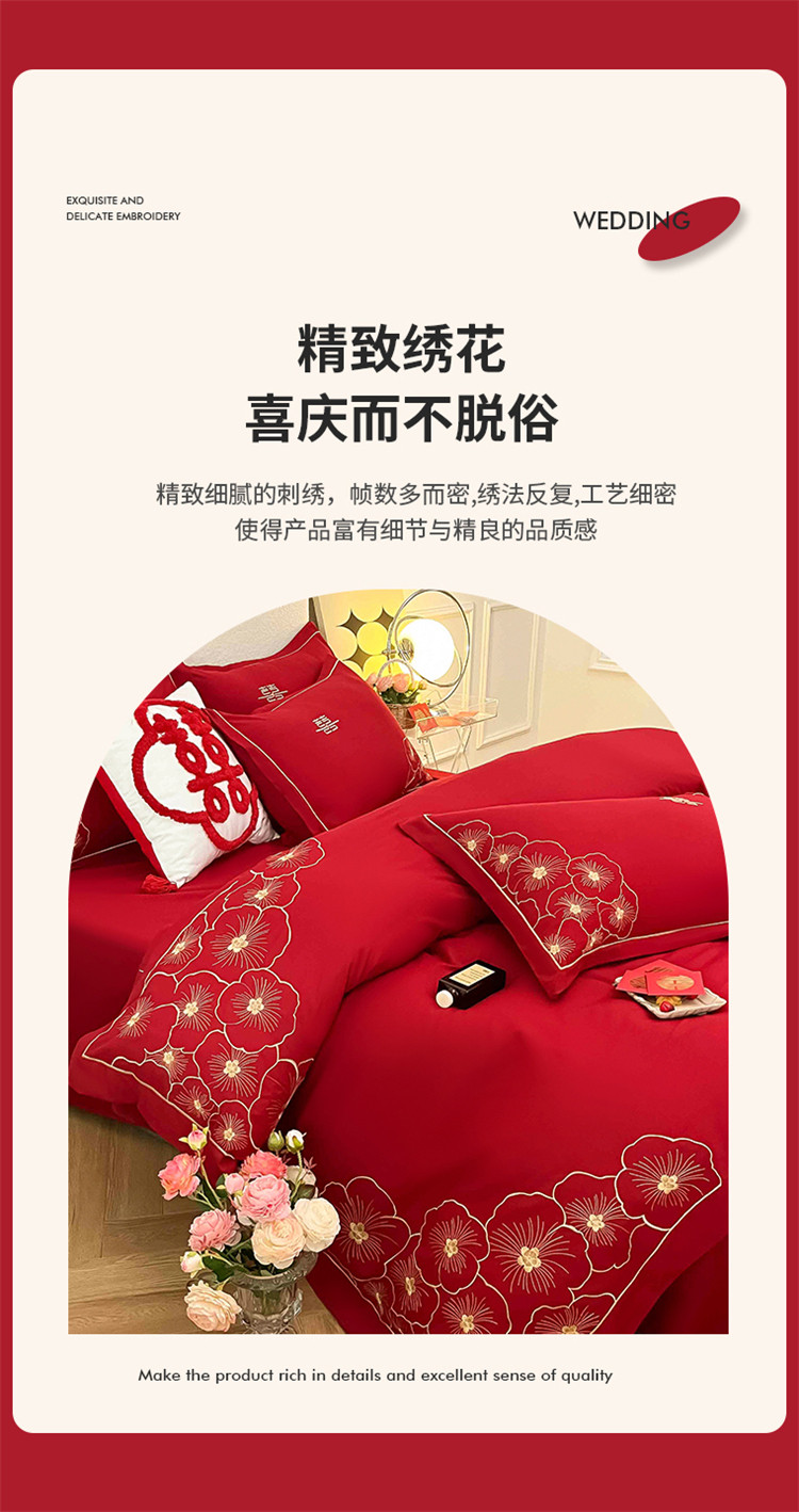 千希家纺家纺 2022新款婚庆磨毛刺绣大红色结婚四件套 花仙子