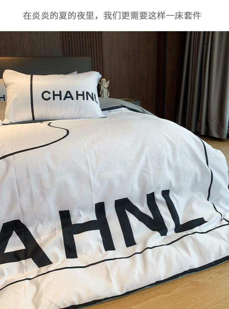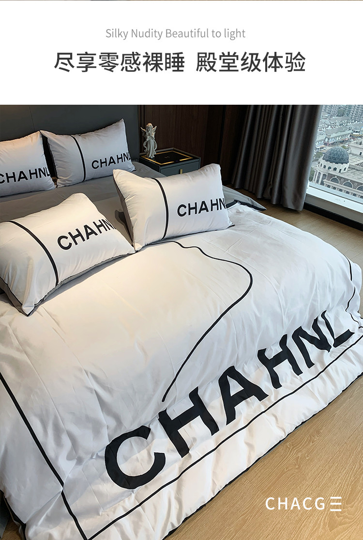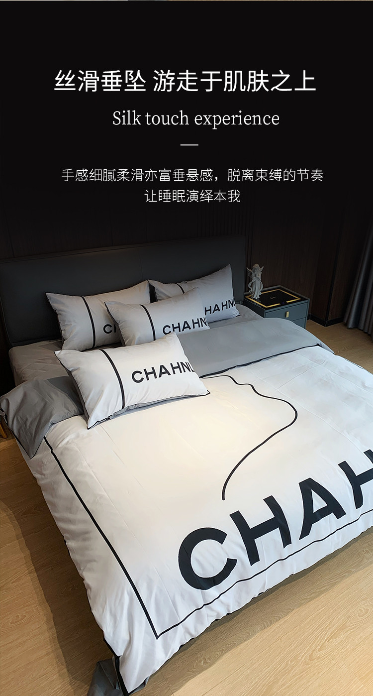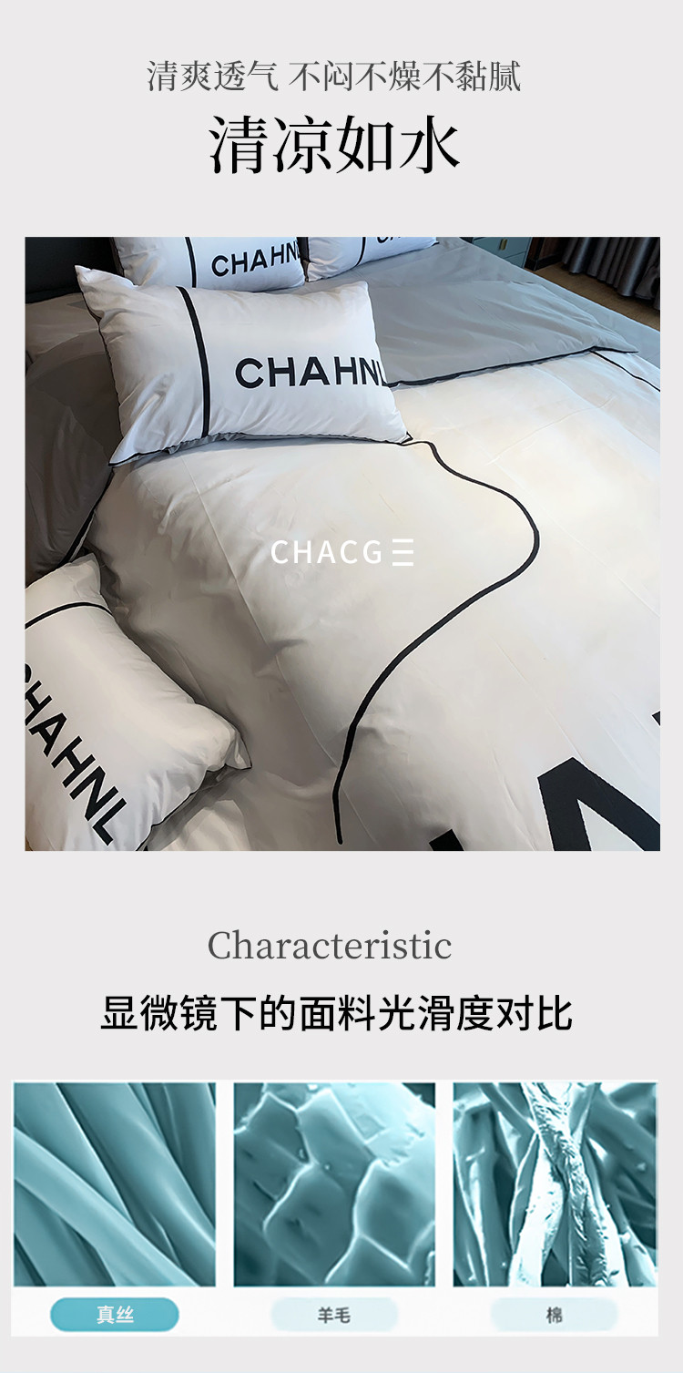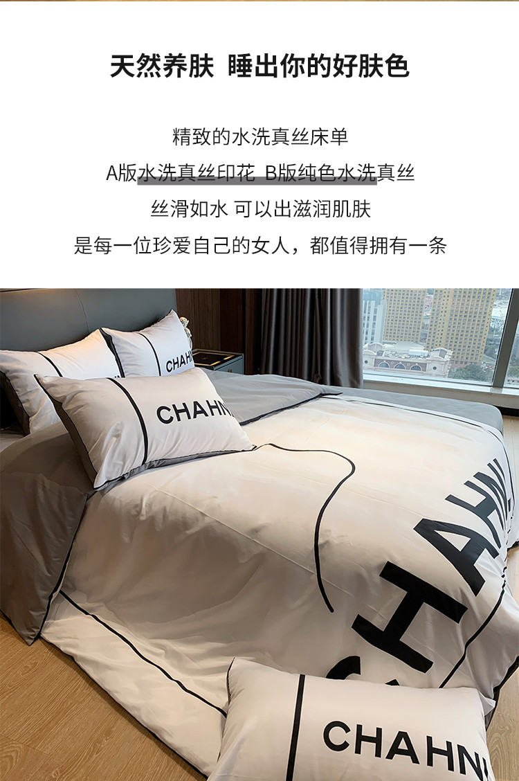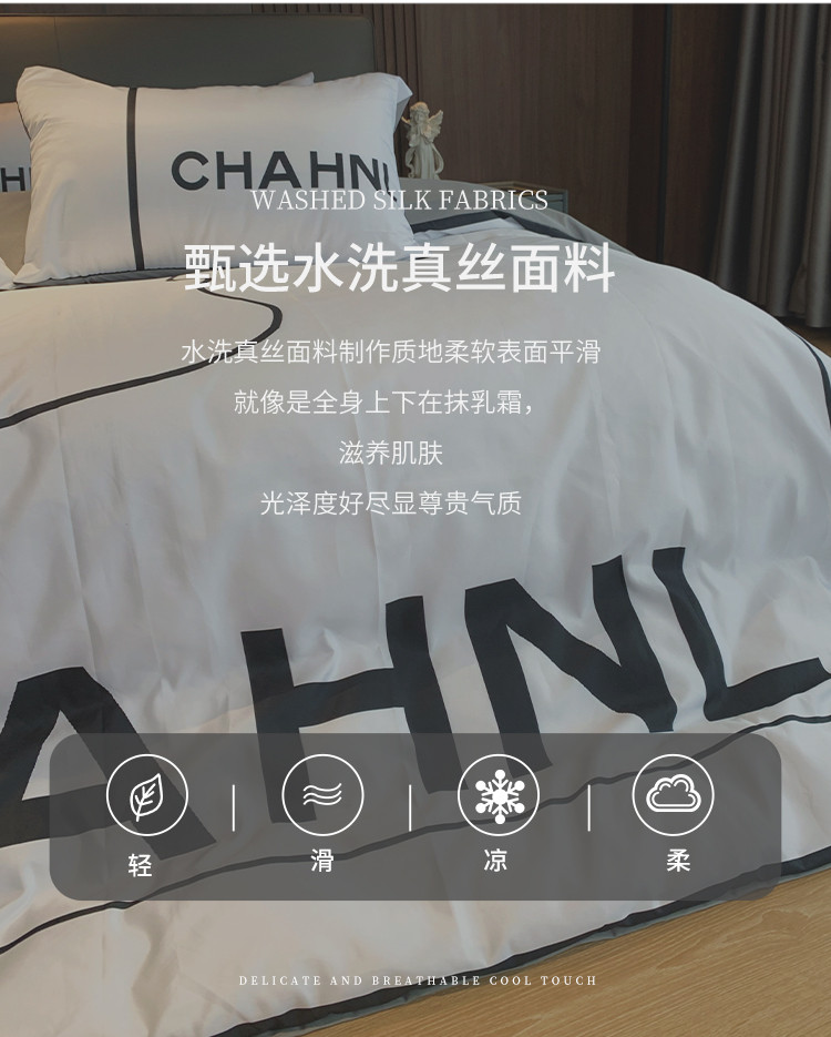 当前位置: 91家纺网 > 商品网购 > 床品套件 > 四件套 > 真丝四件套 > 色鬼布艺 2023新款水洗真丝大牌风四件套 白色字母