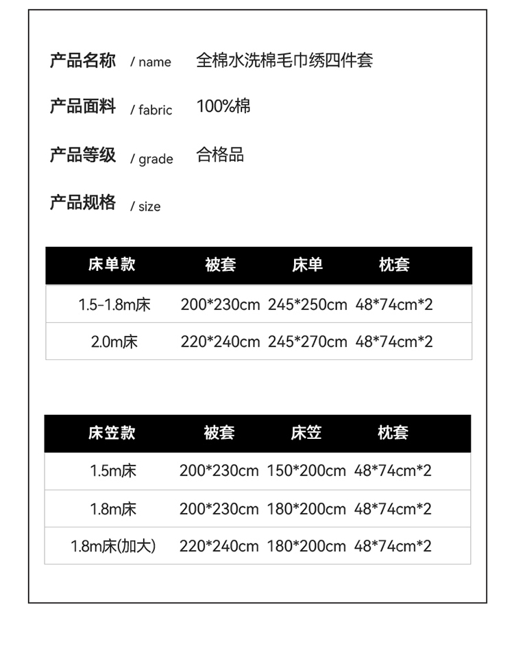 [{"sp_id":11,"sp_name":"\u989c\u8272\u5206\u7c7b","sp_format":2,"sp_list":[{"sp_value_id":653,"sp_value_name":"\u8c46\u8c46\u718a","sp_value_image":{"id":999,"path":"https:\/\/img3.91jf.com\/ghelp\/2023\/20230309\/20230309125215546.jpg_30_30.jpg"},"sp_value_video":{"id":0,"img":"","path":"","time":0,"download_num":0,"play_num":0},"price":"135.00","storage":600,"weight":"2.500","is_check_weight":0,"plus_price":"","sp_sort":174039659}]},{"sp_id":10,"sp_name":"\u9002\u7528\u5e8a\u5c3a\u5bf8","sp_format":1,"sp_list":[{"sp_value_id":38,"sp_value_name":"1.2m\u5e8a\u5355\u6b3e\u4e09\u4ef6\u5957","sp_value_image":{"id":0,"path":""},"sp_value_video":{"id":0,"img":"","path":"","time":0,"download_num":0,"play_num":0},"price":"135.00","storage":100,"weight":"2.500","is_check_weight":0,"plus_price":"","sp_sort":174039659},{"sp_value_id":40,"sp_value_name":"1.5m\u5e8a\u5355\u6b3e\u56db\u4ef6\u5957","sp_value_image":{"id":0,"path":""},"sp_value_video":{"id":0,"img":"","path":"","time":0,"download_num":0,"play_num":0},"price":"195.00","storage":100,"weight":"2.600","is_check_weight":0,"plus_price":"","sp_sort":174039660},{"sp_value_id":41,"sp_value_name":"1.8m\u5e8a\u5355\u6b3e\u56db\u4ef6\u5957","sp_value_image":{"id":0,"path":""},"sp_value_video":{"id":0,"img":"","path":"","time":0,"download_num":0,"play_num":0},"price":"195.00","storage":100,"weight":"2.700","is_check_weight":0,"plus_price":"","sp_sort":174039661},{"sp_value_id":42,"sp_value_name":"2.0m\u5e8a\u5355\u6b3e\u56db\u4ef6\u5957","sp_value_image":{"id":0,"path":""},"sp_value_video":{"id":0,"img":"","path":"","time":0,"download_num":0,"play_num":0},"price":"215.00","storage":100,"weight":"2.800","is_check_weight":0,"plus_price":"","sp_sort":174039662},{"sp_value_id":43,"sp_value_name":"1.5m\u5e8a\u7b20\u6b3e\u56db\u4ef6\u5957","sp_value_image":{"id":0,"path":""},"sp_value_video":{"id":0,"img":"","path":"","time":0,"download_num":0,"play_num":0},"price":"205.00","storage":100,"weight":"2.600","is_check_weight":0,"plus_price":"","sp_sort":174039663},{"sp_value_id":44,"sp_value_name":"1.8m\u5e8a\u7b20\u6b3e\u56db\u4ef6\u5957 ","sp_value_image":{"id":0,"path":""},"sp_value_video":{"id":0,"img":"","path":"","time":0,"download_num":0,"play_num":0},"price":"205.00","storage":100,"weight":"2.700","is_check_weight":0,"plus_price":"","sp_sort":174039664}]}]
