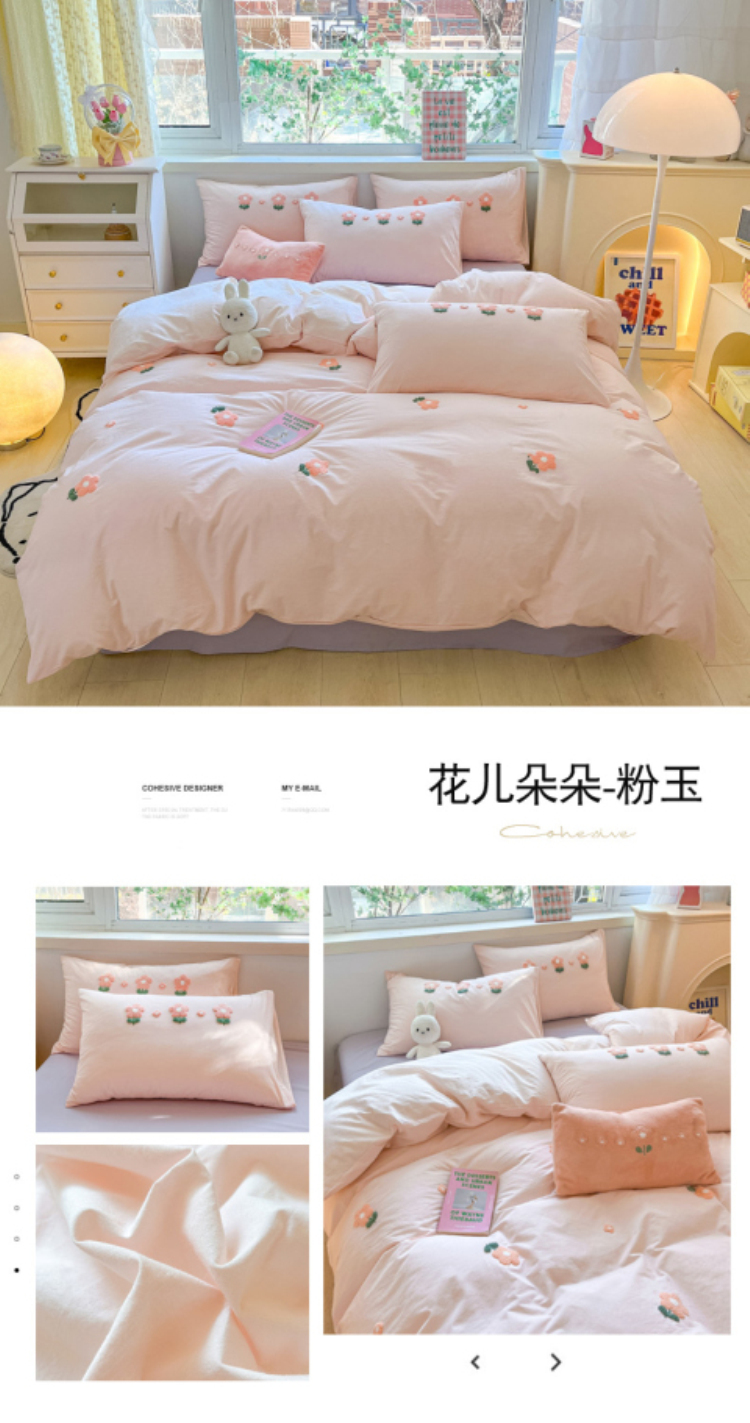 寐居2023新款绣花款水洗棉四件套 花儿朵朵-粉玉