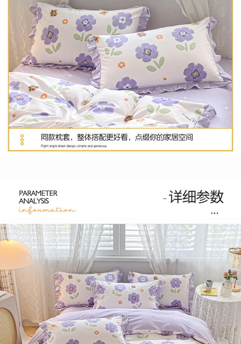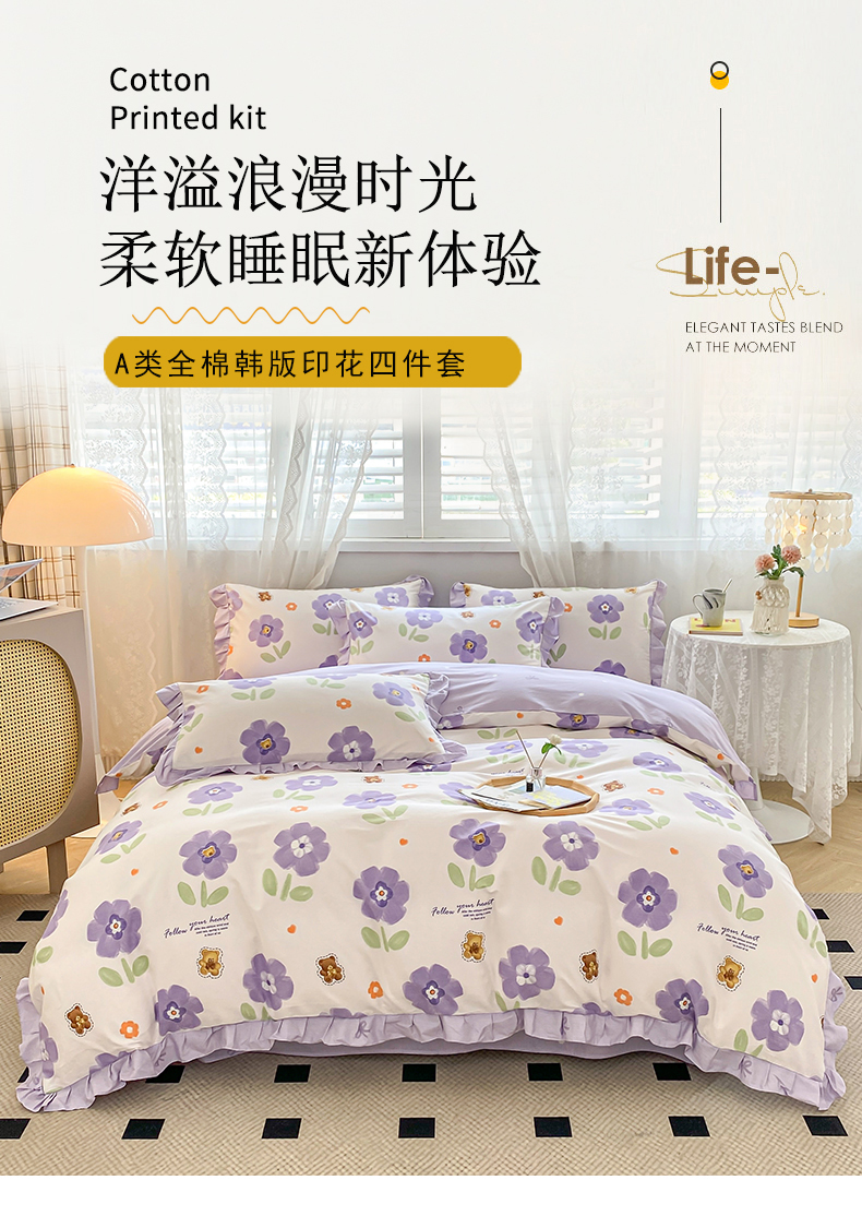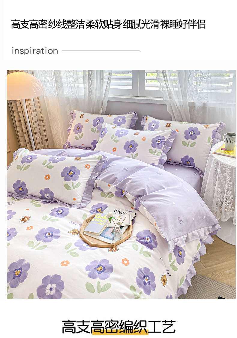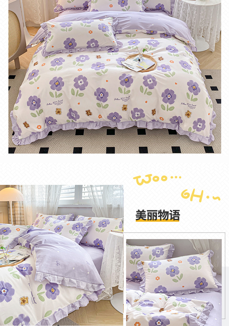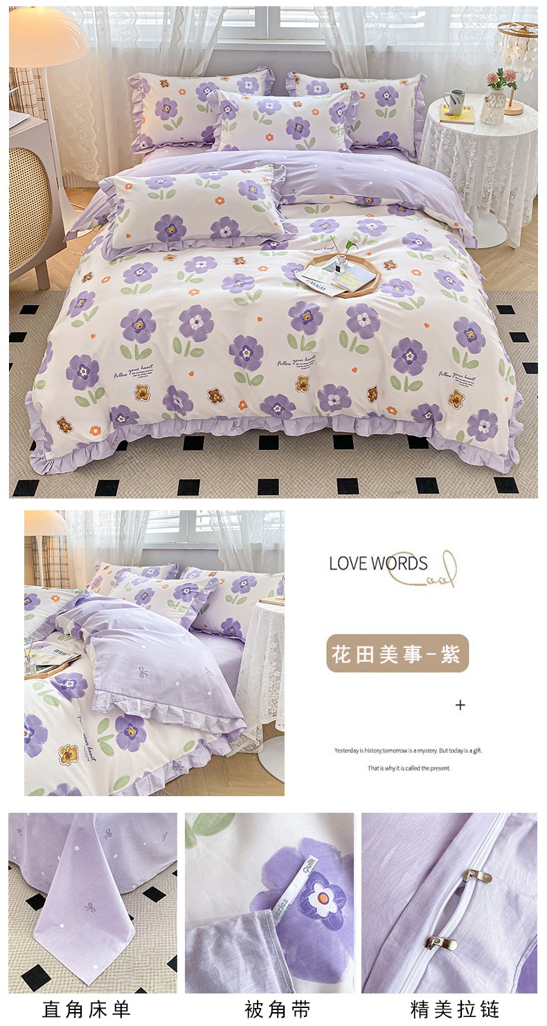 当前位置: 91家纺网 > 商品网购 > 床品套件 > 四件套 > 全棉普通四件套 > 宇彬20223年新款13372全棉韩版刺绣花边和印花花边四件套和单被套 印花花边 花田美事-紫