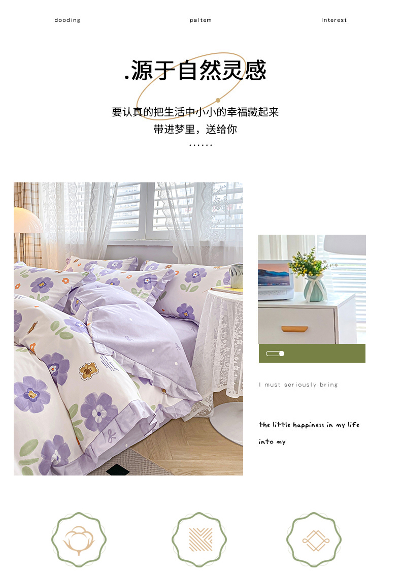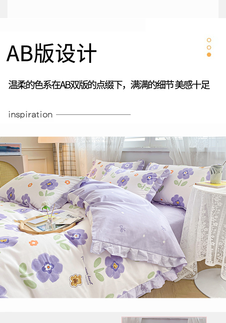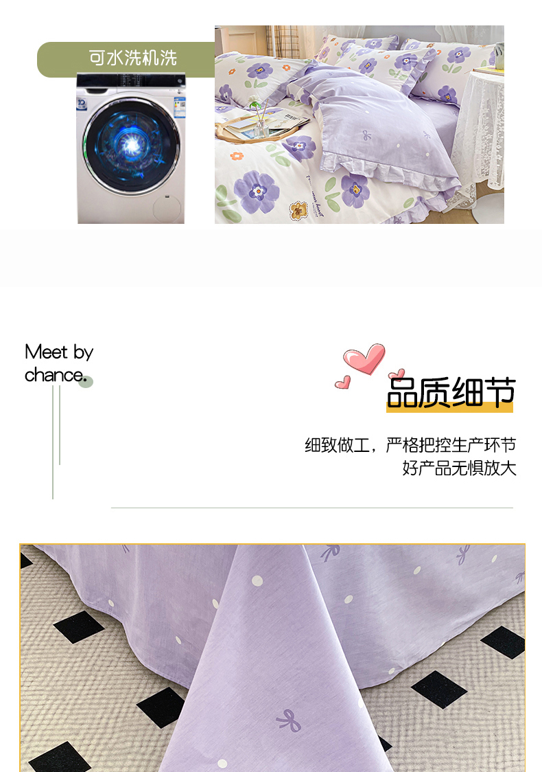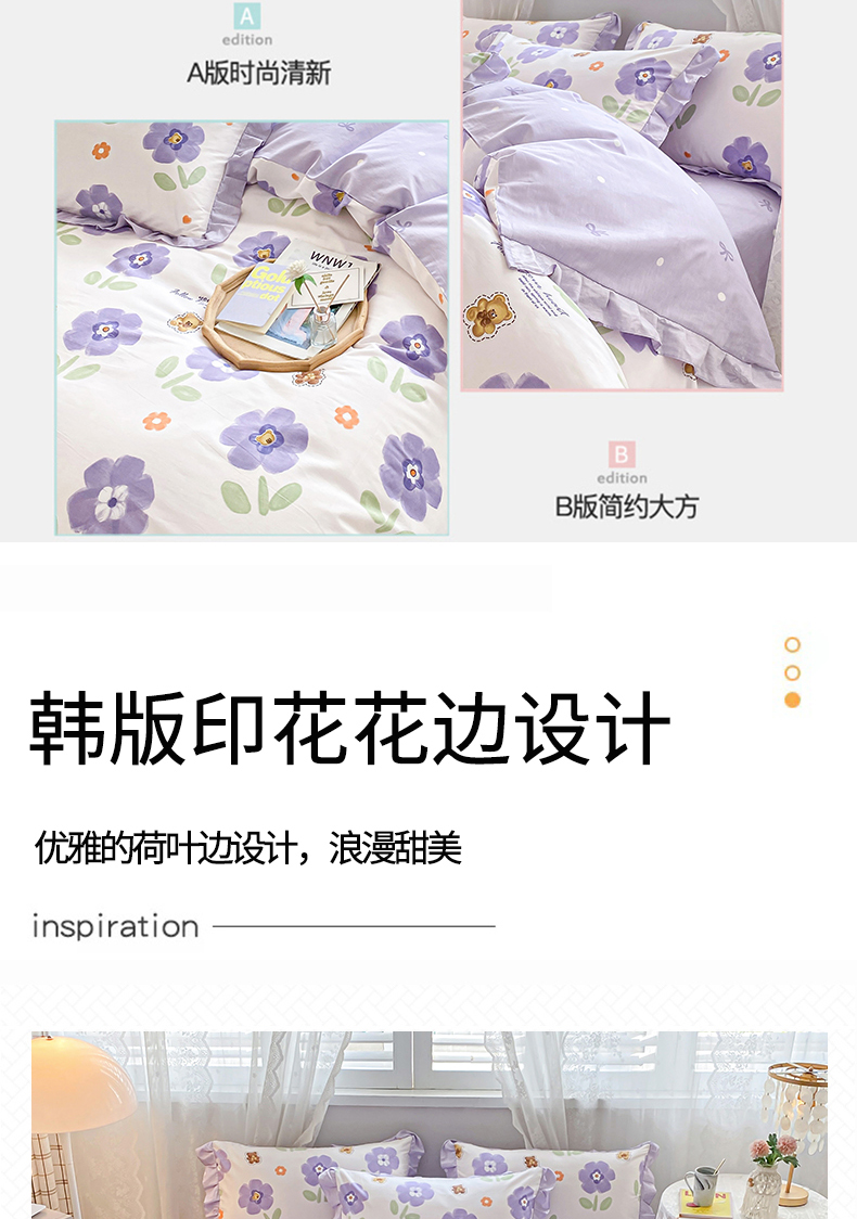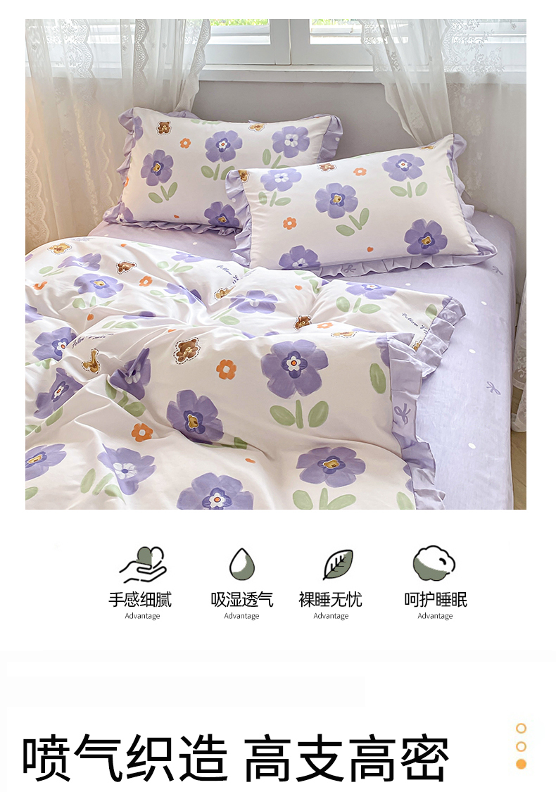 当前位置: 91家纺网 > 商品网购 > 床品套件 > 四件套 > 全棉普通四件套 > 宇彬20223年新款13372全棉韩版刺绣花边和印花花边四件套和单被套 印花花边 花田美事-紫