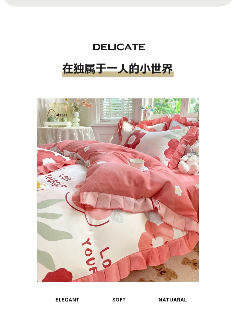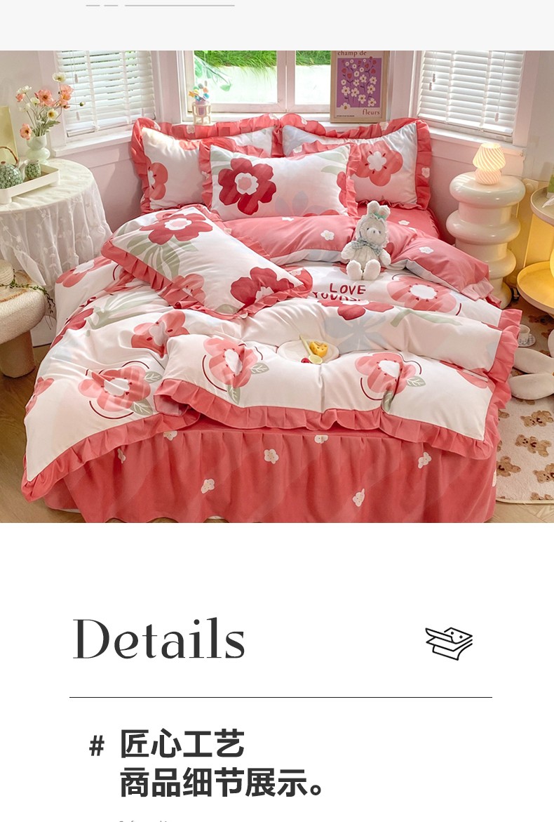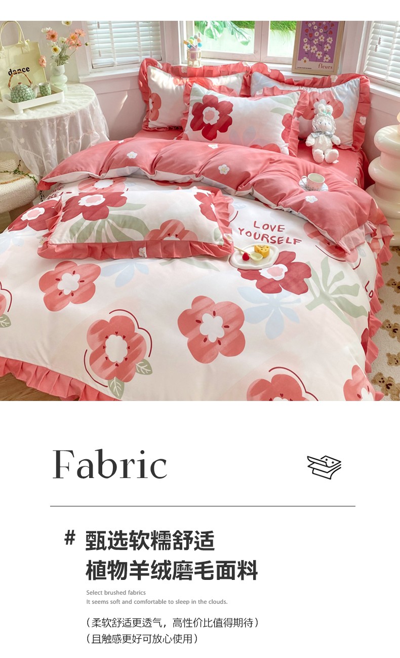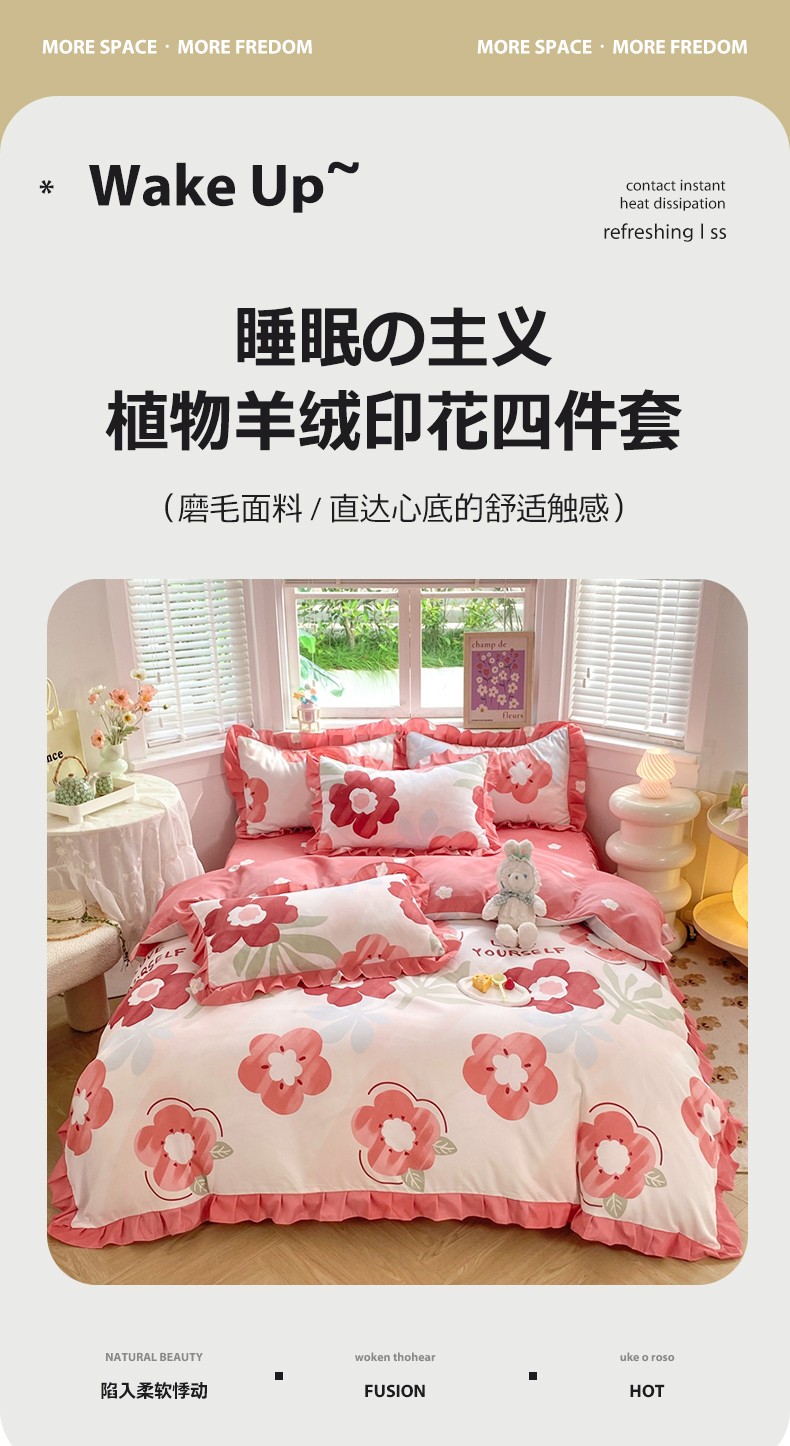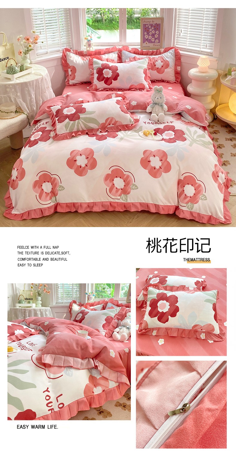 当前位置: 91家纺网 > 商品网购 > 床品套件 > 四件套 > 磨绒四件套 > 秋艳 新款直播电商爆款韩版公主风加厚磨毛植物羊绒床裙四件套 桃花印记