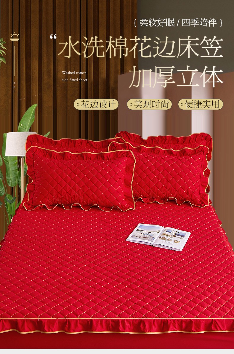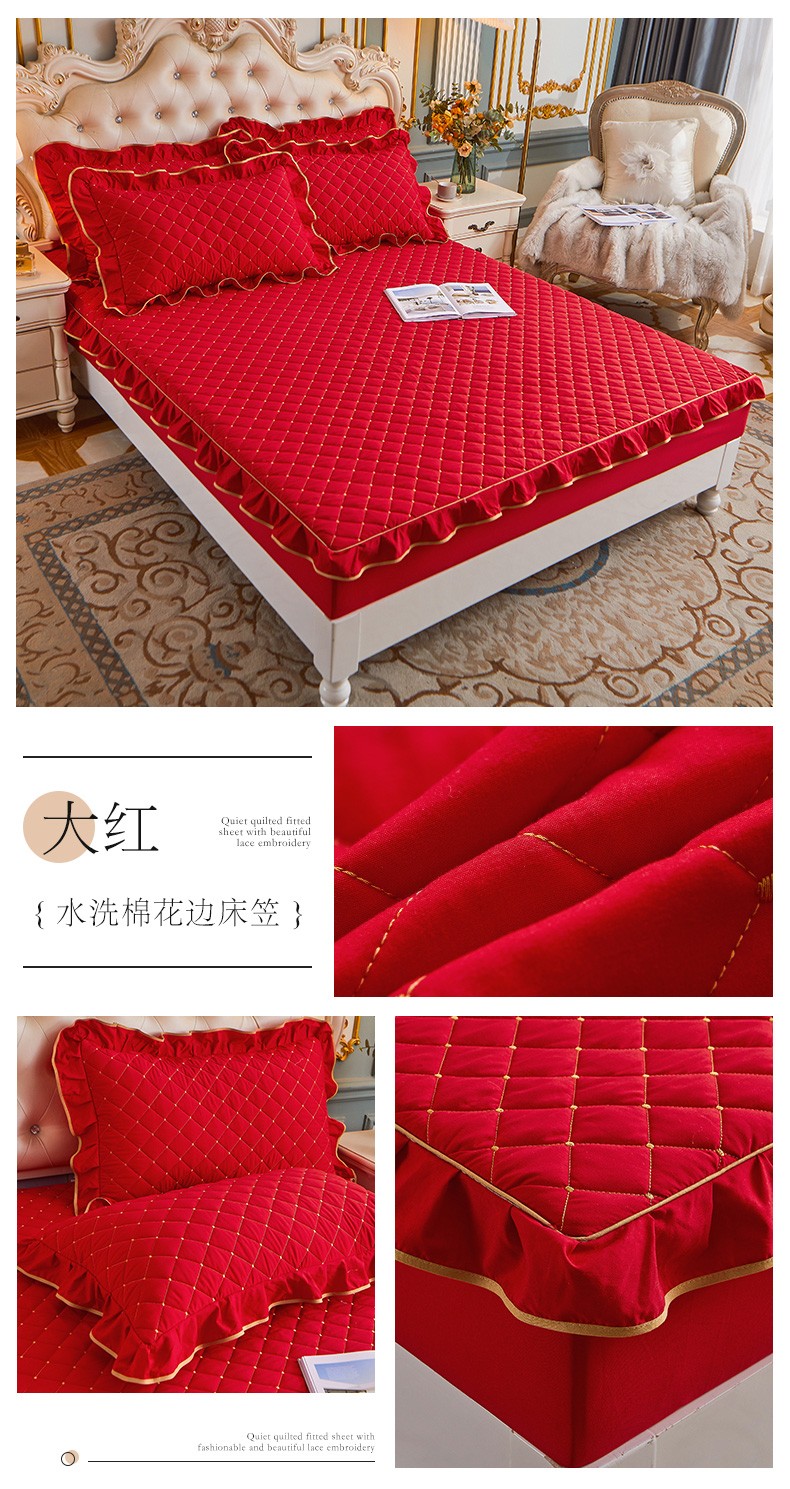 屹成 2024新款水洗棉蕾丝四季款床笠床裙单品套件-床笠三件套 大红