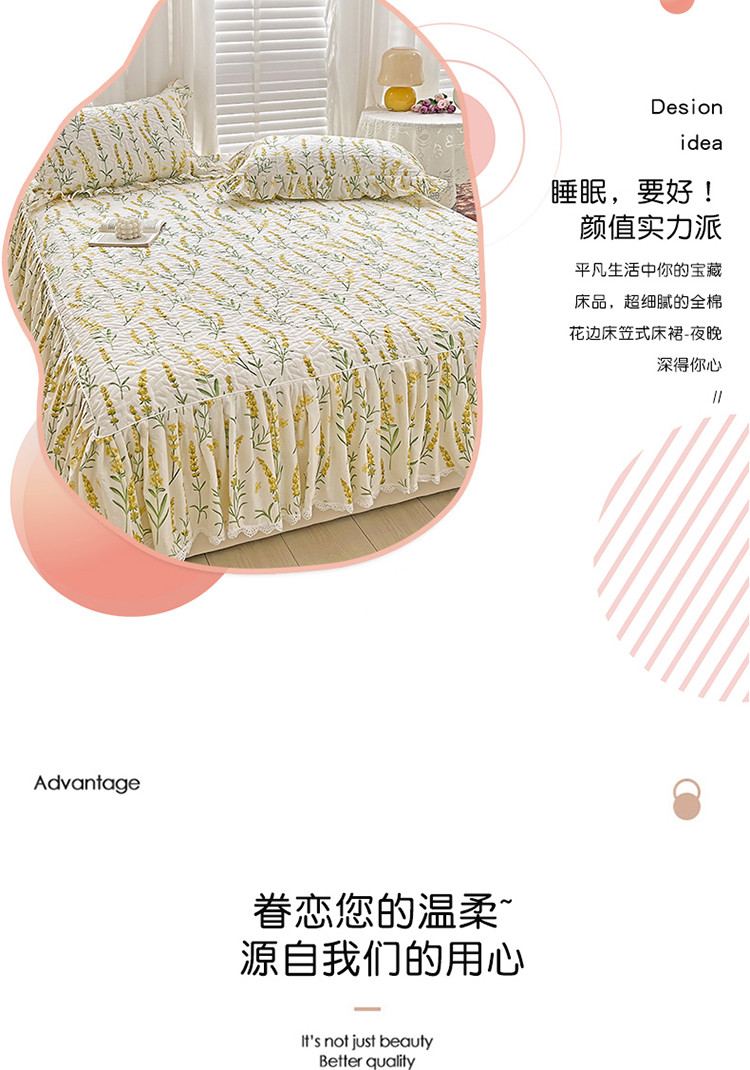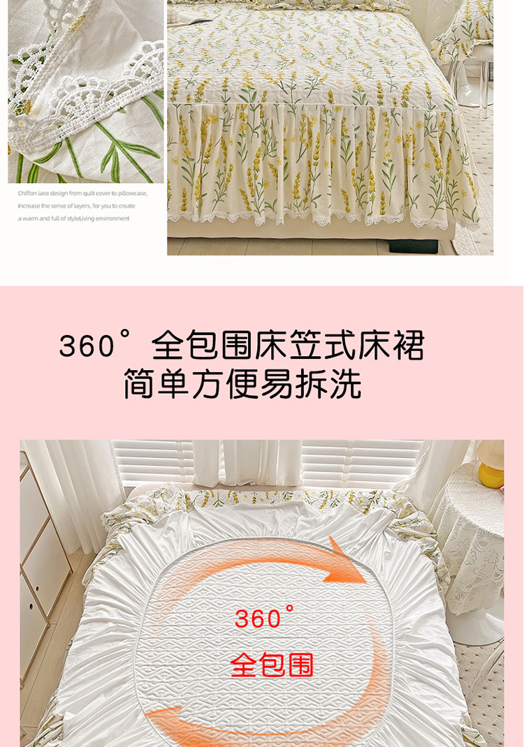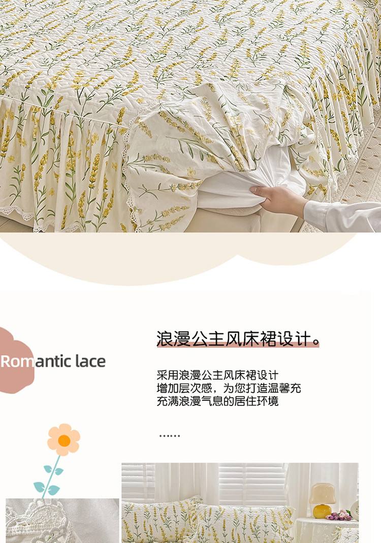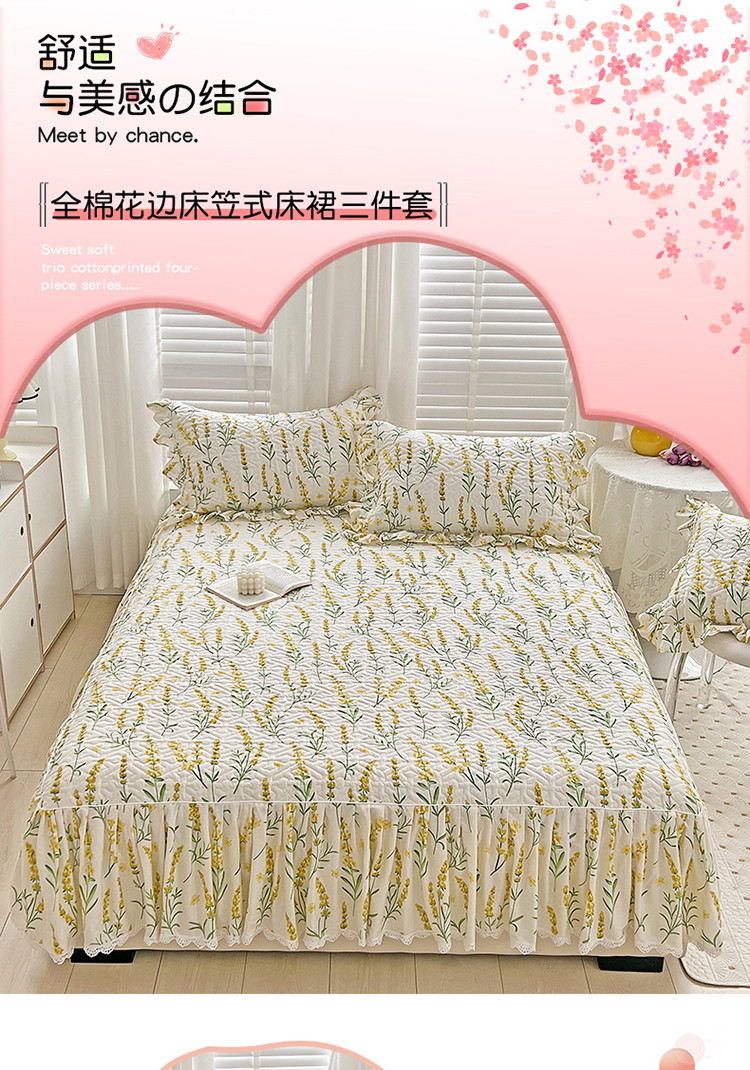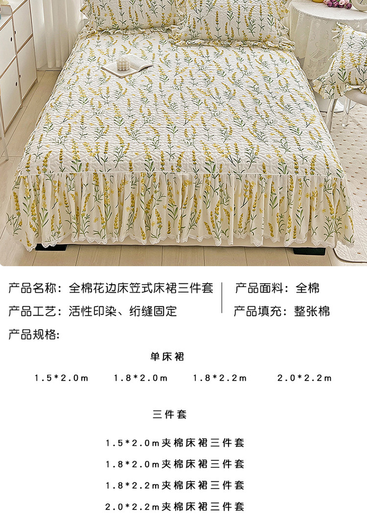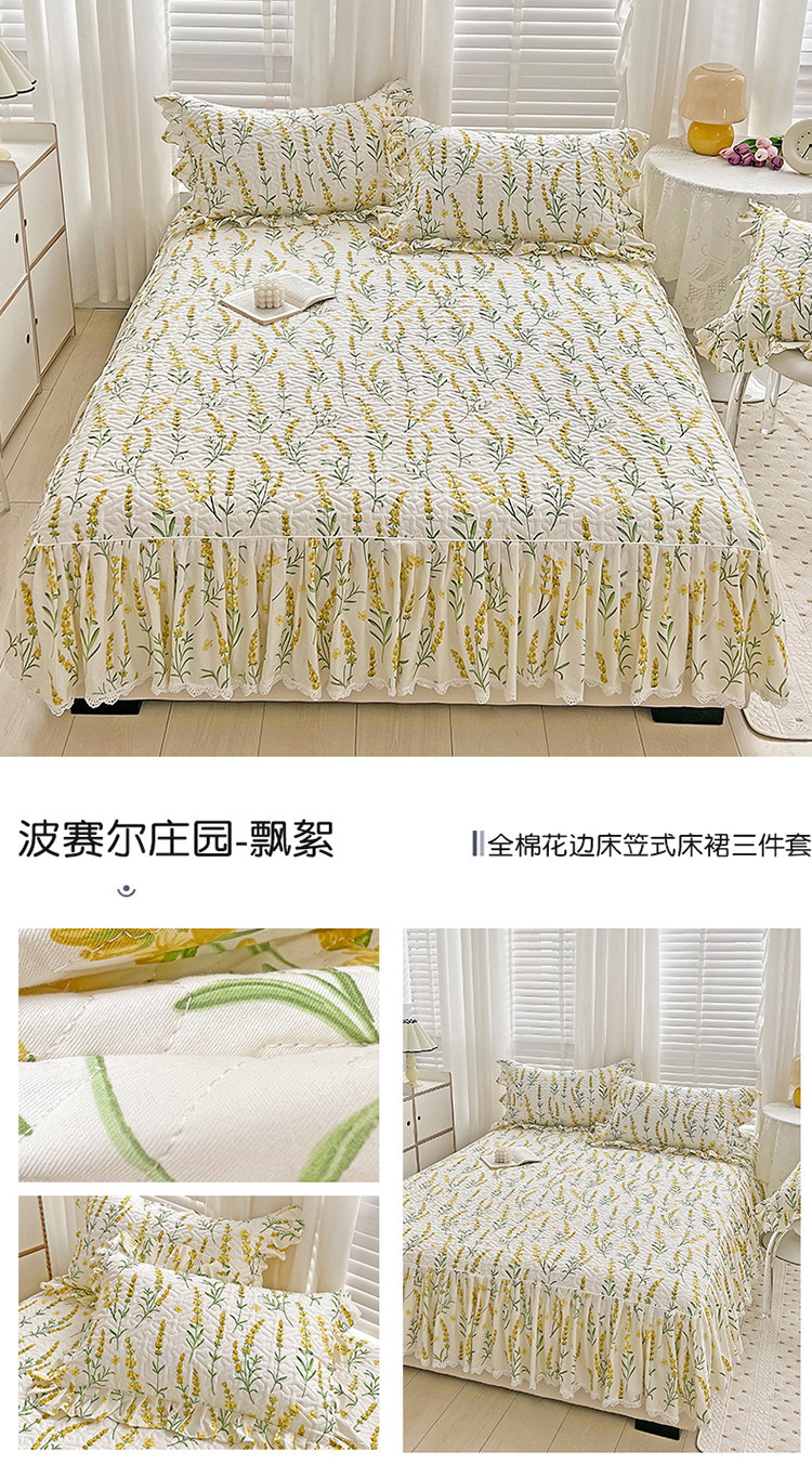 • 91家纺网 家纺一手货源 找家纺 罗艺轩 2024新款全棉花边床笠式夹棉床裙三件套波赛尔庄园-飘絮