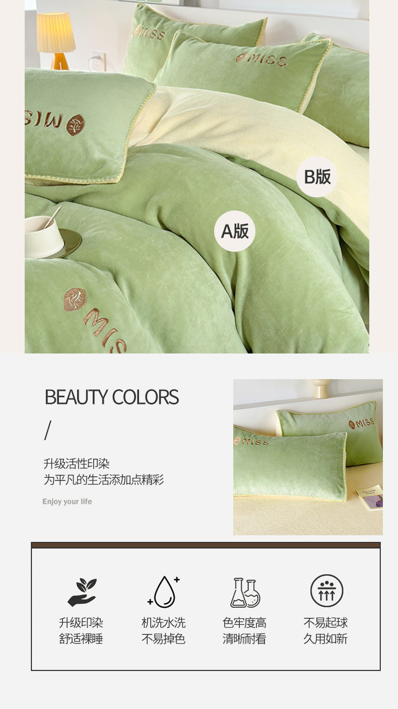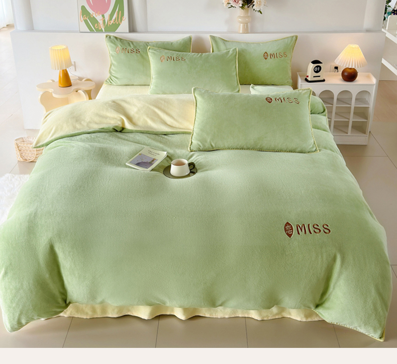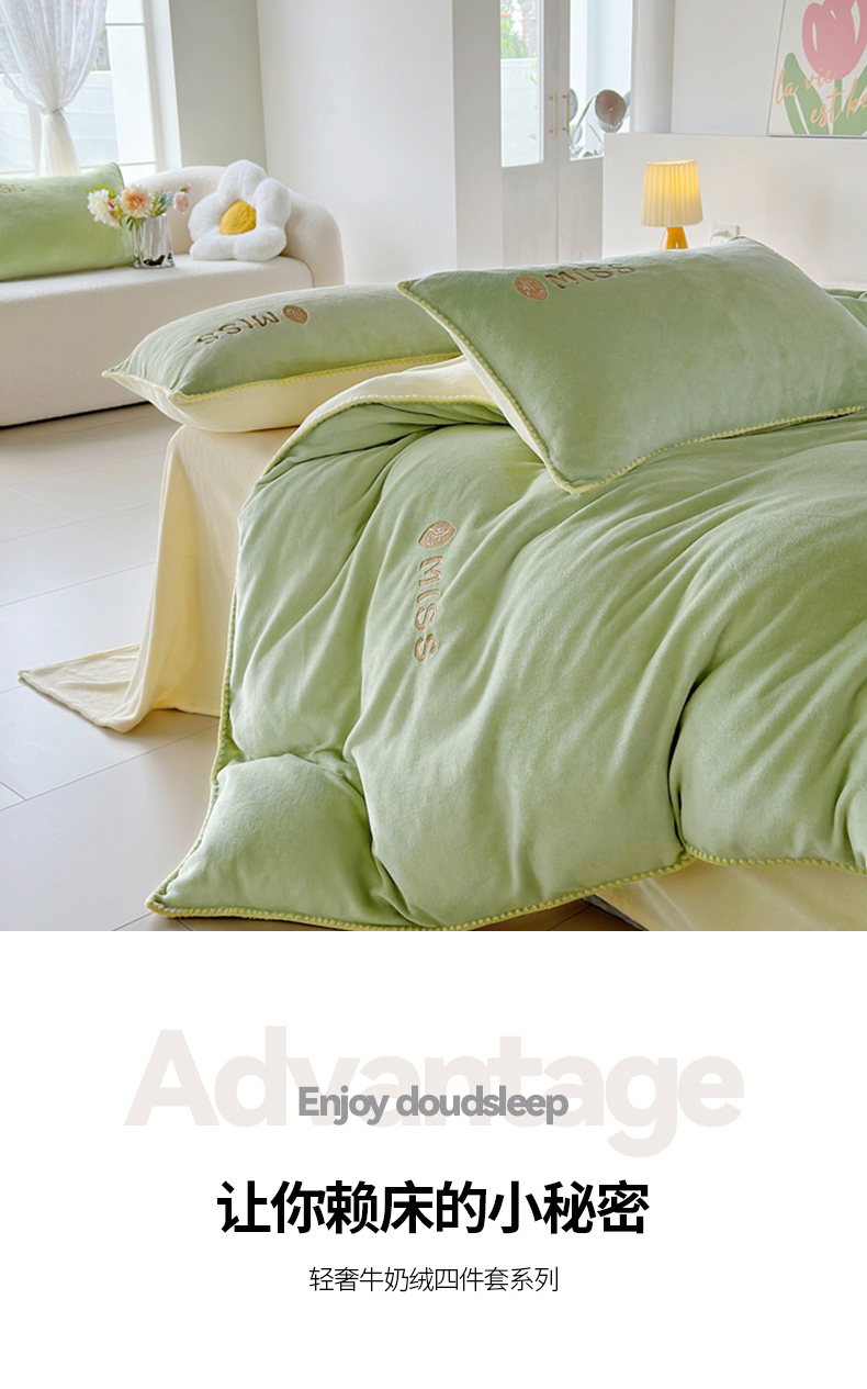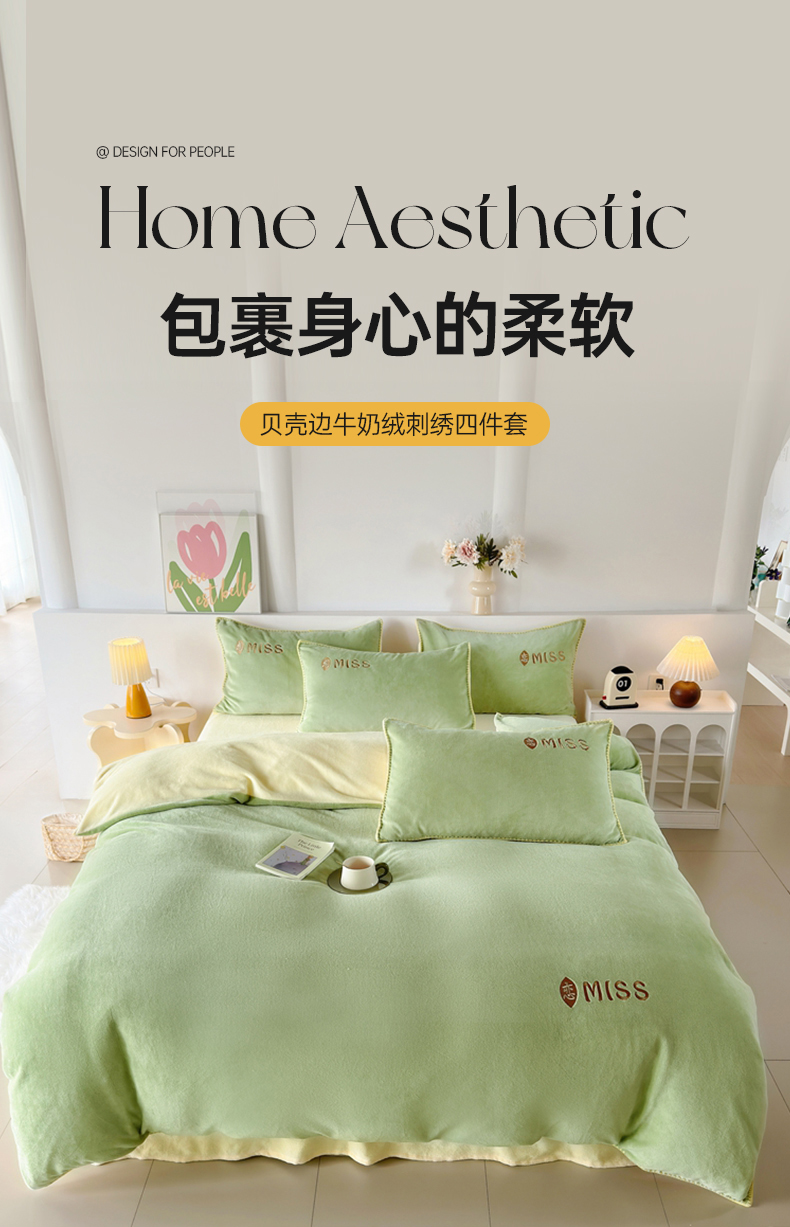 当前位置: 91家纺网 > 商品网购 > 床品套件 > 四件套 > 牛奶绒四件套 > 眷恋 2024新款贝壳边牛奶绒刺绣四件套 恋-云川绿+米黄