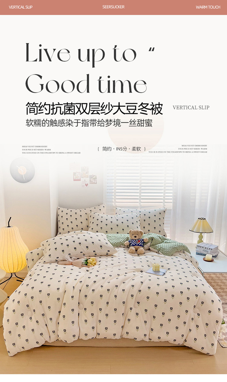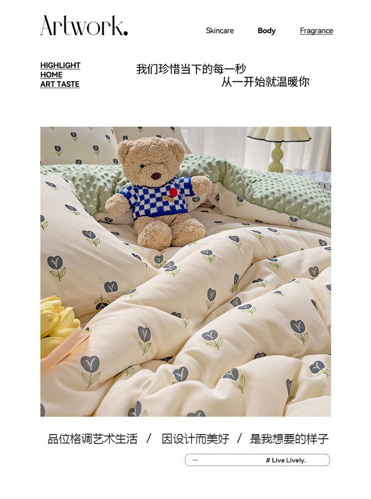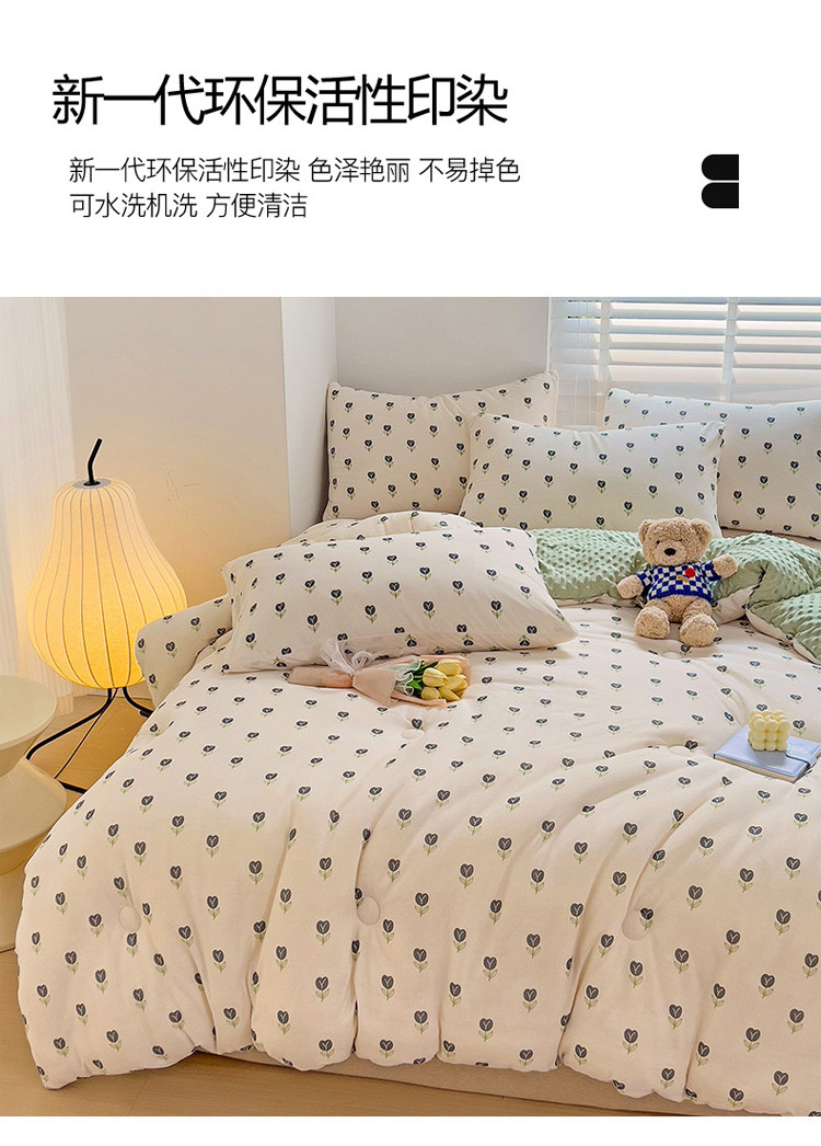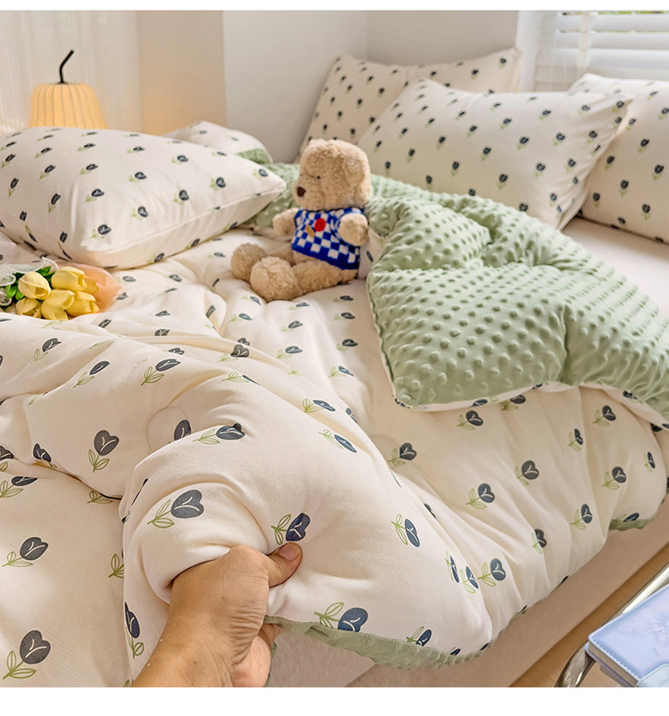 • 91家纺网 家纺一手货源 找家纺 寐居 2023新款水洗双层纱+豆豆绒 A类大豆抗菌被花梦