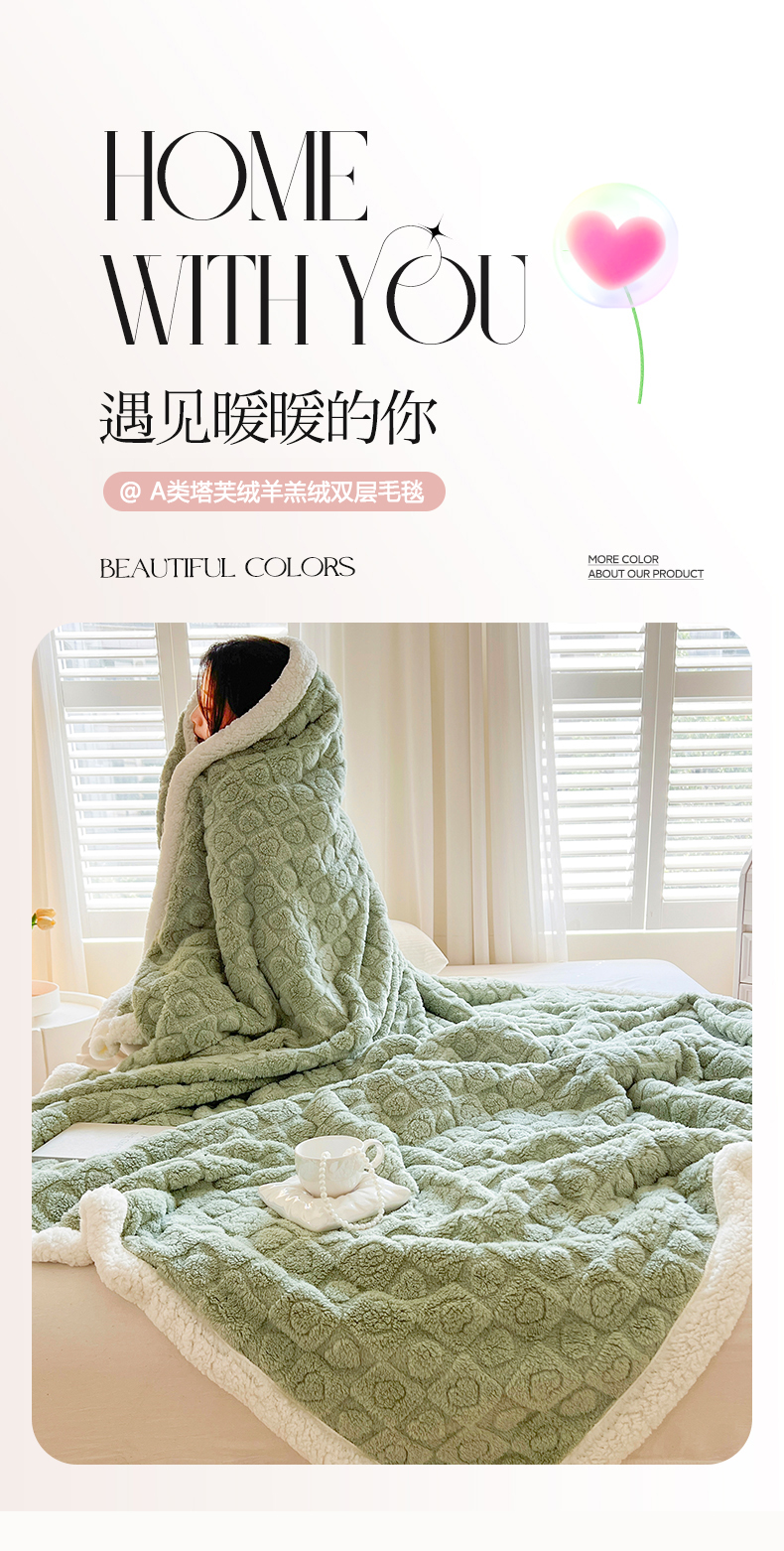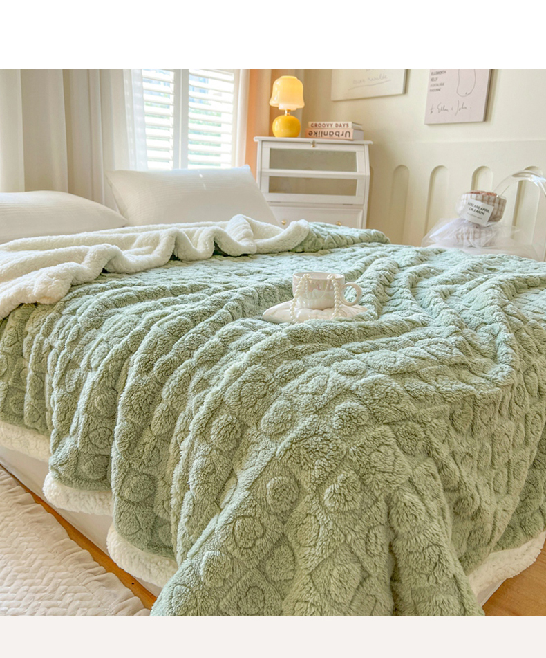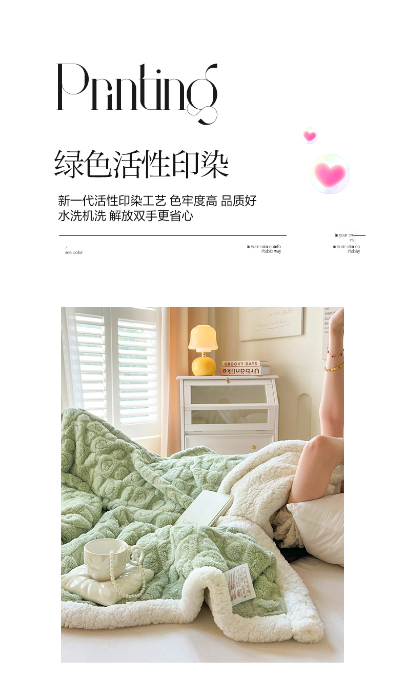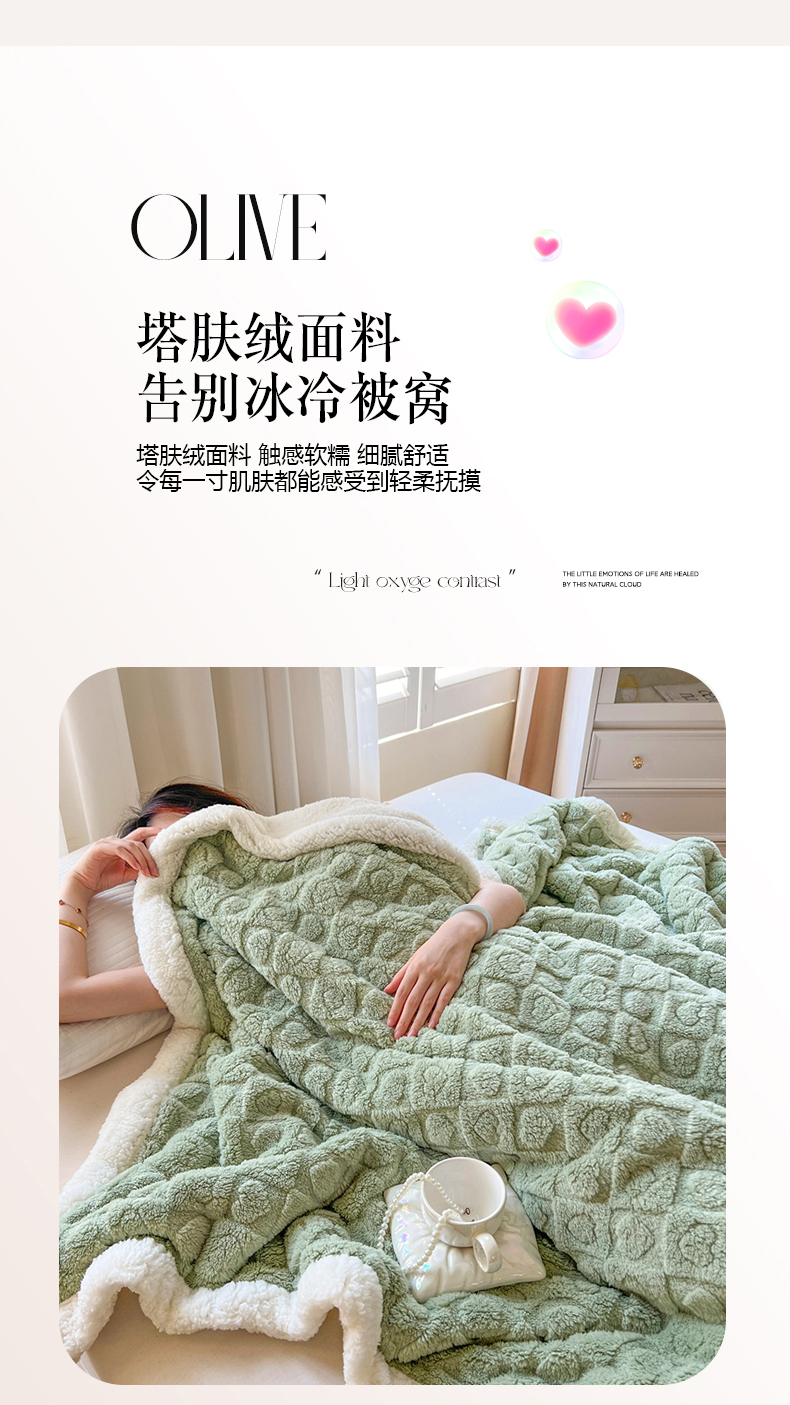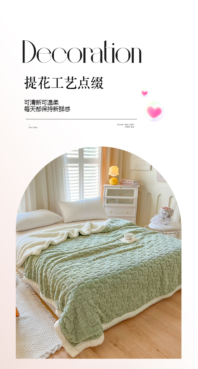 欧邦 新款提花爱心款塔芙绒羊羔绒双层毛毯 果绿