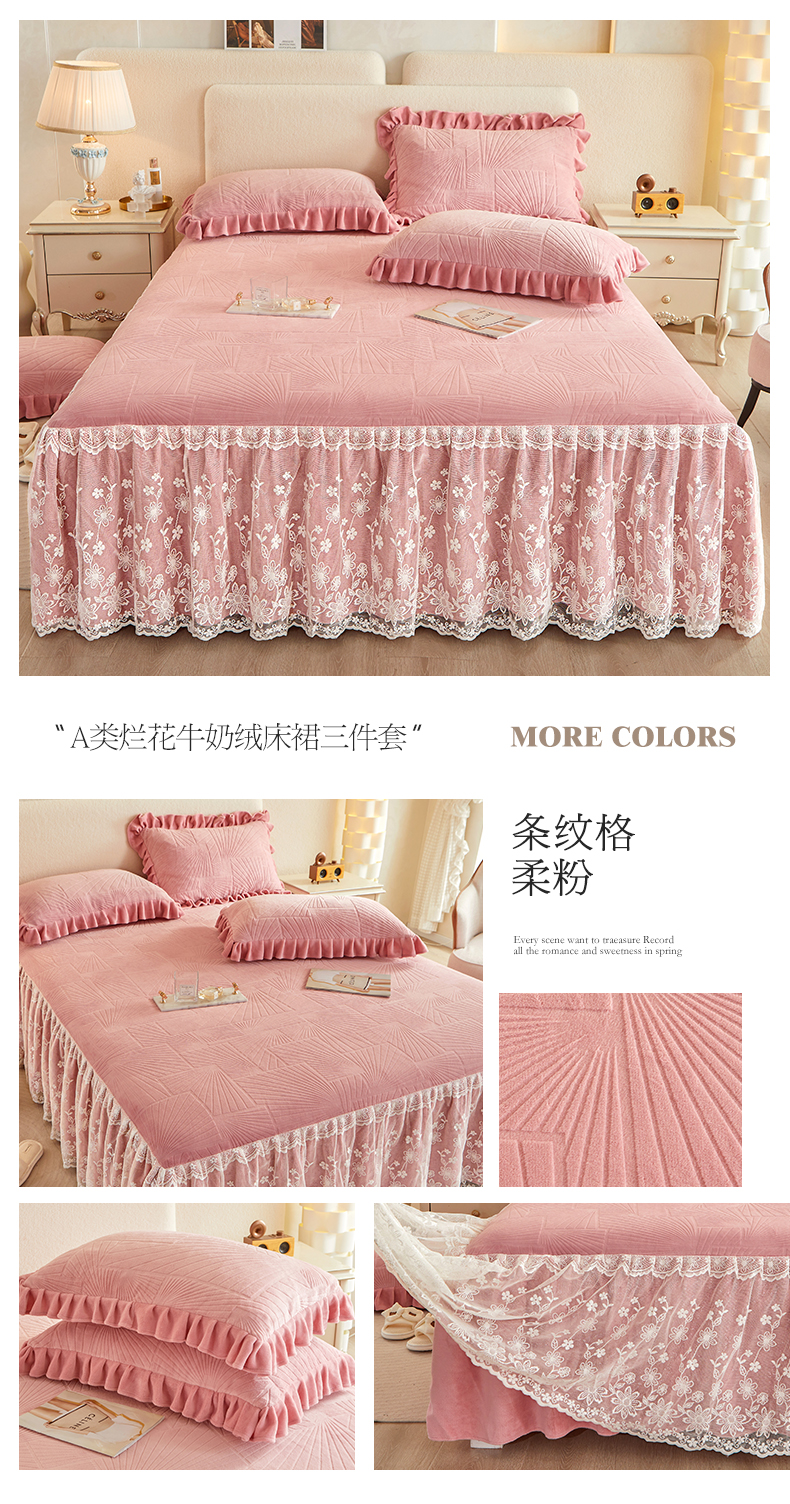 商品名称:宜凡 2023新款烂花牛奶绒床裙三件套 条纹格-柔粉