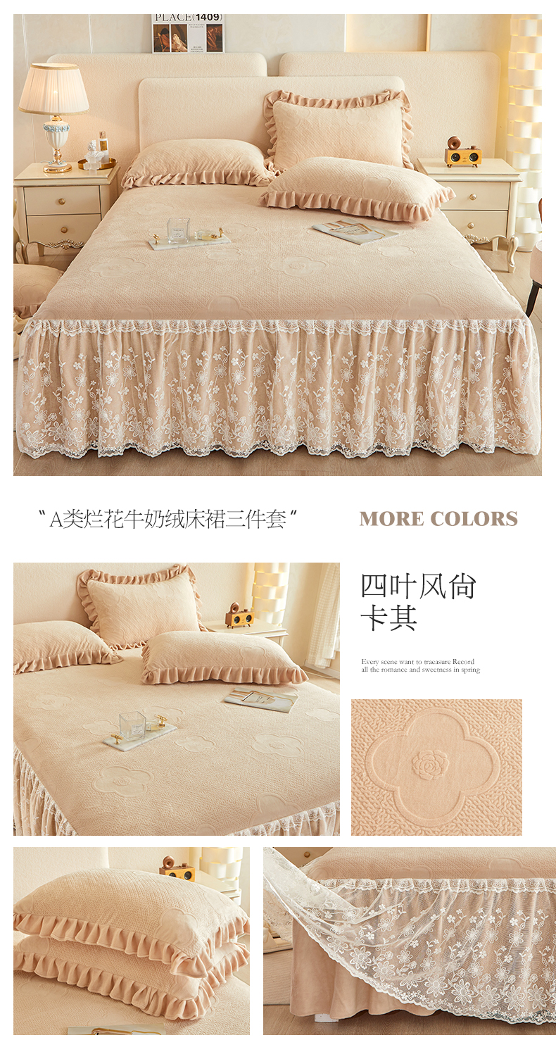 商品名称:宜凡 2023新款烂花牛奶绒床裙三件套 四叶风尚-卡其