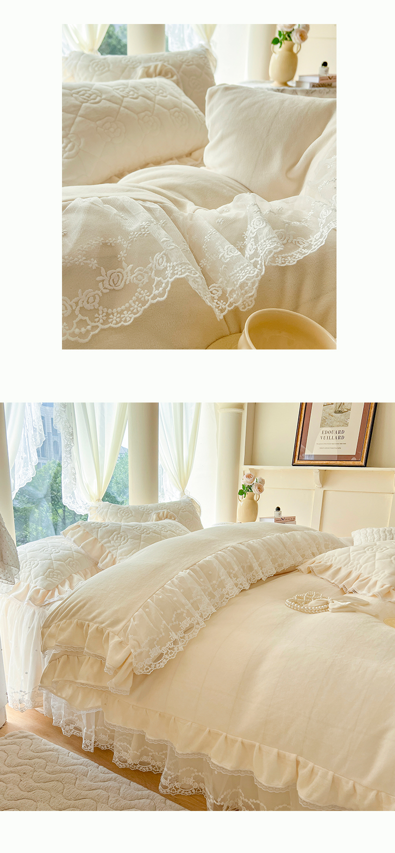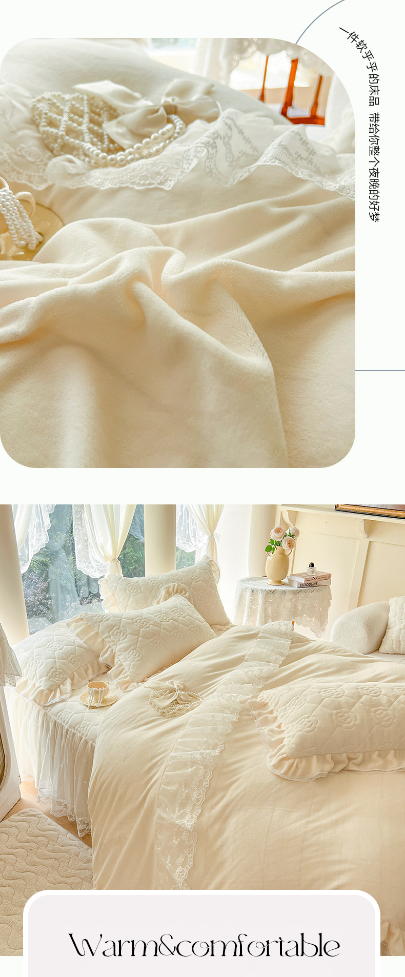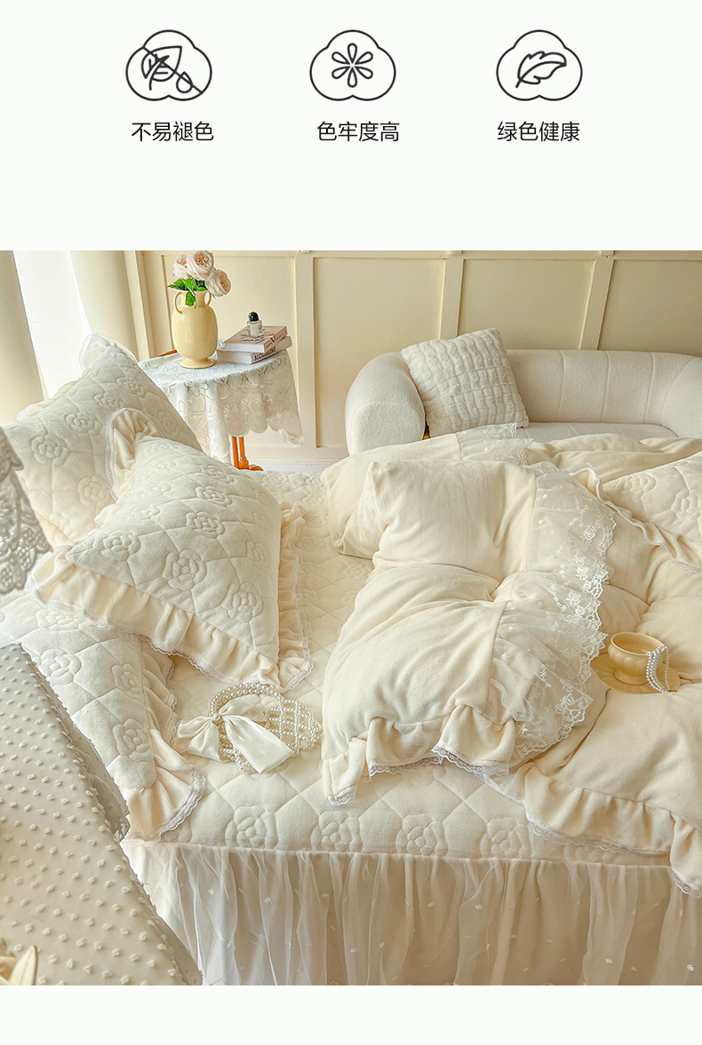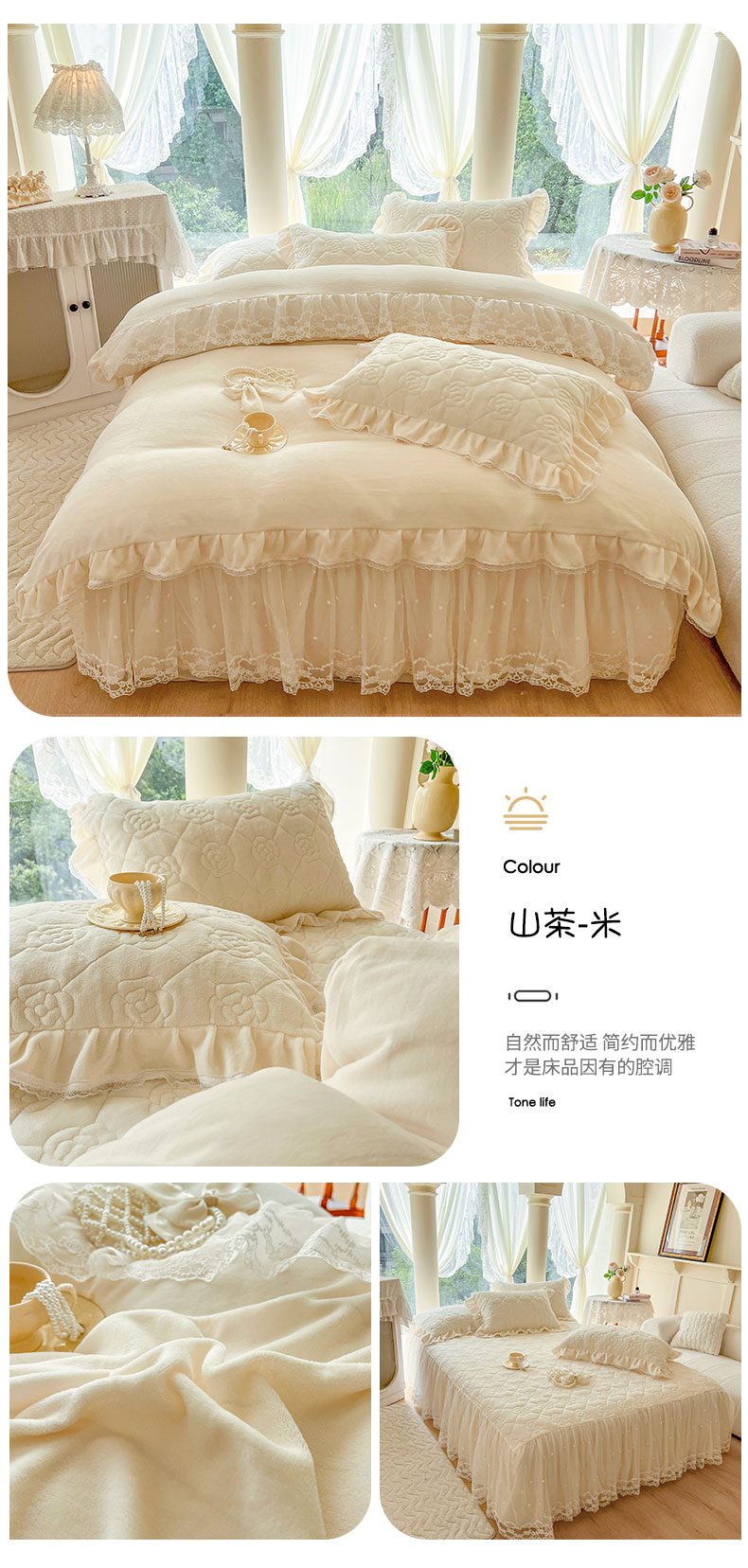 当前位置: 91家纺网 > 商品网购 > 床品套件 > 四件套 > 牛奶绒四件套 > 网红馆 2025新款高克重牛奶绒花边床裙四件套-山茶系列 山茶-米