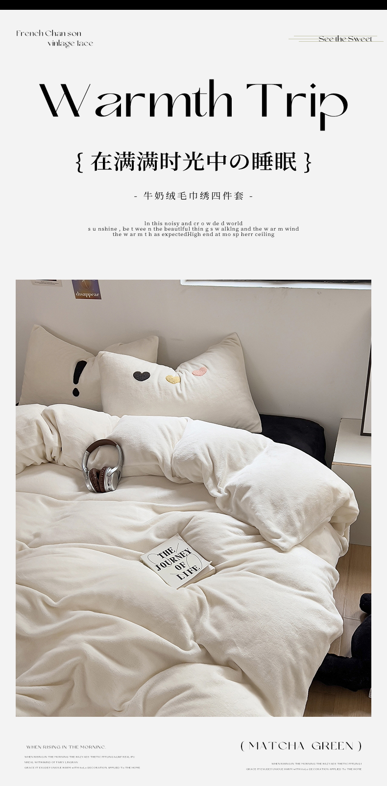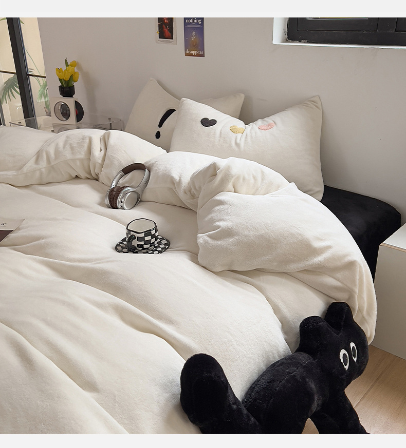 山茶家纺 2023新款黑色系毛巾绣纯色牛奶绒四件套 黑色系-白黑