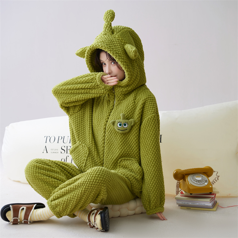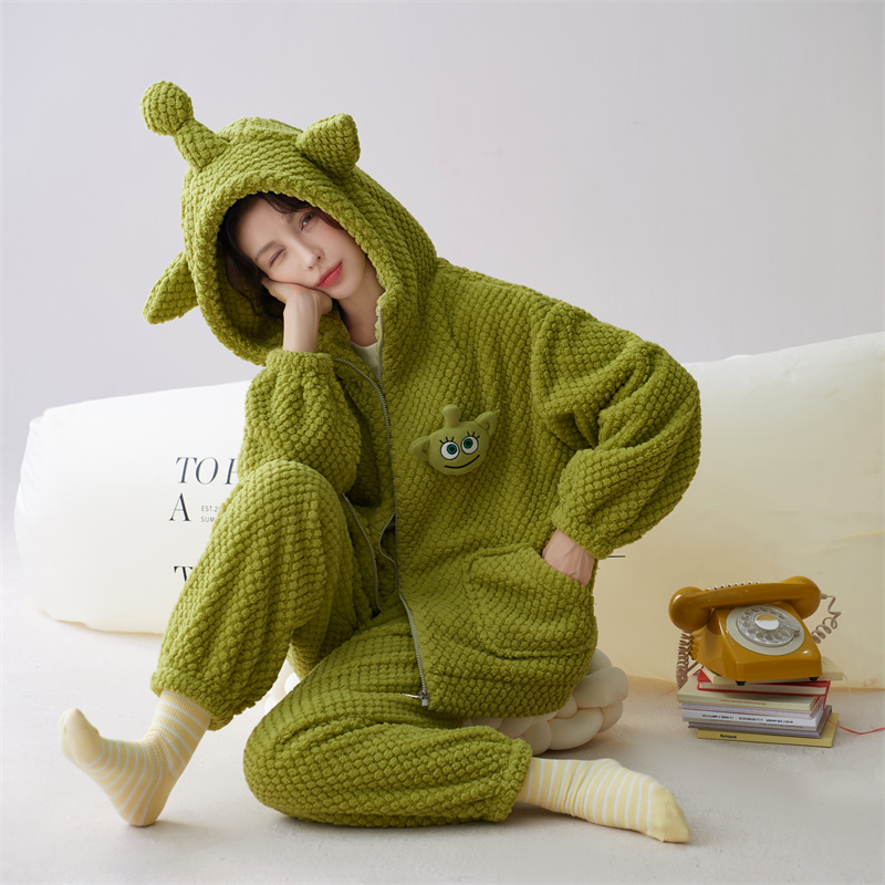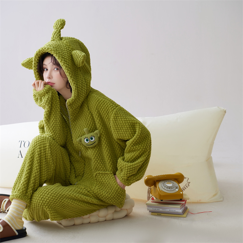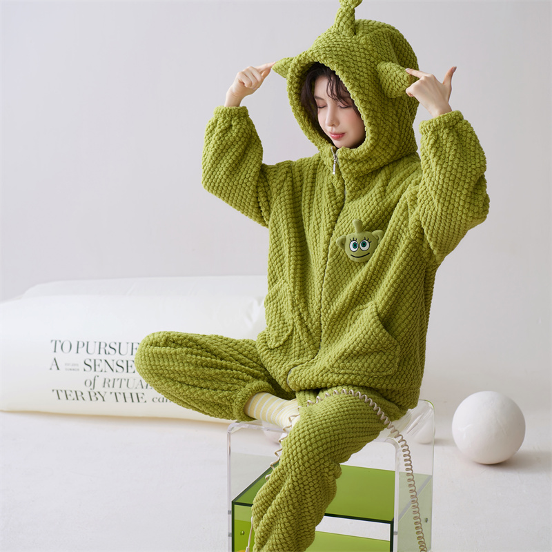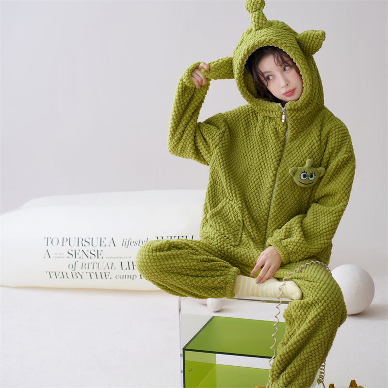 (总)洛兰沙家居馆 2024新款秋冬季三层夹棉加厚加绒睡衣女士法兰绒套装珊瑚绒家居服,粉色,黄色,白色,绿色