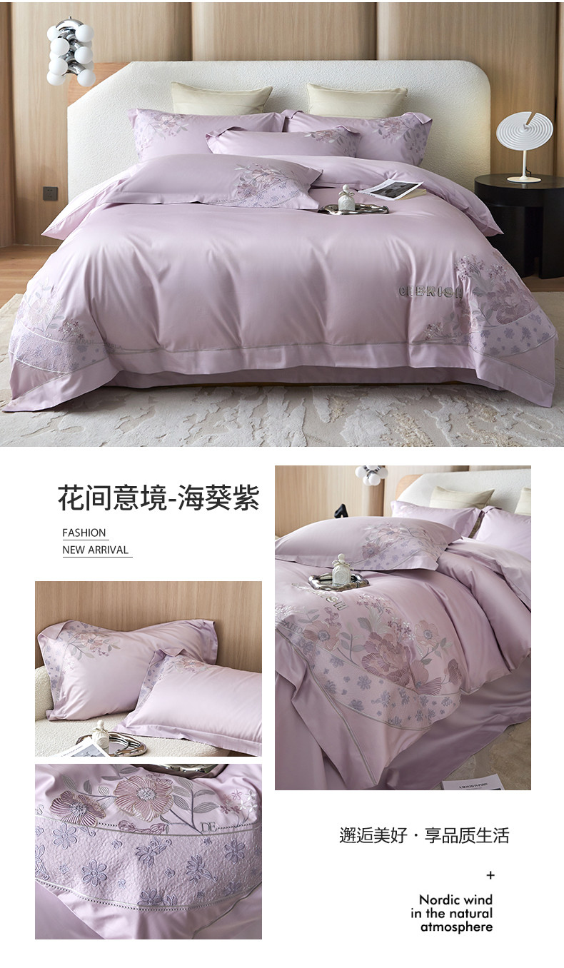 商品名称:宏羽纺 2023新款高支高密全棉绣花四件套--花间意境 海葵紫