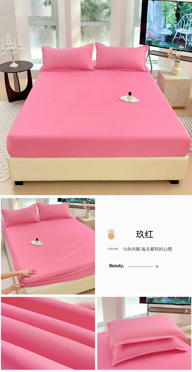 • 91家纺网 家纺一手货源 找家纺  楠沐家纺 2025新款纯色亲肤芦荟棉水洗棉床笠 玖红