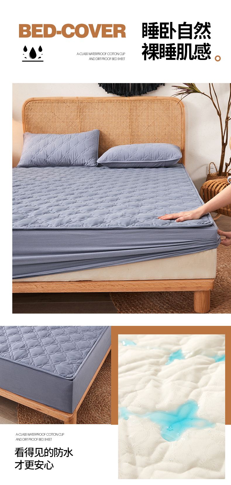 3C 2024新款抗菌防螨透气防水夹棉床笠 蓝灰色