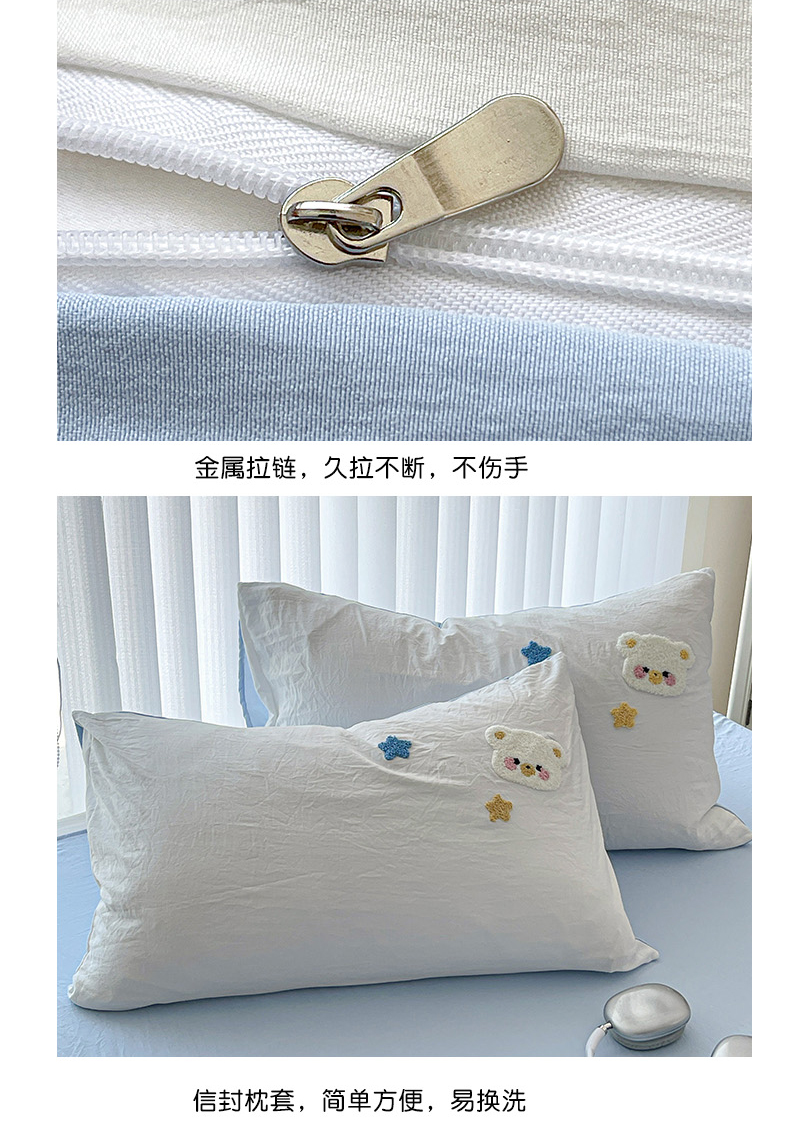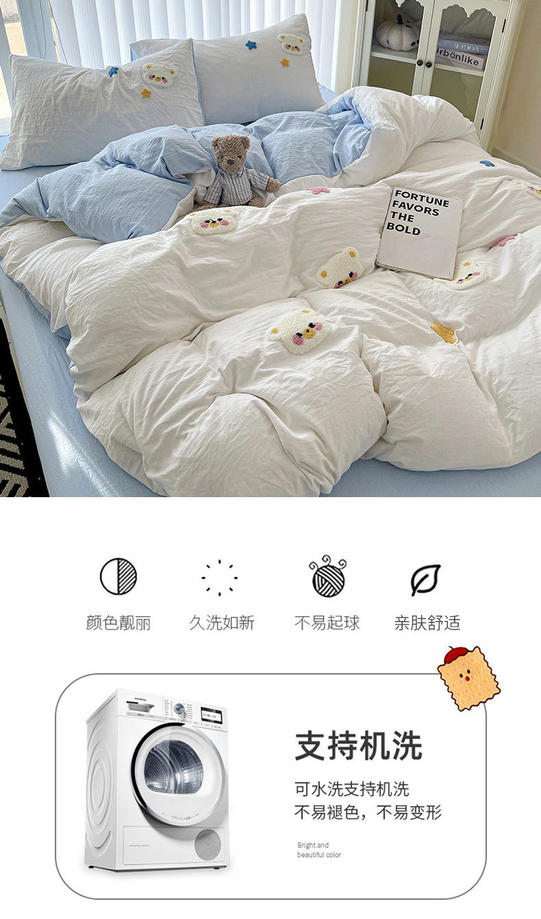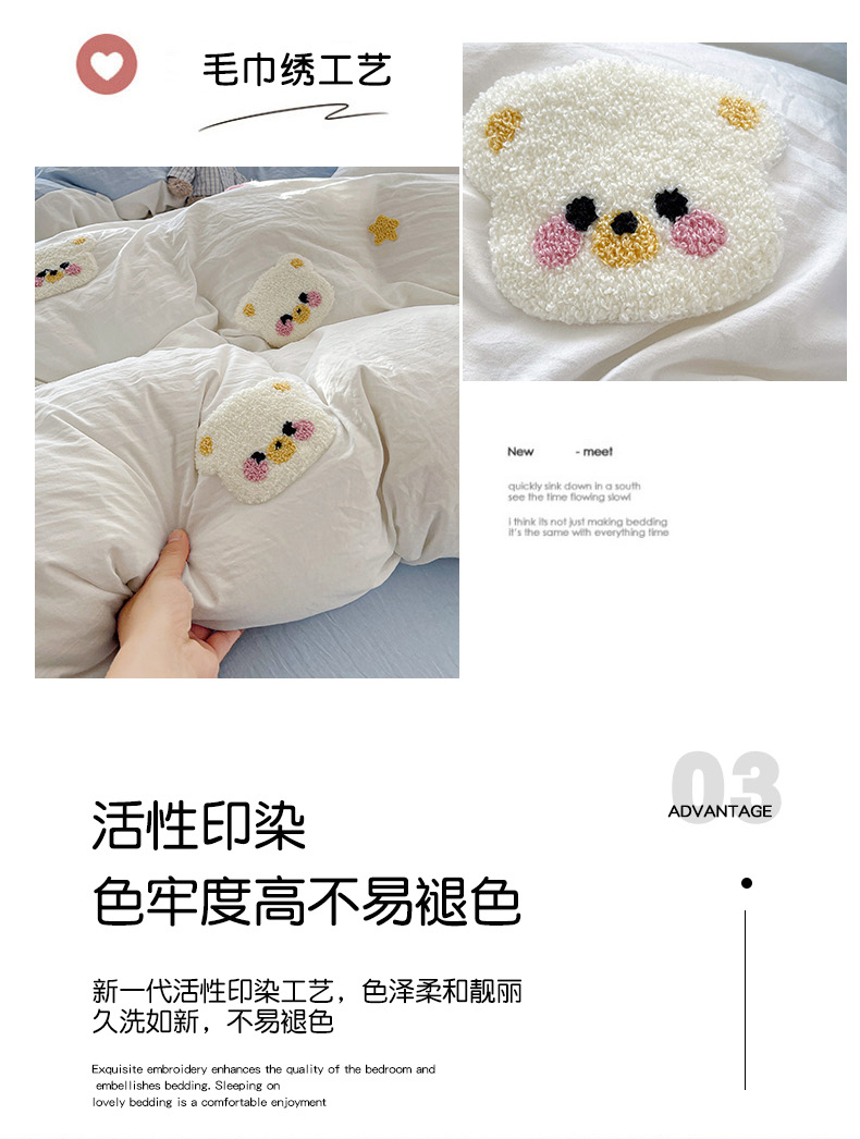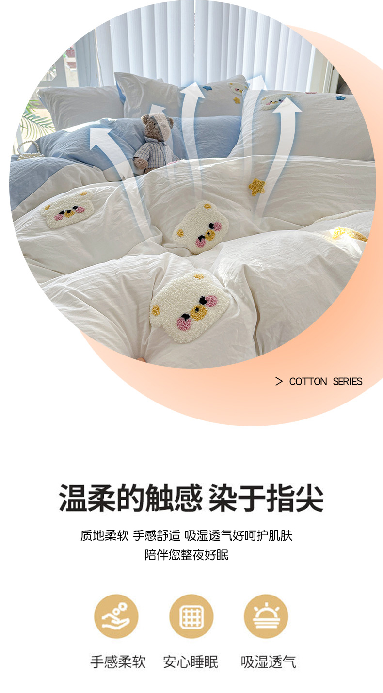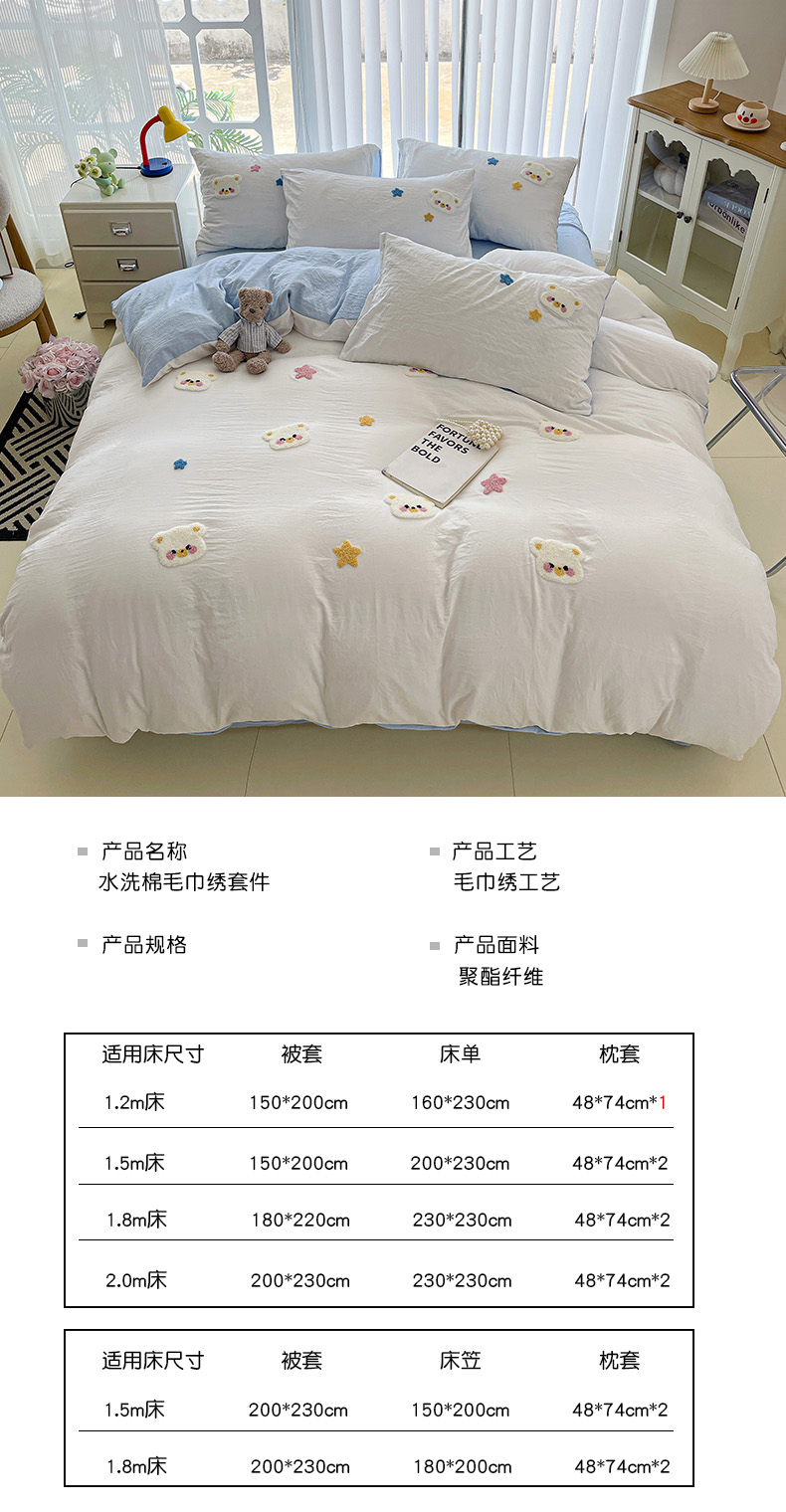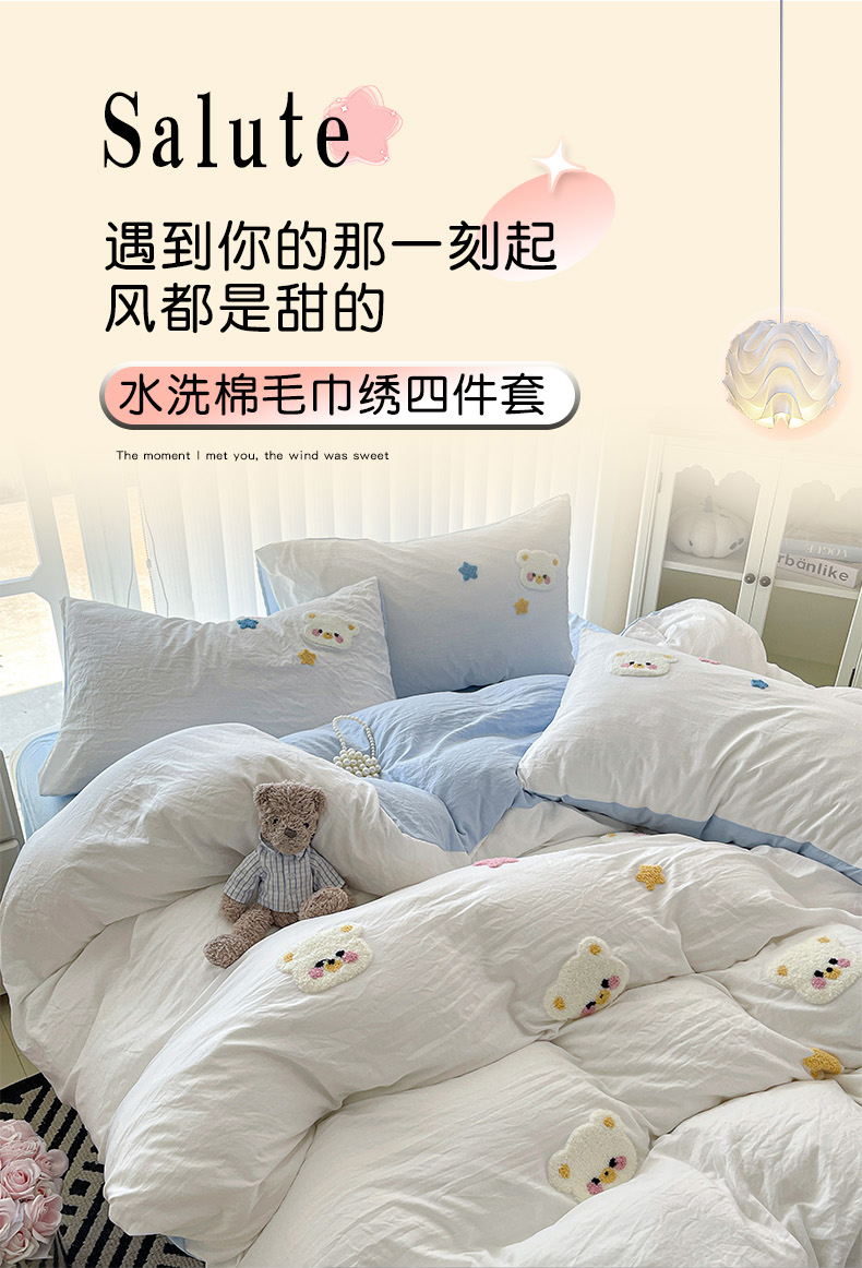 当前位置: 91家纺网 > 商品网购 > 床品套件 > 四件套 > 全棉普通四件套 > 韩巢家纺 2024新款四季通用超柔水洗棉毛巾绣四件套-幸运熊系列(提供精美卖家秀) 幸运熊白蓝