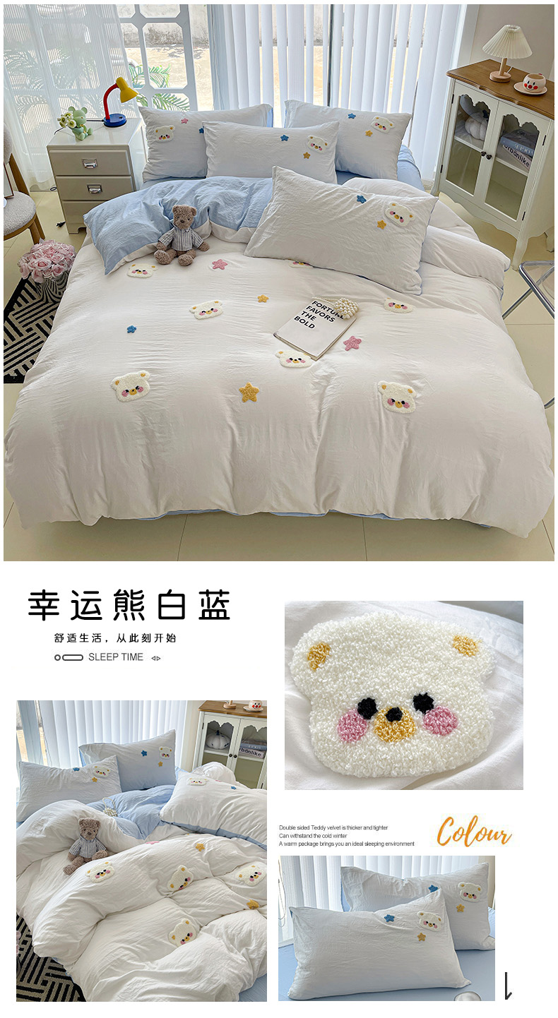 商品名称:韩巢家纺 2024新款超柔水洗棉毛巾绣单件被套-幸运熊系列(提供精美卖家秀 ) 幸运熊白蓝