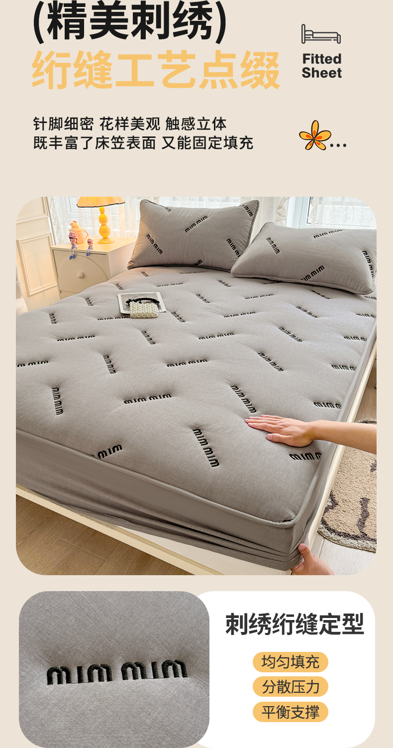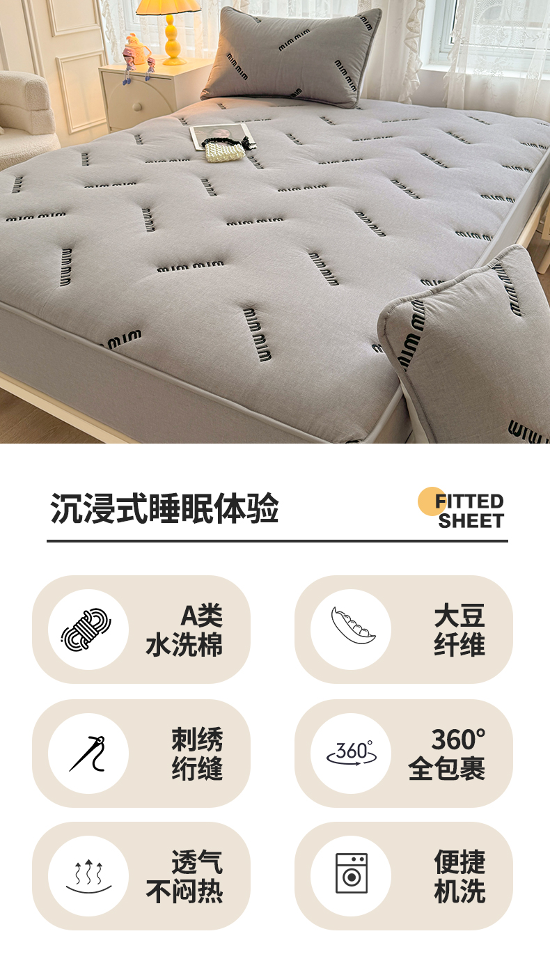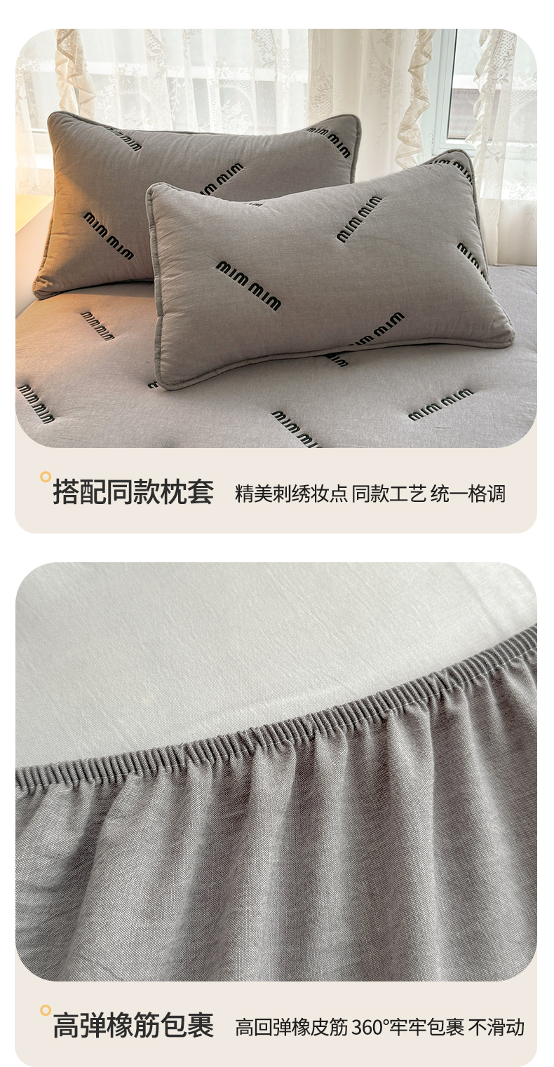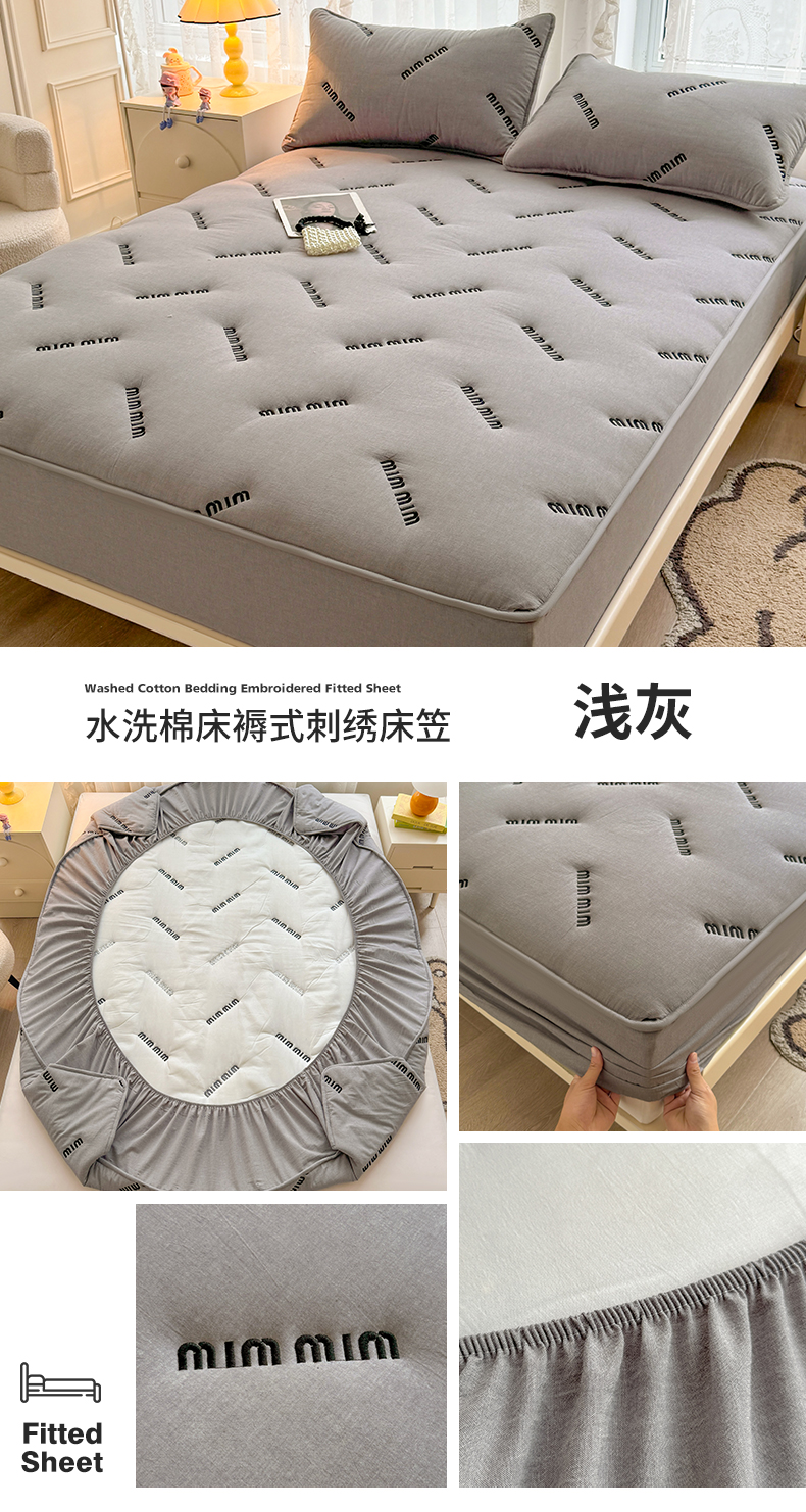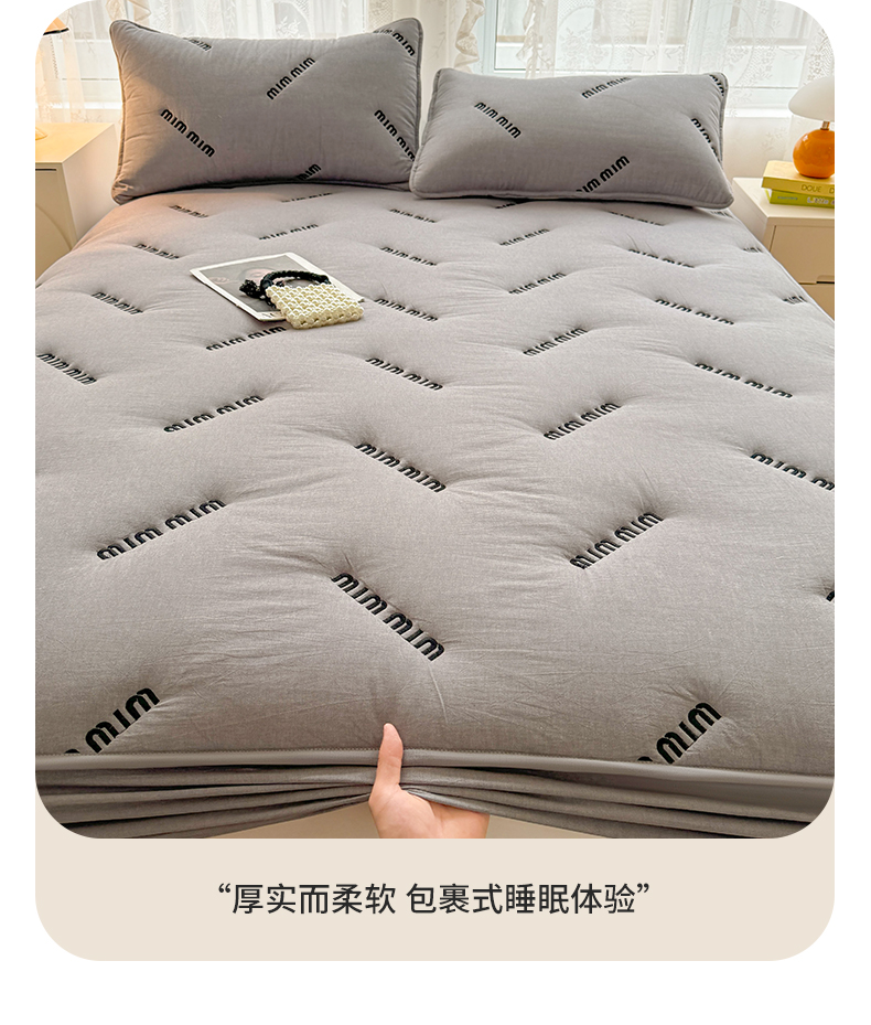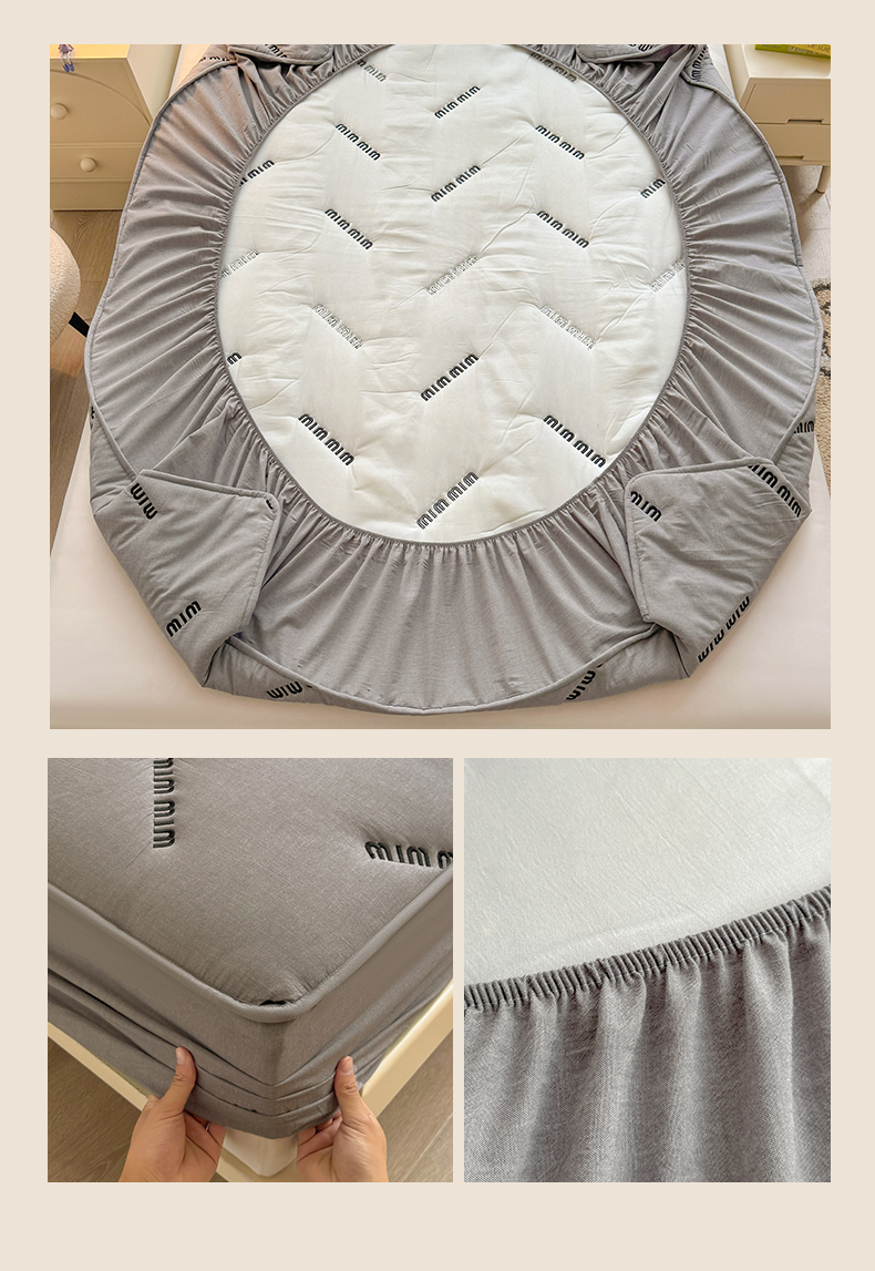 予梦家纺 2024新款ins风刺绣夹棉床笠床垫保护套 字母-浅灰