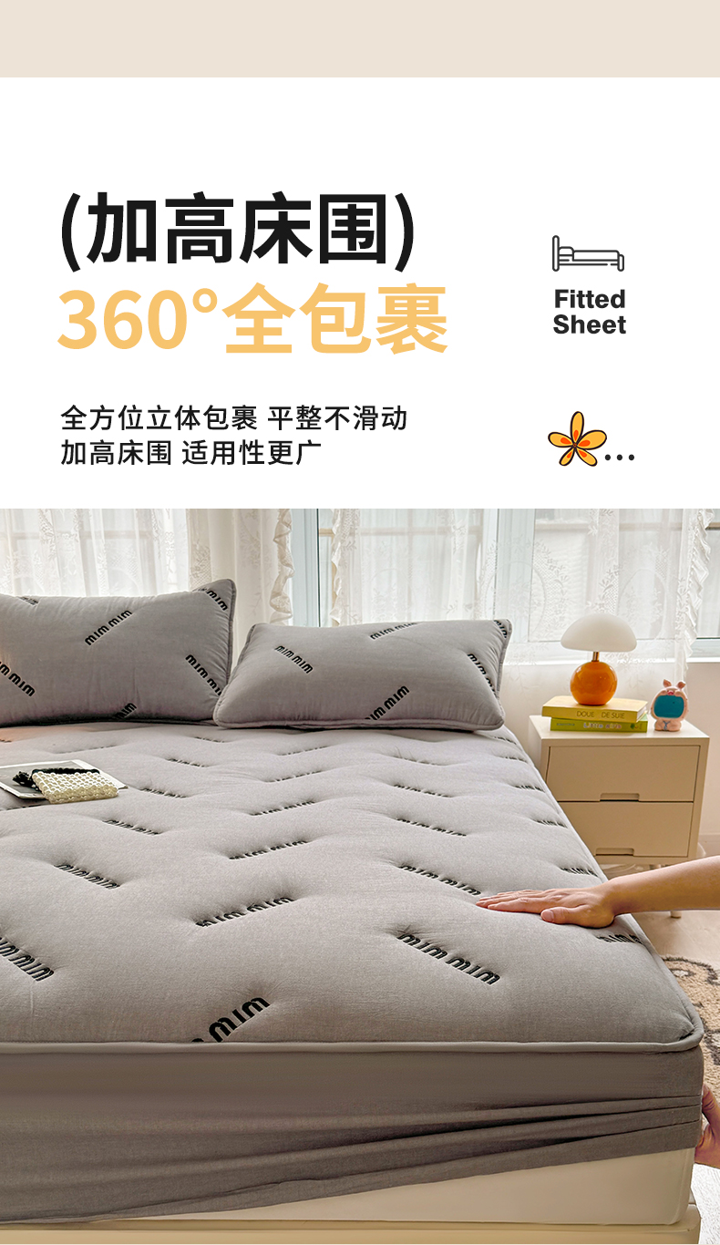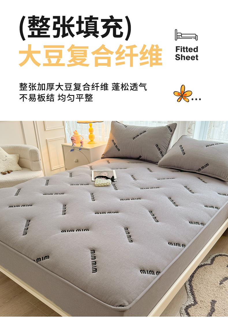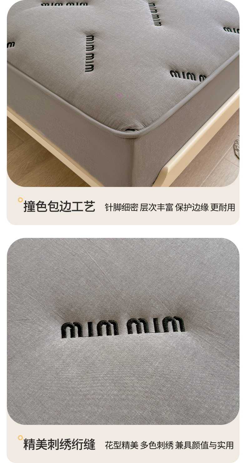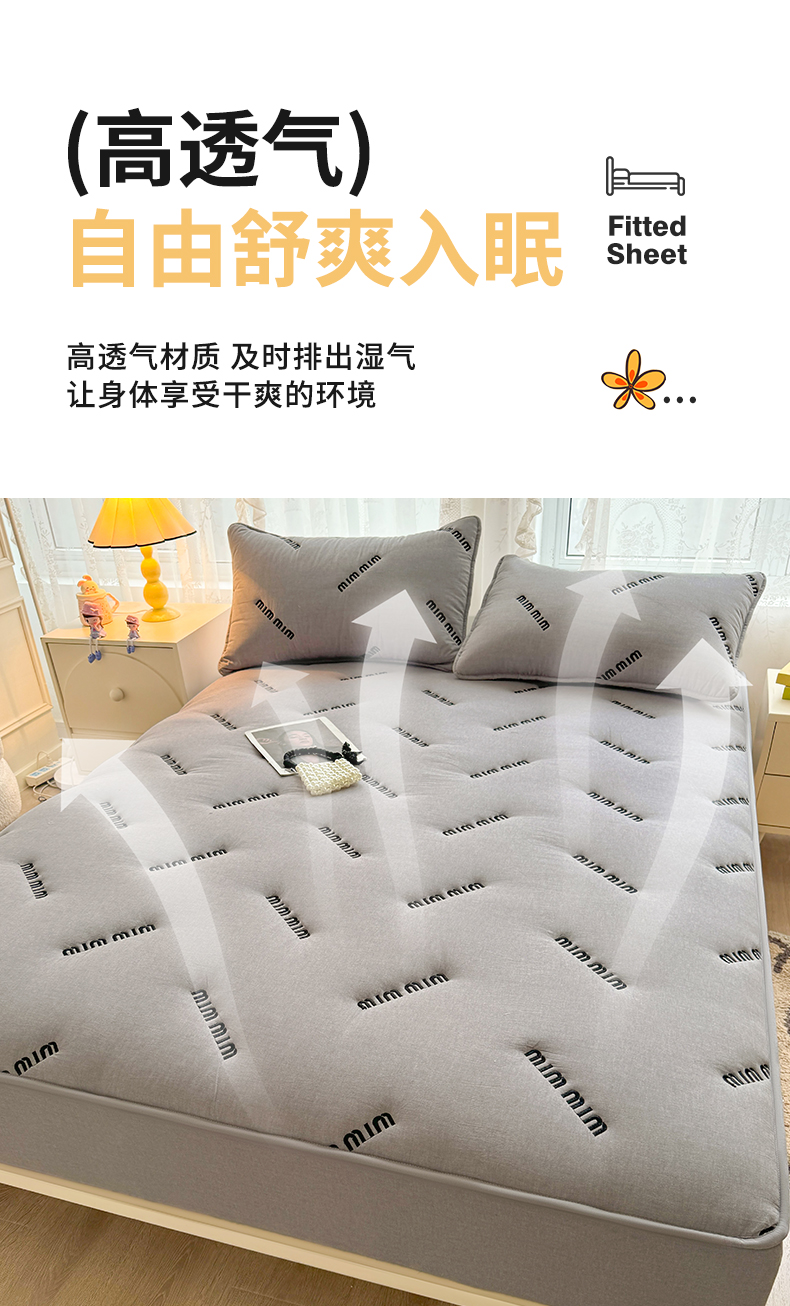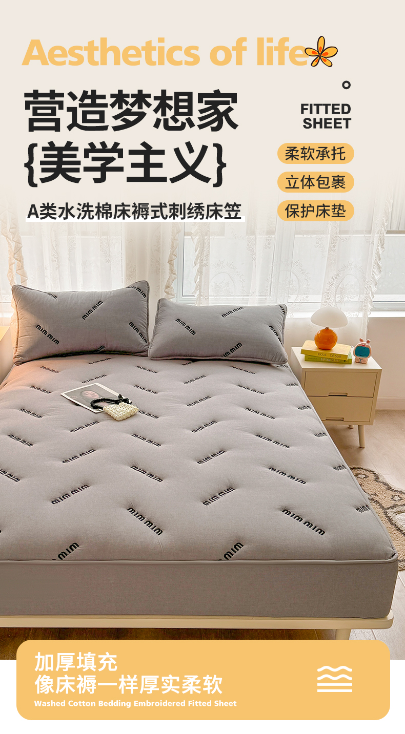予梦家纺 2024新款ins风刺绣夹棉床笠床垫保护套 字母-浅灰