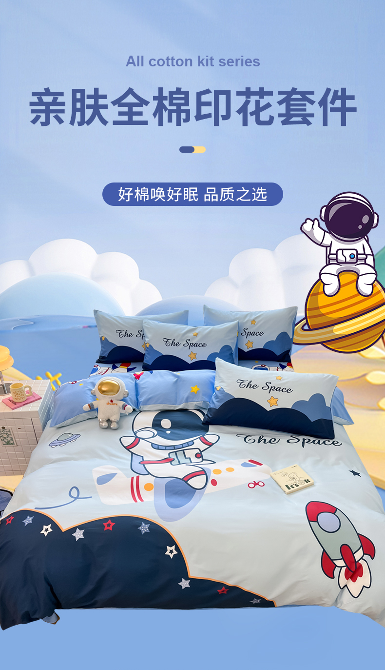当前位置: 91家纺网 > 商品网购 > 床品套件 > 四件套 > 全棉普通四件套 > 孩子王 2025新款亲肤活性大版纯棉专版太空人卡通学生儿童宿舍四件套系列 星际征程