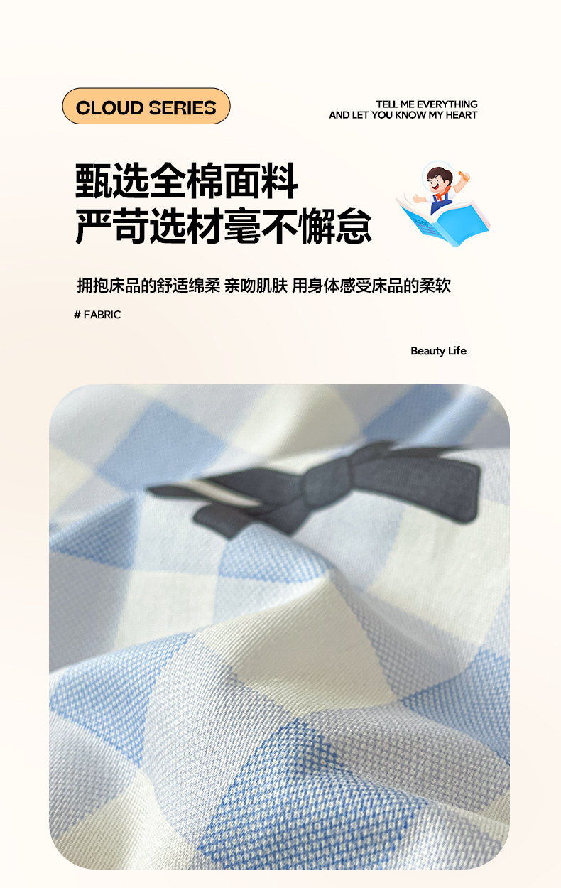 当前位置: 91家纺网 > 商品网购 > 床品套件 > 四件套 > 全棉普通四件套 > 雅居纺 2024新款全棉印花学生季套件 蓝格子蝴蝶结