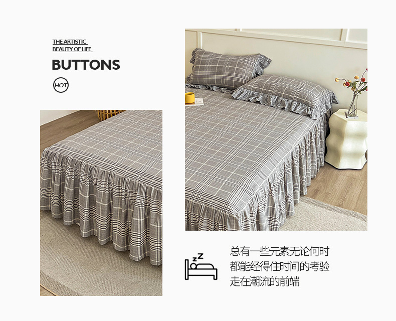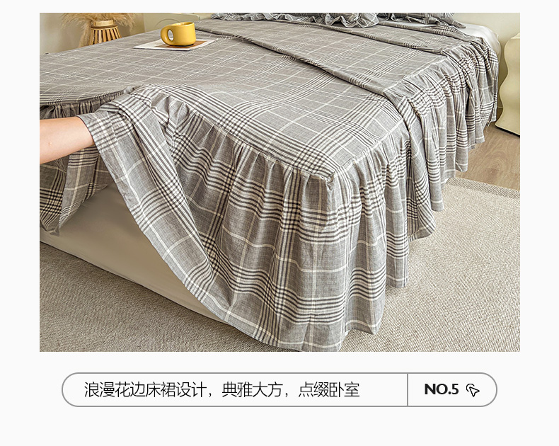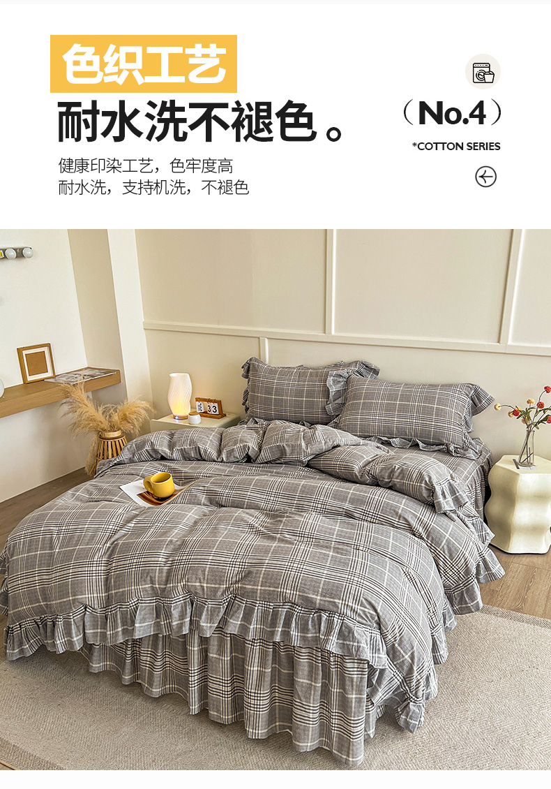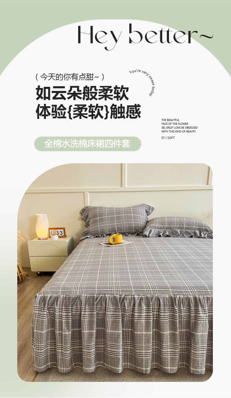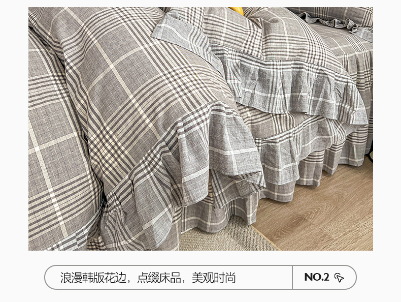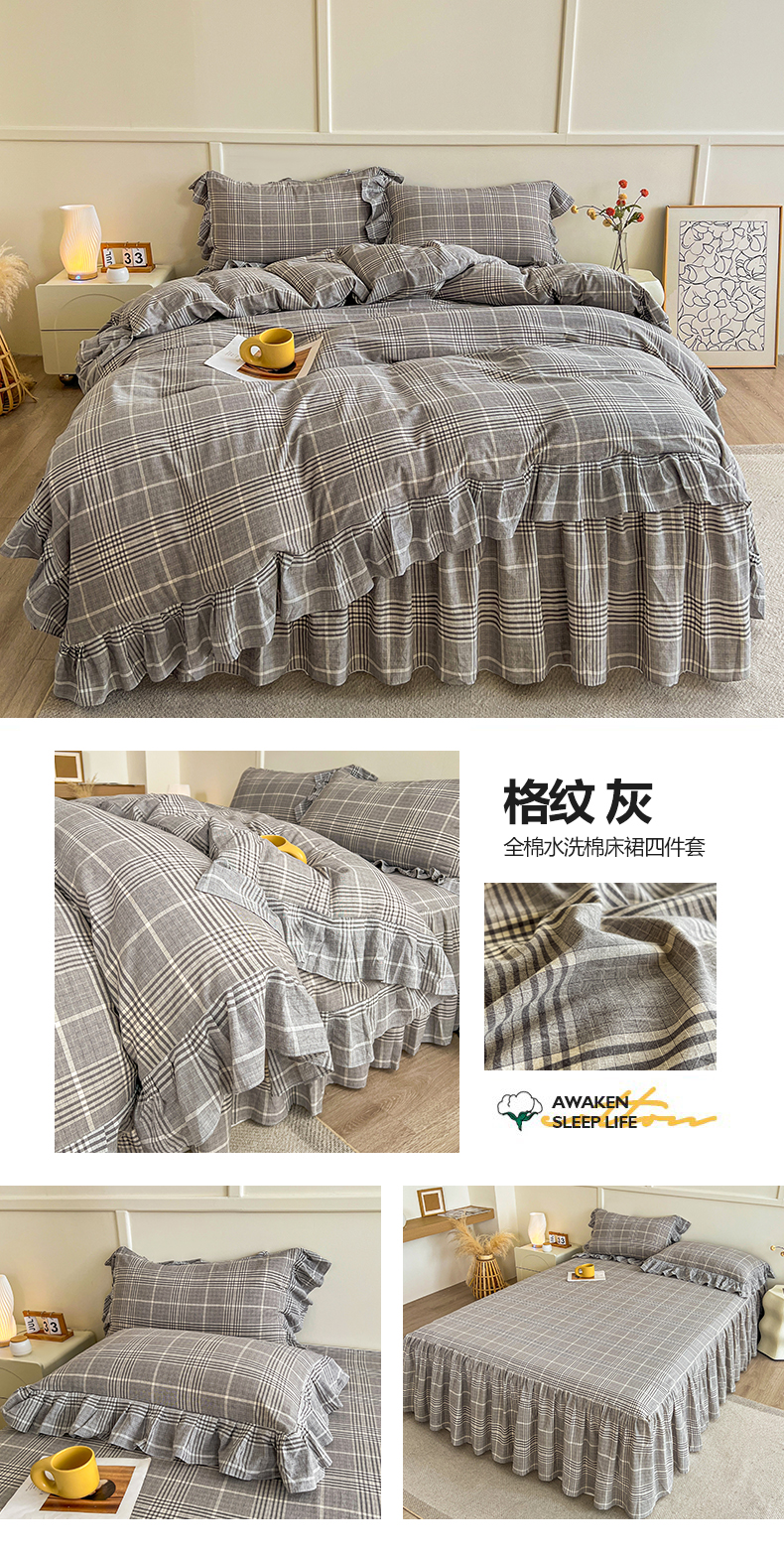 当前位置: 91家纺网 > 商品网购 > 床品套件 > 四件套 > 全棉普通四件套 > 糯米猪家纺 2024新款全棉水洗棉床裙四件套 格纹 灰