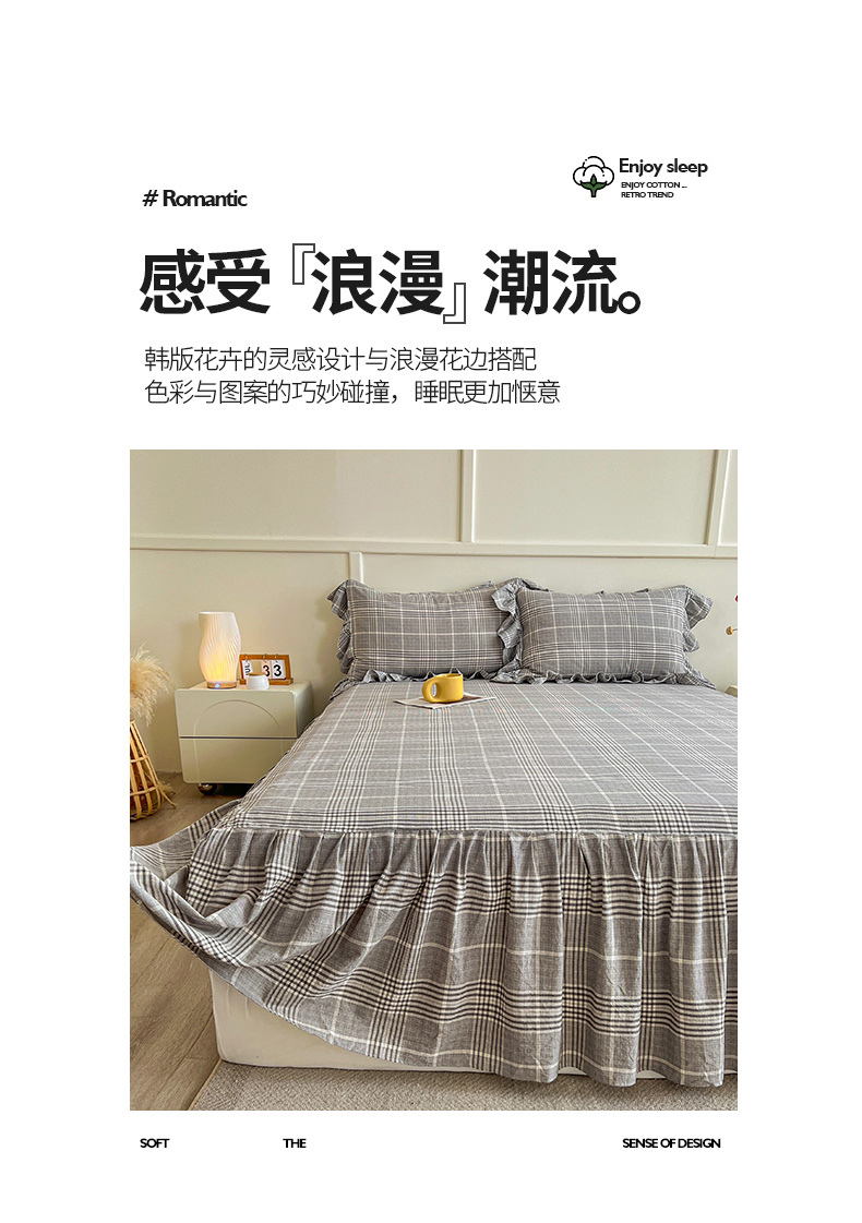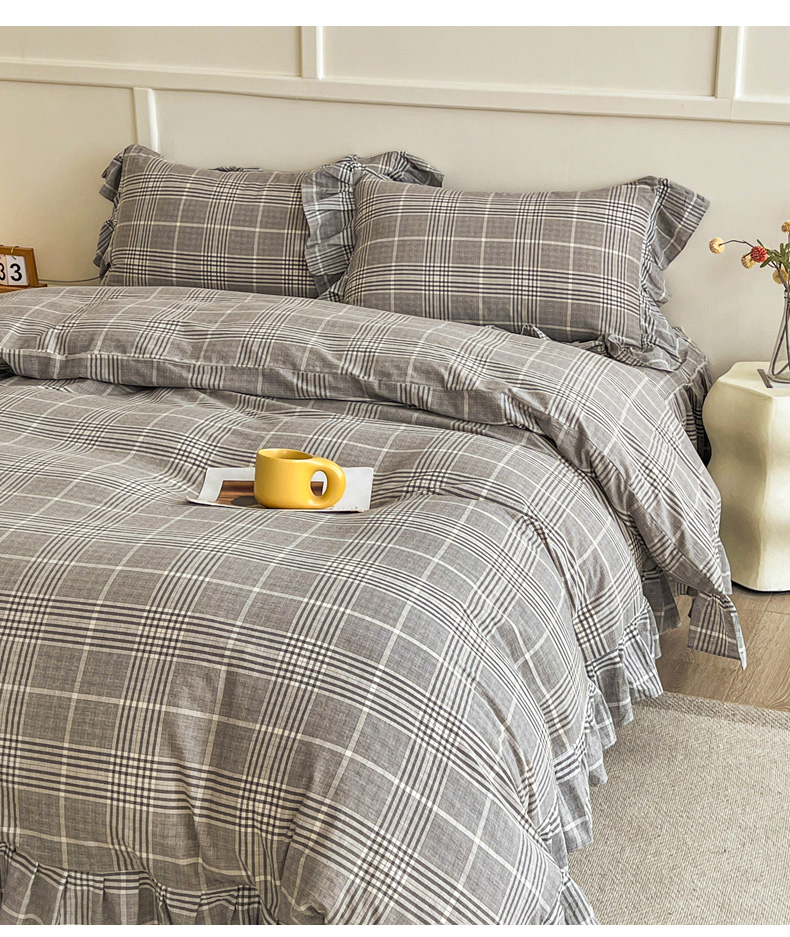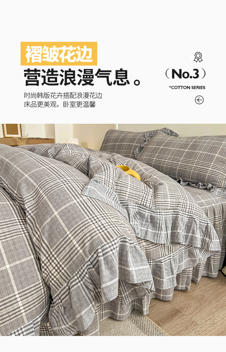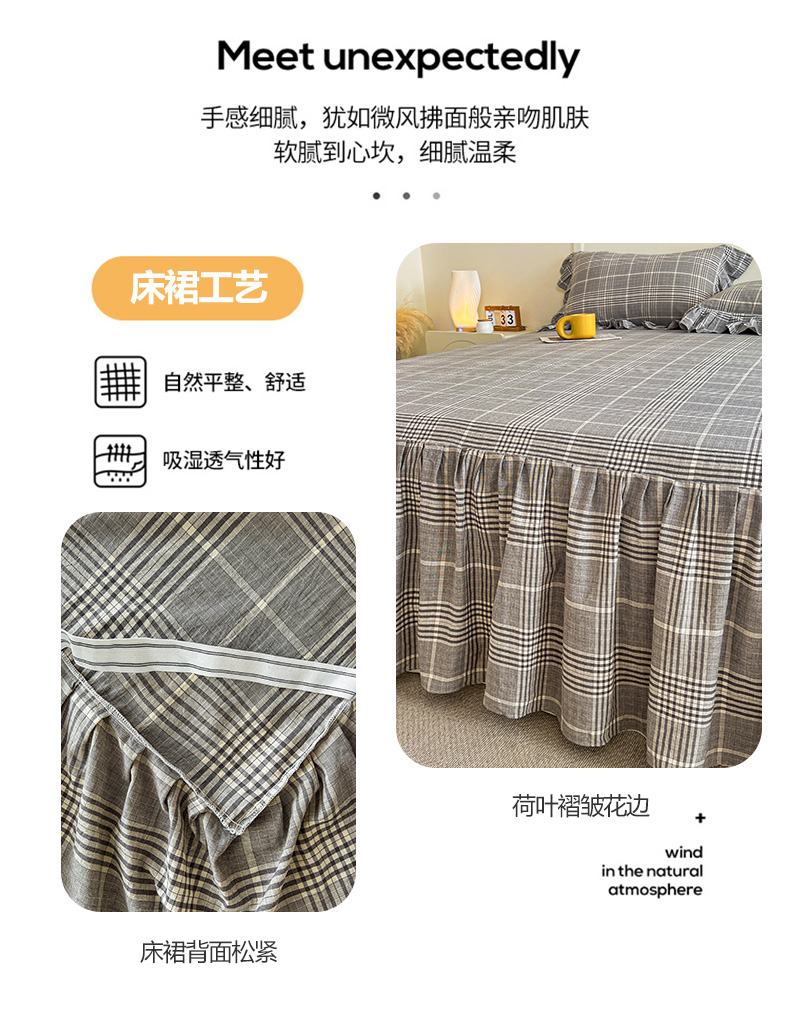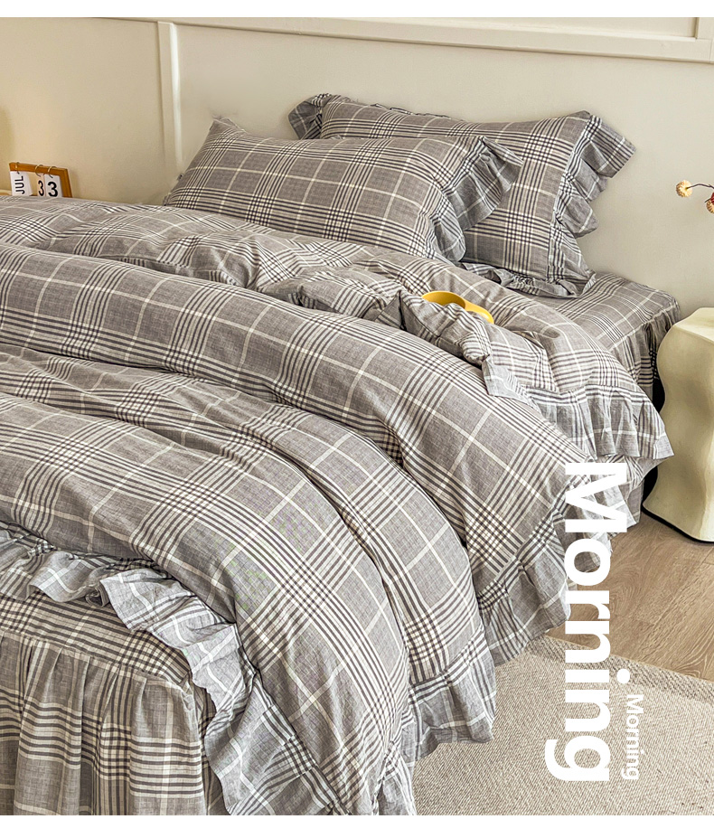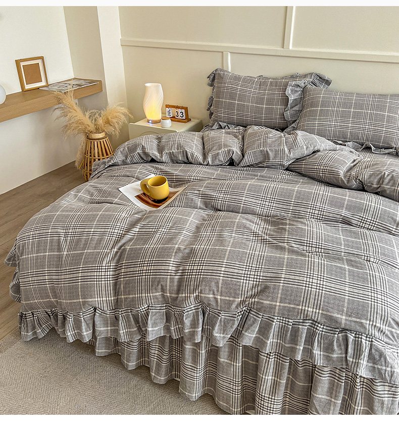 当前位置: 91家纺网 > 商品网购 > 床品套件 > 四件套 > 全棉普通四件套 > 糯米猪家纺 2024新款全棉水洗棉床裙四件套 格纹 灰