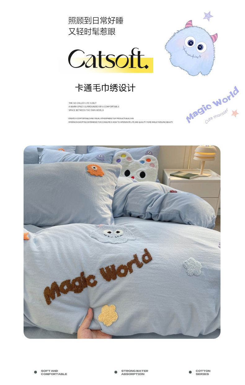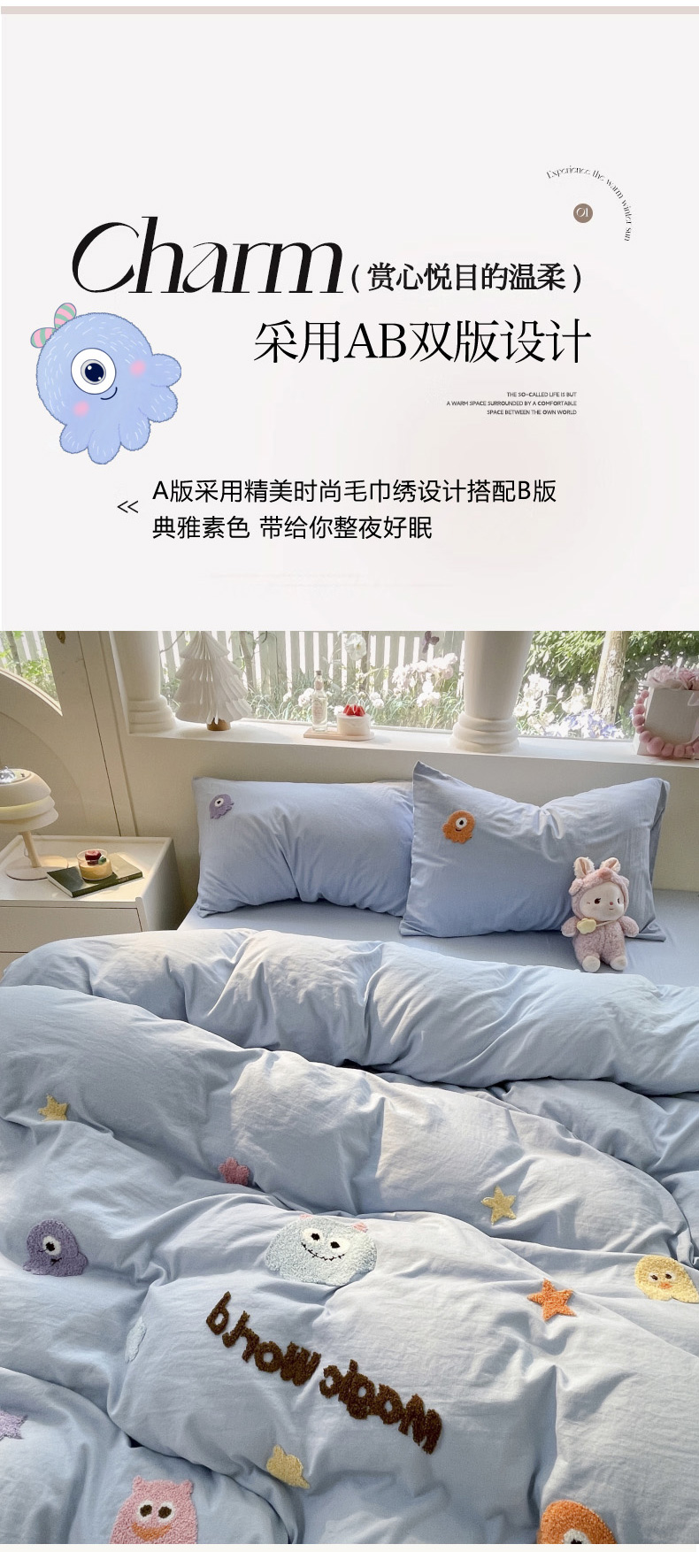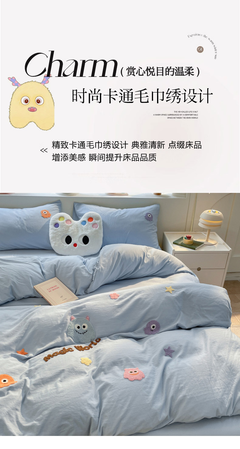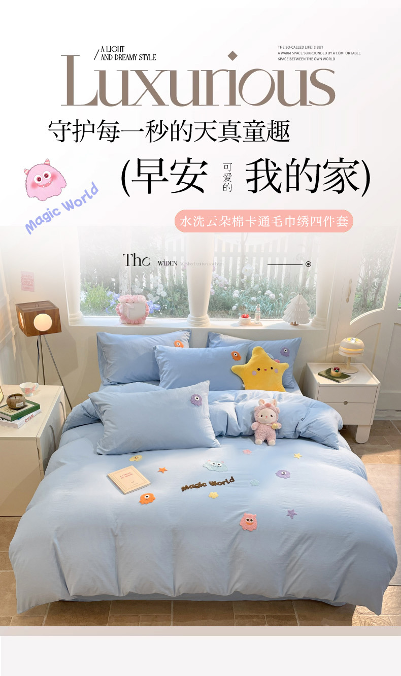 当前位置: 91家纺网 > 商品网购 > 床品套件 > 四件套 > 毛巾绣四件套 > 葡萄家 2024新款毛巾绣水洗云朵棉萌系小怪兽四件套 小怪兽-天空蓝