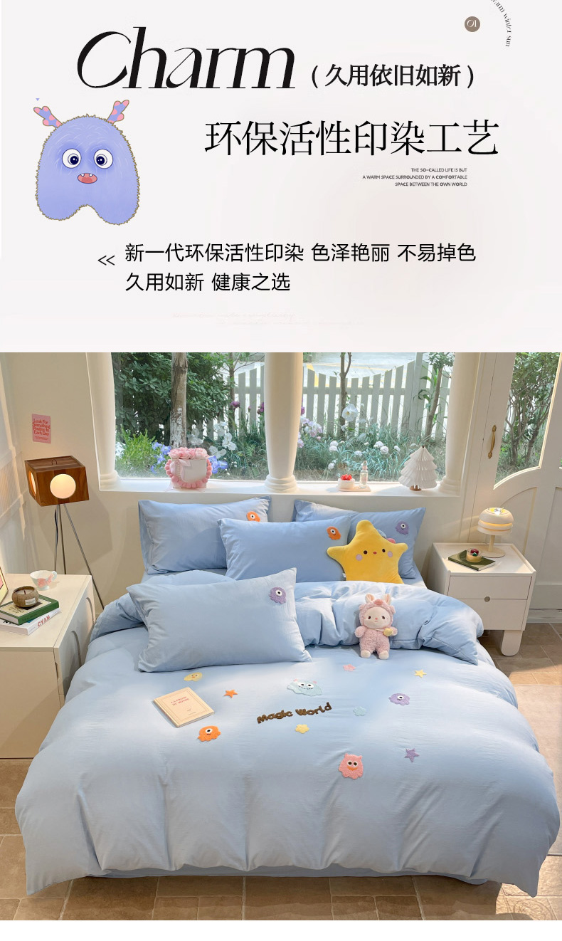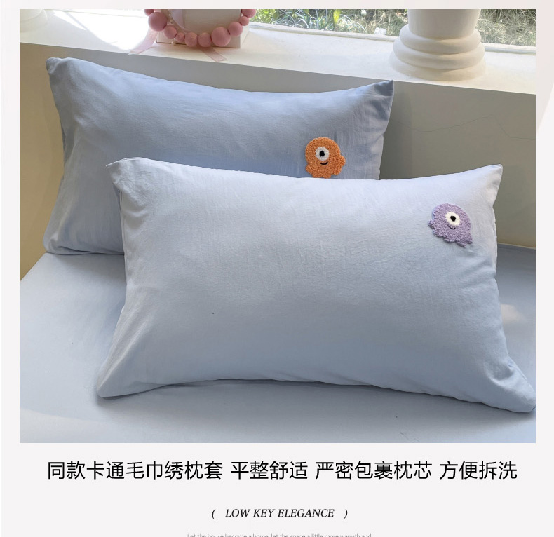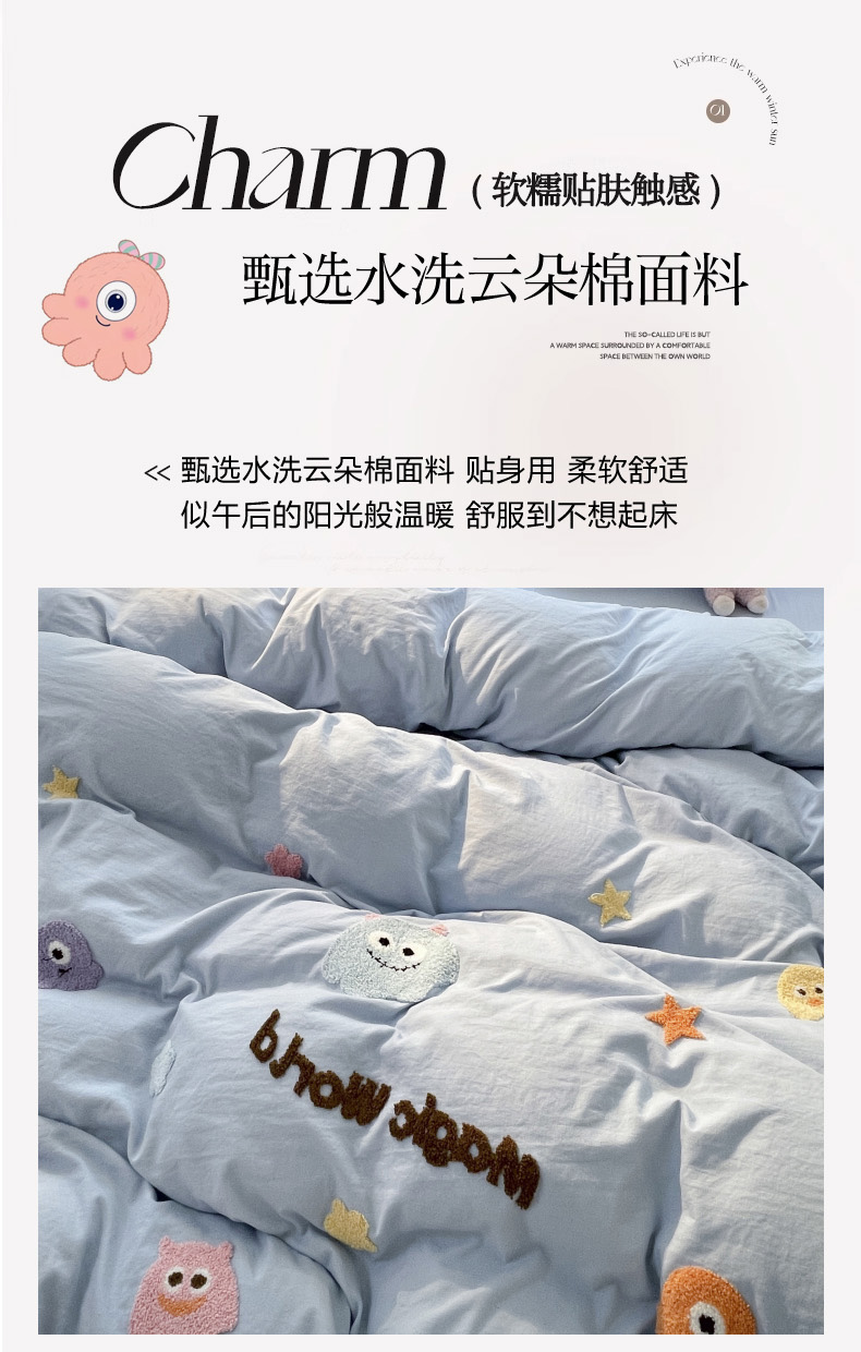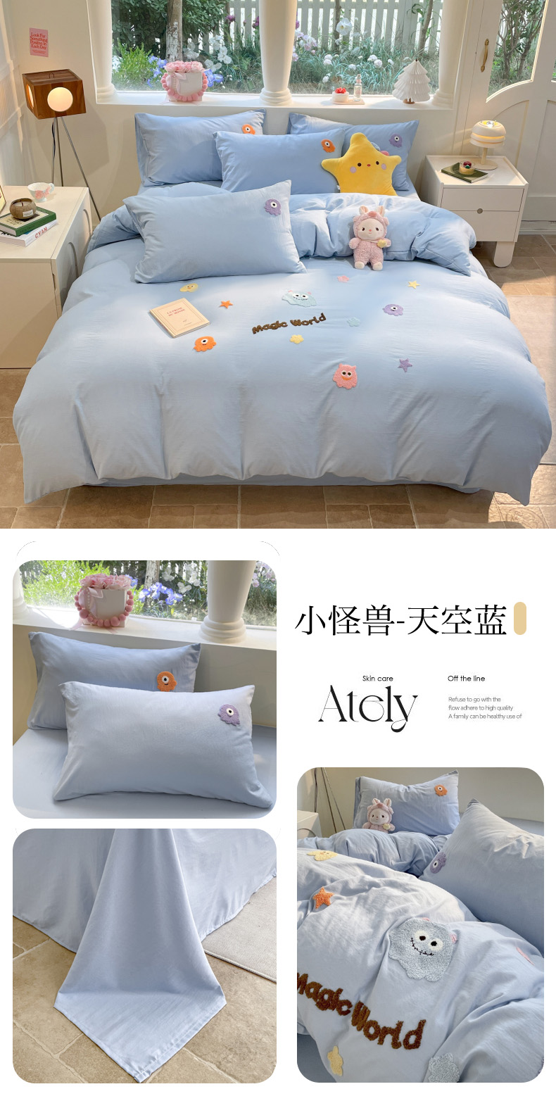 当前位置: 91家纺网 > 商品网购 > 床品套件 > 四件套 > 毛巾绣四件套 > 葡萄家 2024新款毛巾绣水洗云朵棉萌系小怪兽四件套 小怪兽-天空蓝