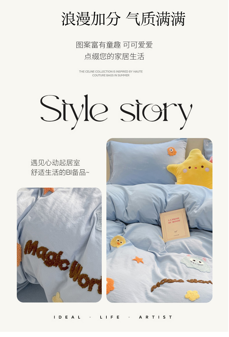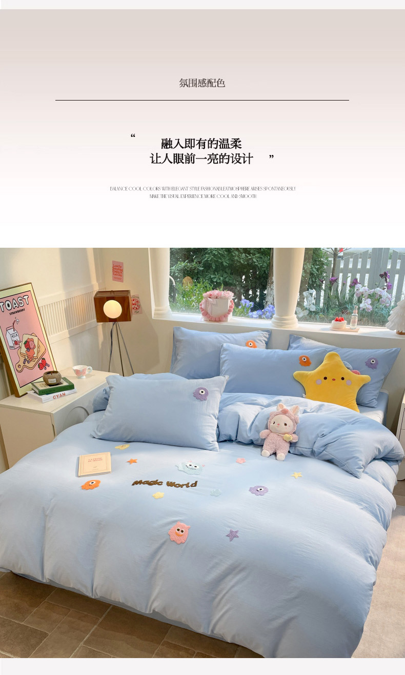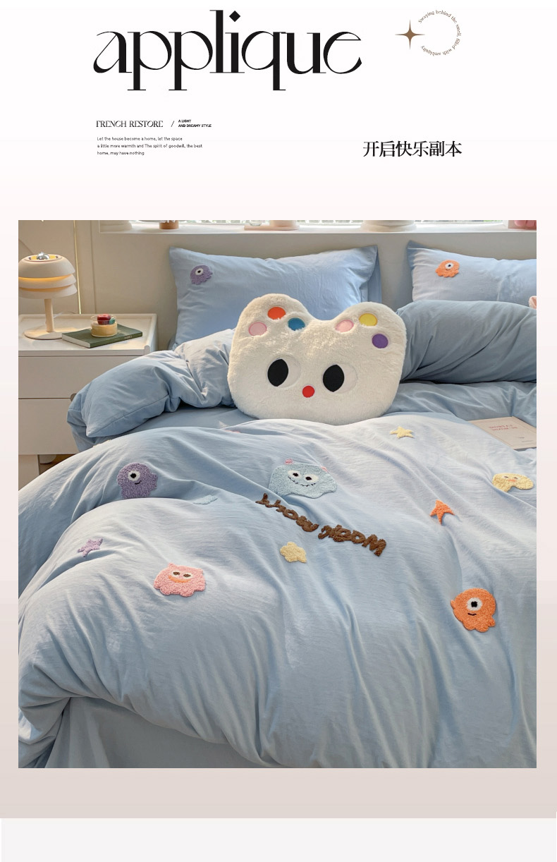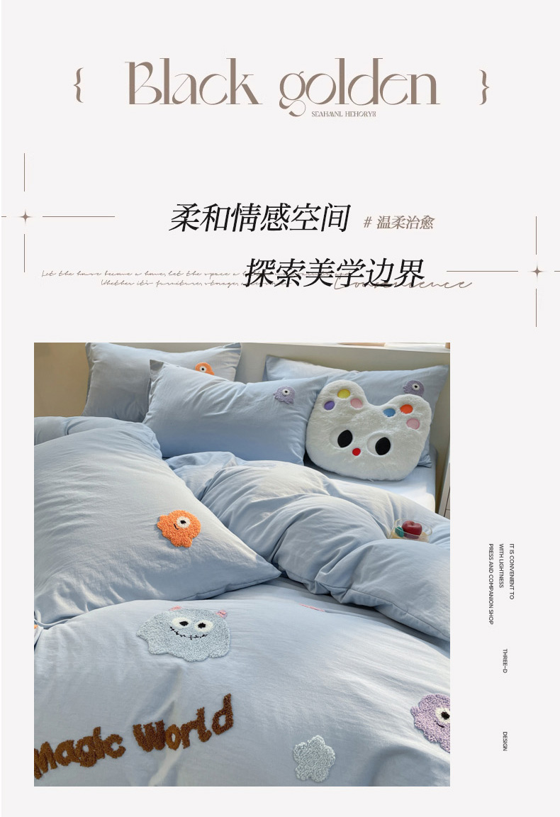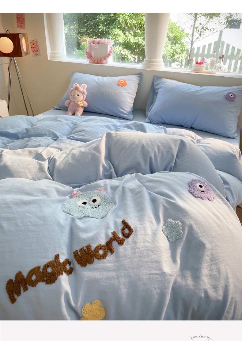 当前位置: 91家纺网 > 商品网购 > 床品套件 > 四件套 > 毛巾绣四件套 > 葡萄家 2024新款毛巾绣水洗云朵棉萌系小怪兽四件套 小怪兽-天空蓝