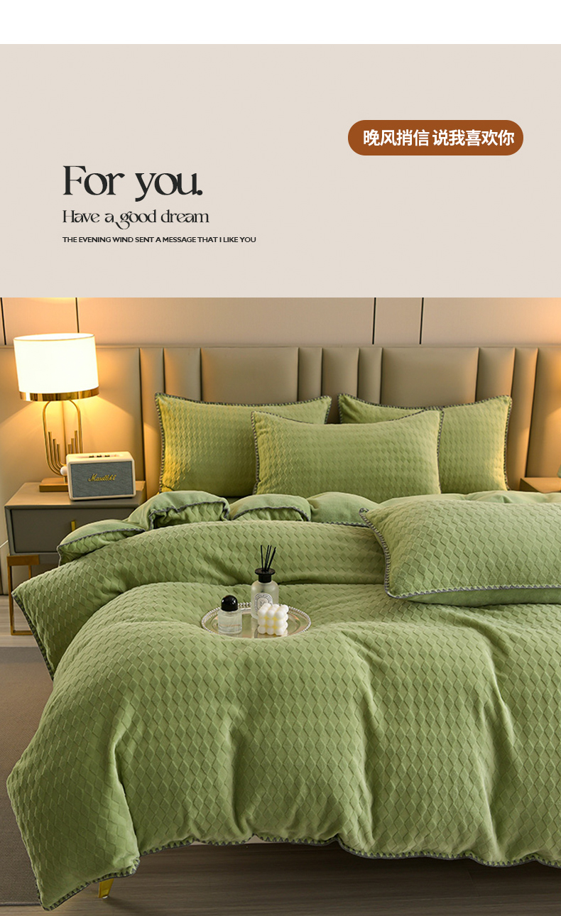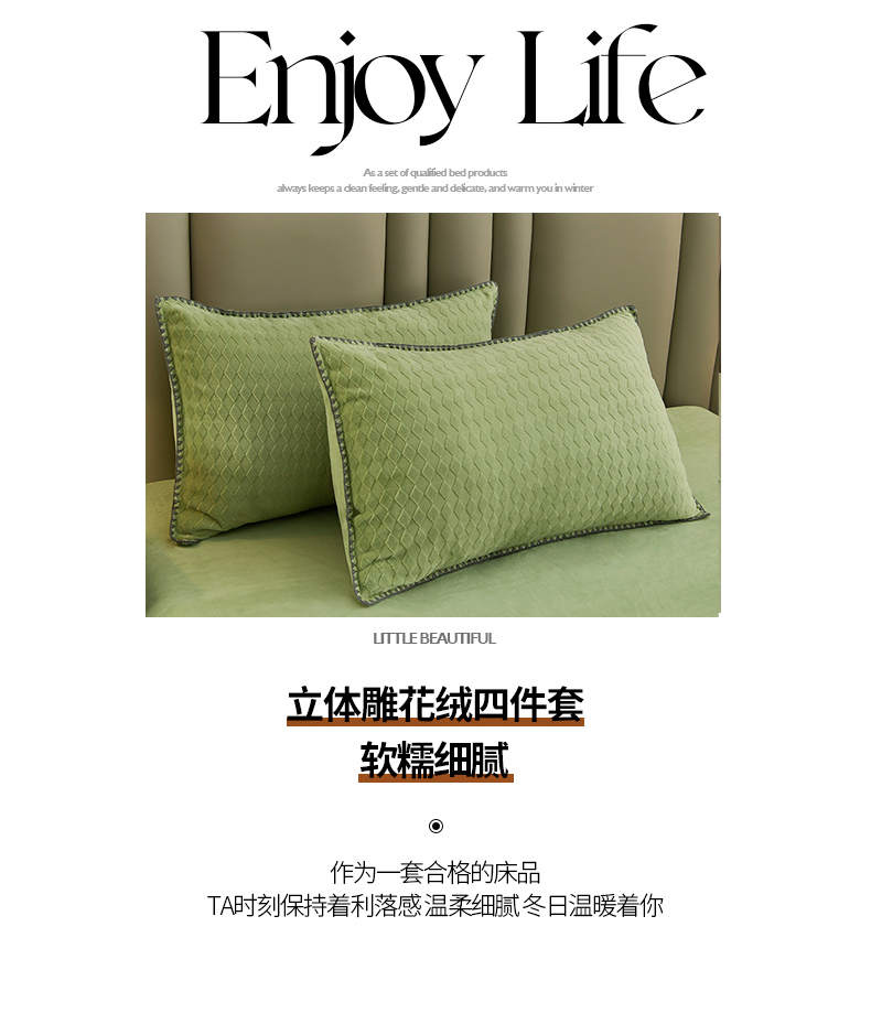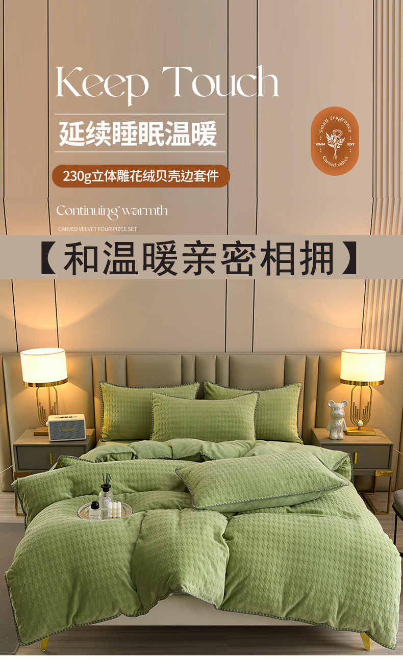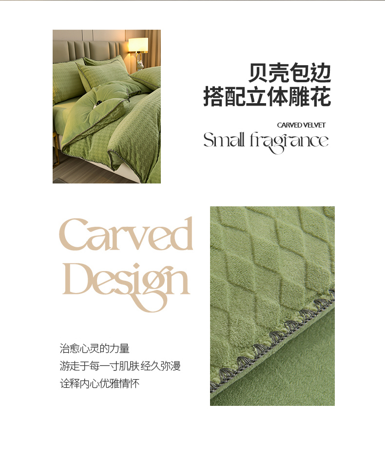 当前位置: 91家纺网 > 商品网购 > 床品套件 > 四件套 > 雕花绒四件套 > 菡宝 2024新款贝壳边雕花绒四件套 菱形格-浅绿