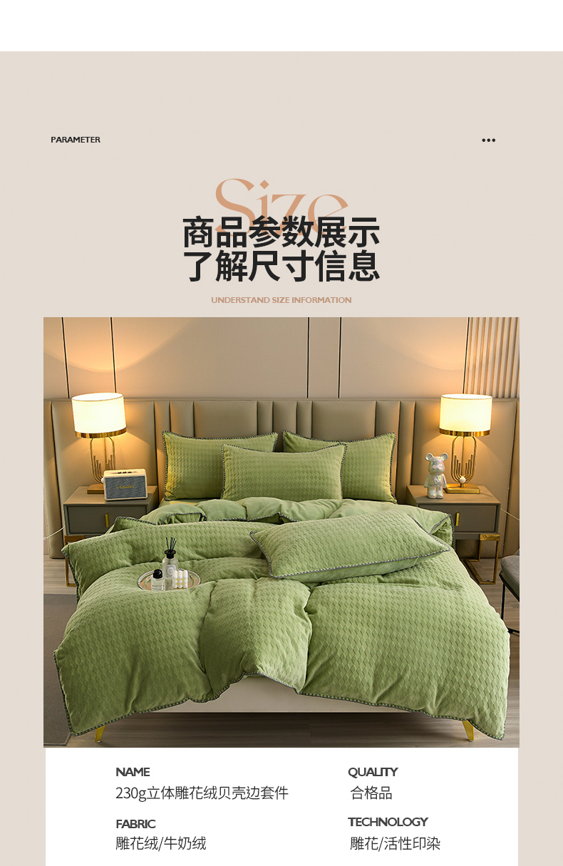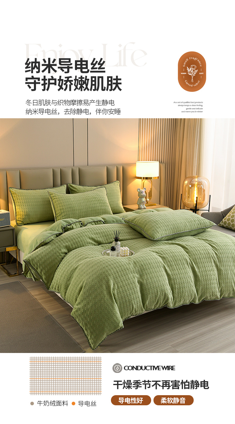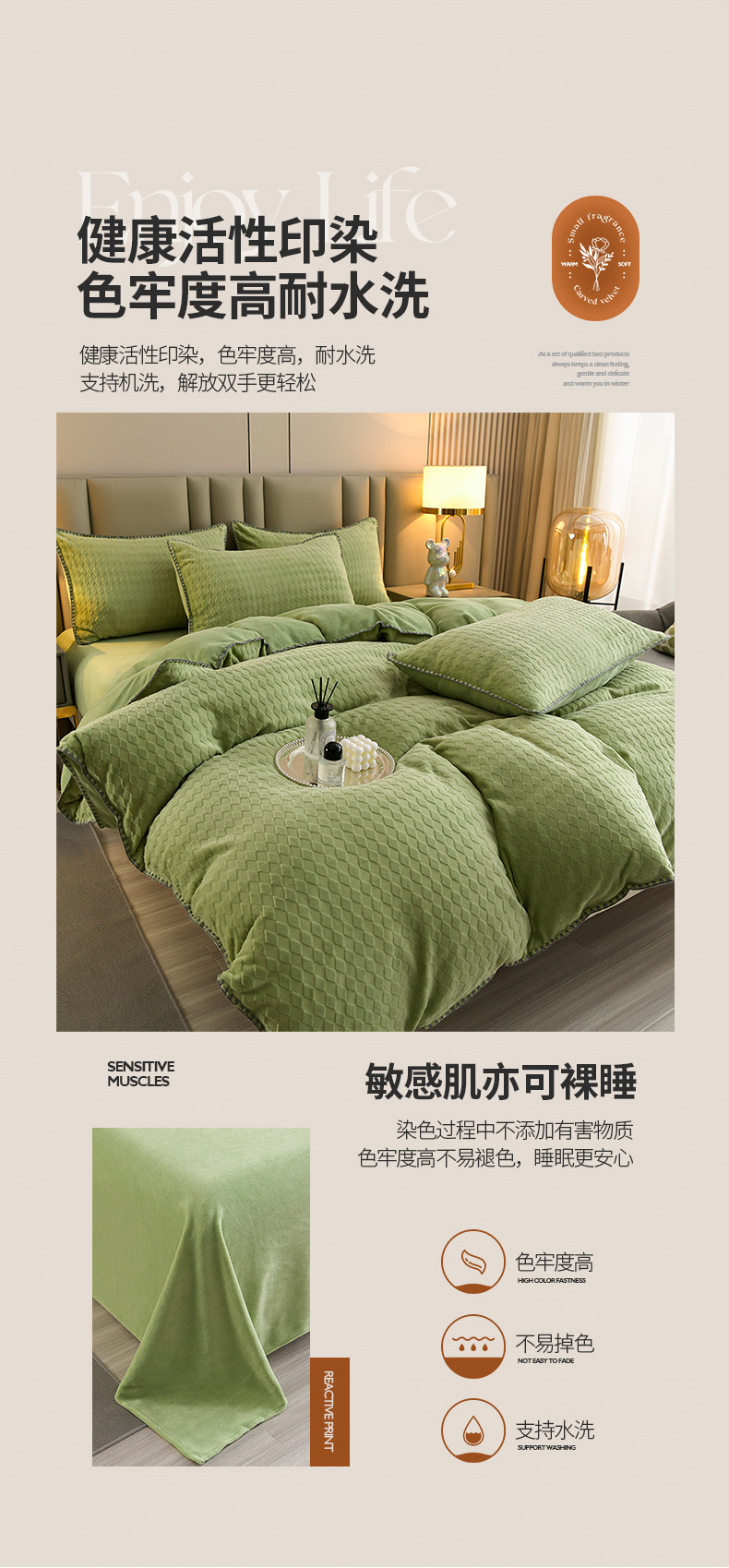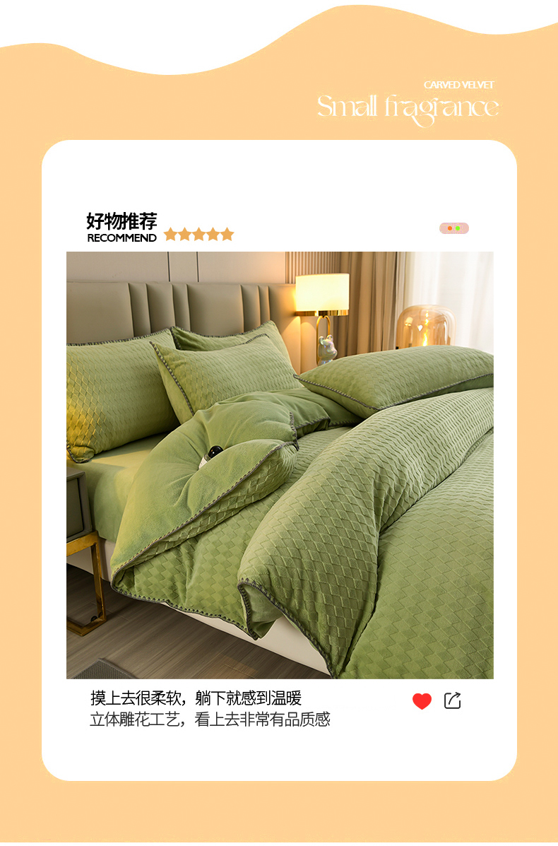 当前位置: 91家纺网 > 商品网购 > 床品套件 > 四件套 > 雕花绒四件套 > 菡宝 2024新款贝壳边雕花绒四件套 菱形格-浅绿