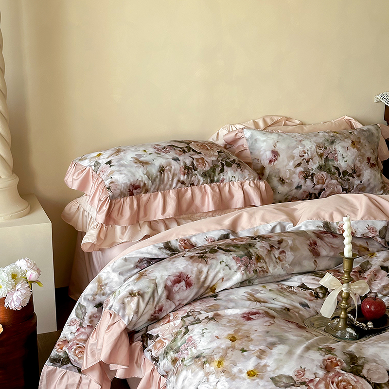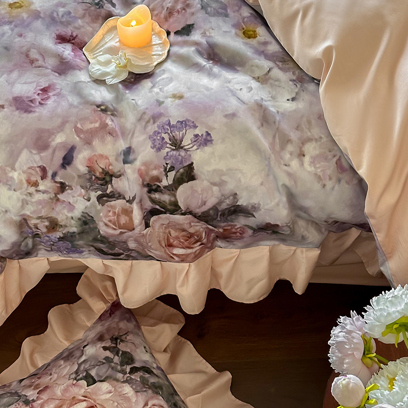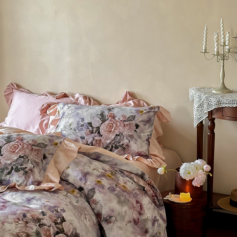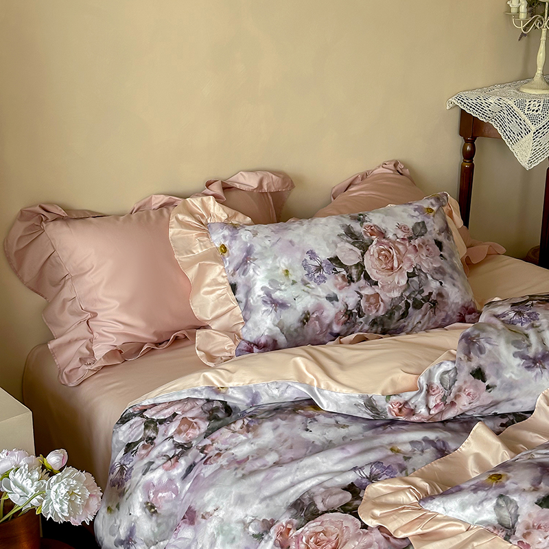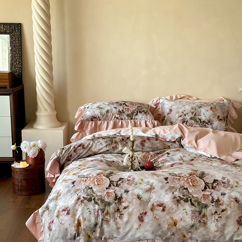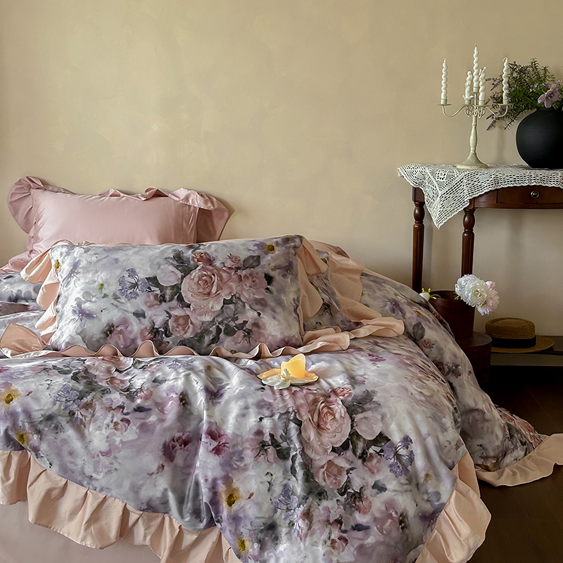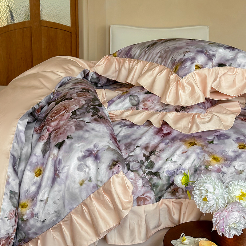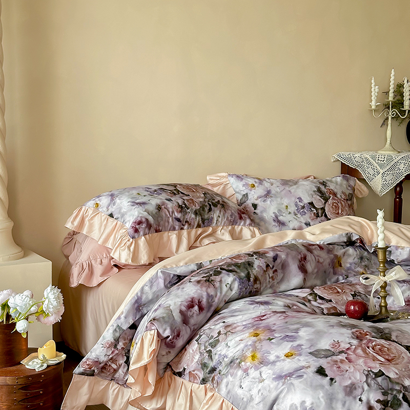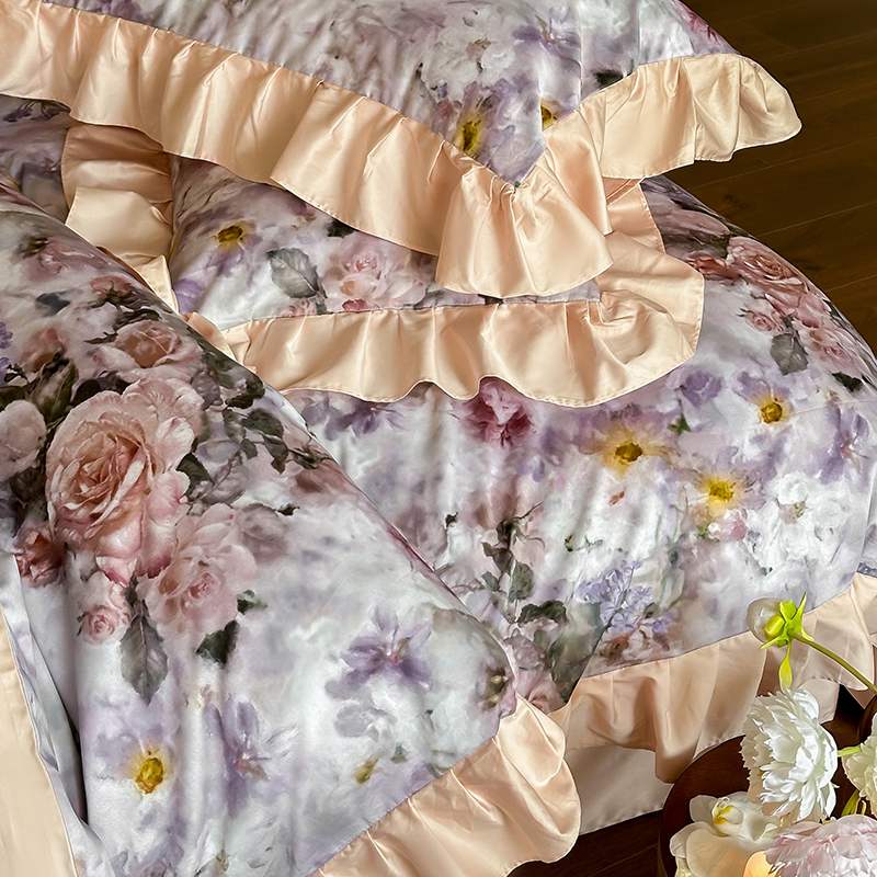 (总)窝米 2025新款数码印花100支长绒棉纯棉工艺花边款四件套-晚意,晚意