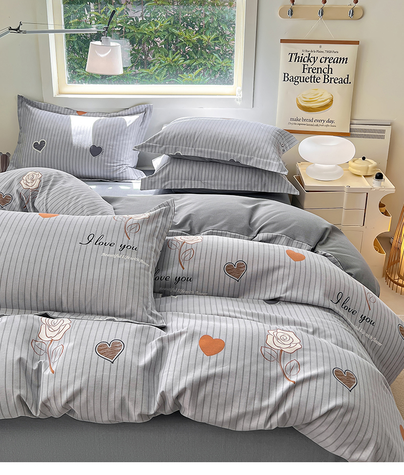 品乐家纺 2024新款全棉生态棉印花磨毛四件套 玫瑰恋人-灰