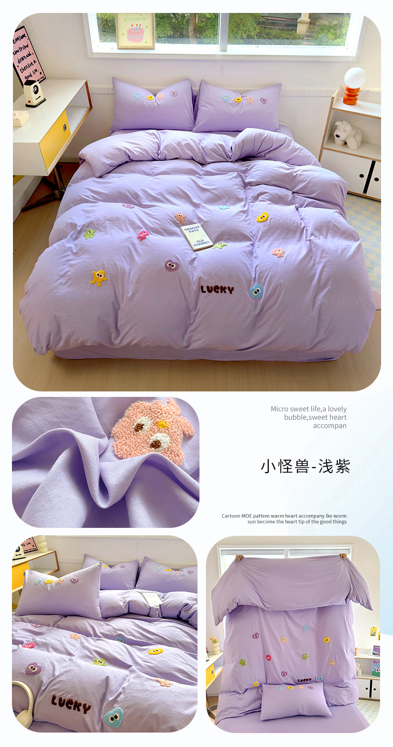 当前位置: 91家纺网 > 商品网购 > 床品套件 > 四件套 > 水洗棉四件套 > 一比一家纺 2024新款水洗棉毛巾绣系列 小怪兽-浅紫