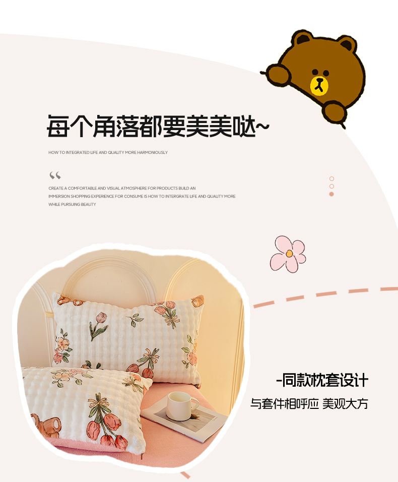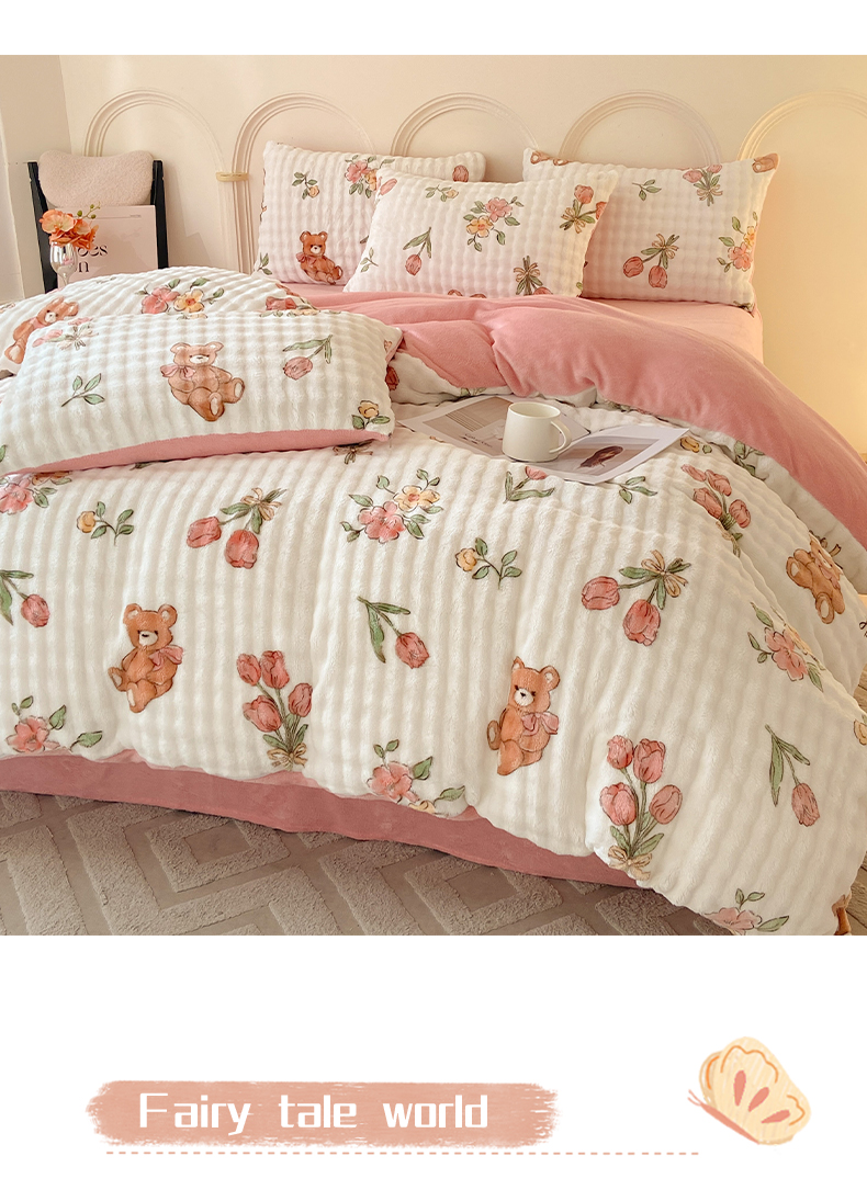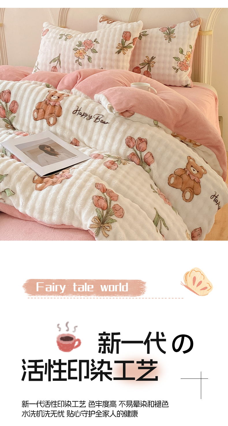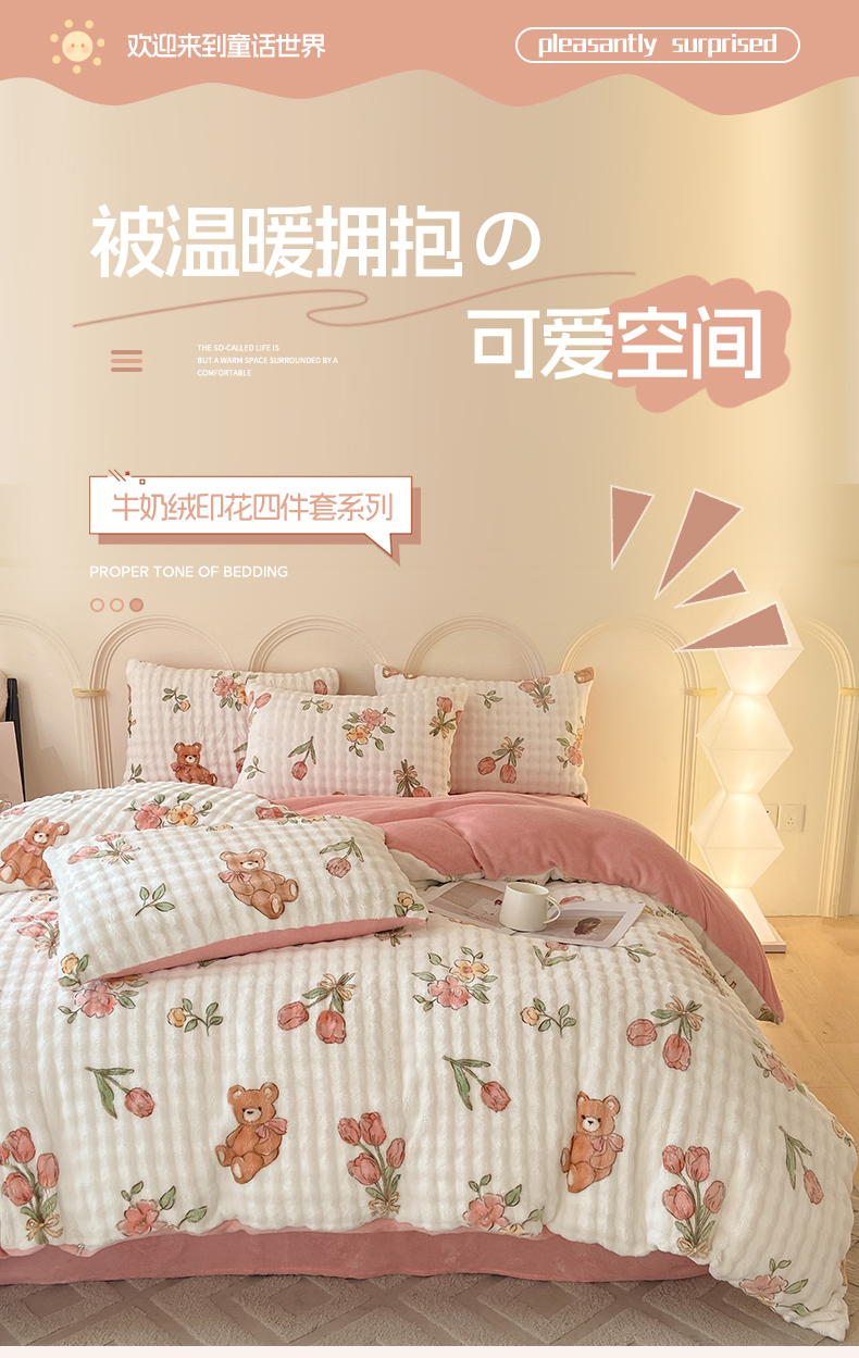 当前位置: 91家纺网 > 商品网购 > 床品套件 > 四件套 > 牛奶绒四件套 > 逸尚阁 2024新款牛奶绒泡泡印花四件套 鲜花熊仔