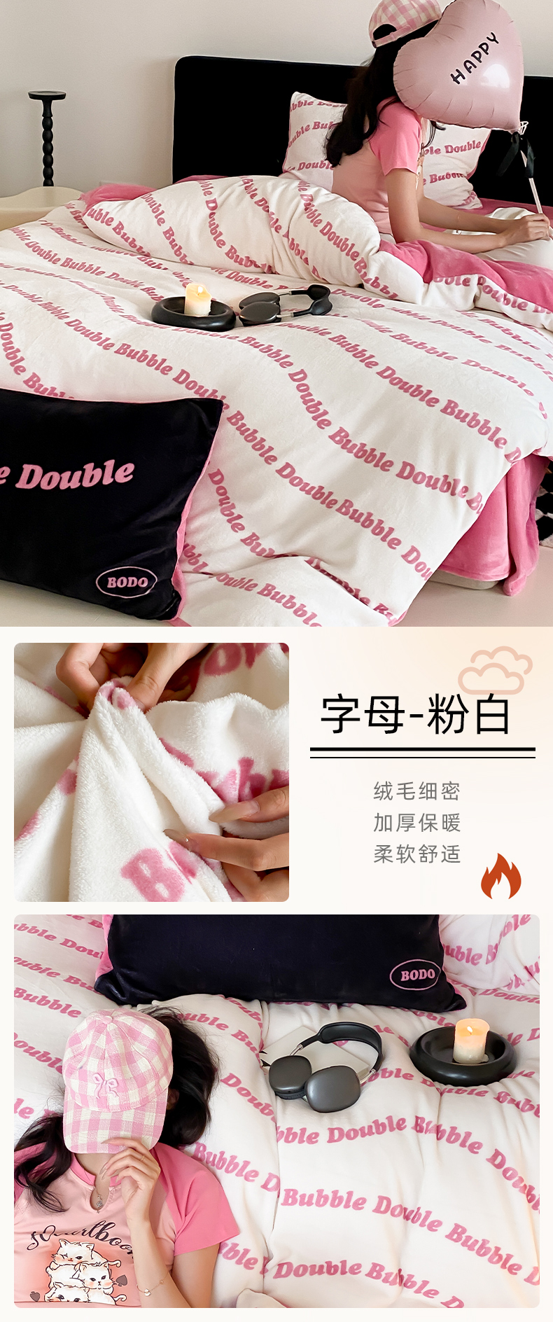 商品名称:时光里 2024新款牛奶绒四件套--字母 字母-粉白