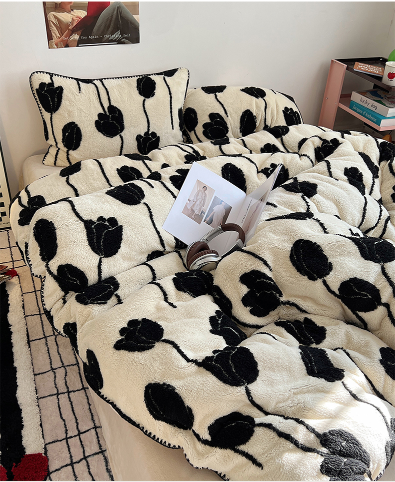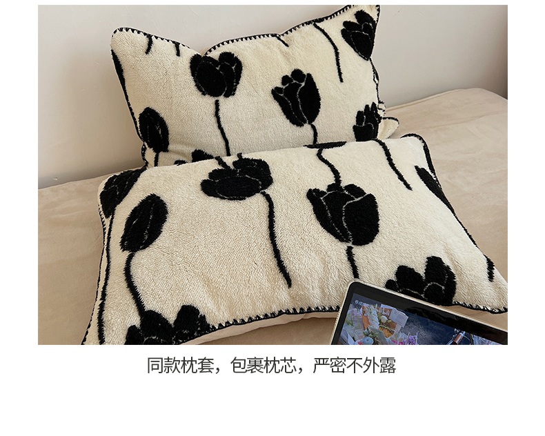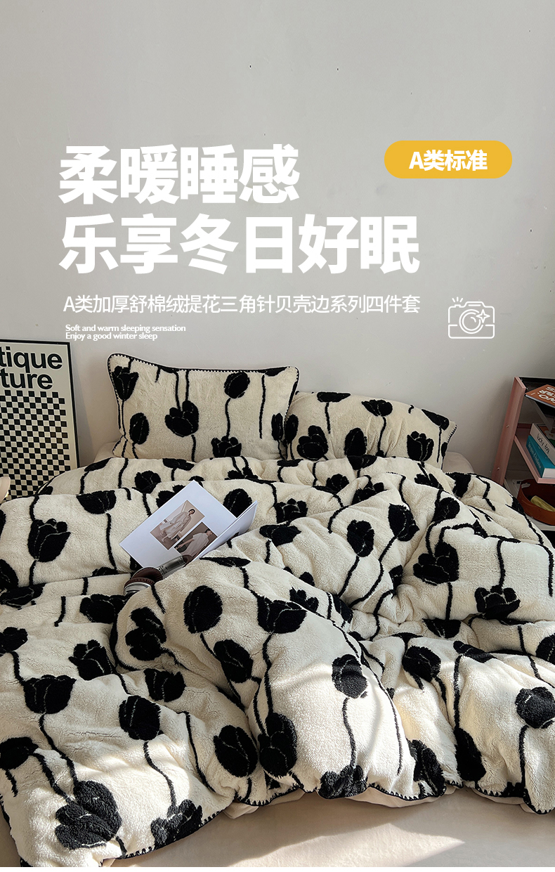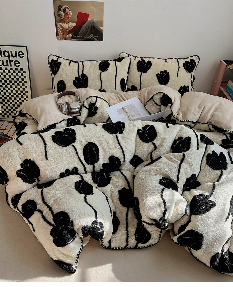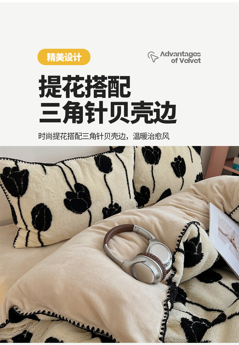 当前位置: 91家纺网 > 商品网购 > 床品套件 > 四件套 > 牛奶绒四件套 > 桃子家居 2024新款A类加厚美拉德温暖治愈风舒棉绒黑纱阳离子提花三角针贝壳边牛奶绒系列四件套 绒三角针-美拉德郁金香
