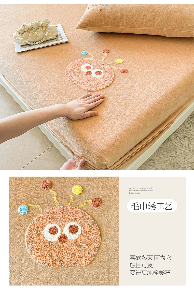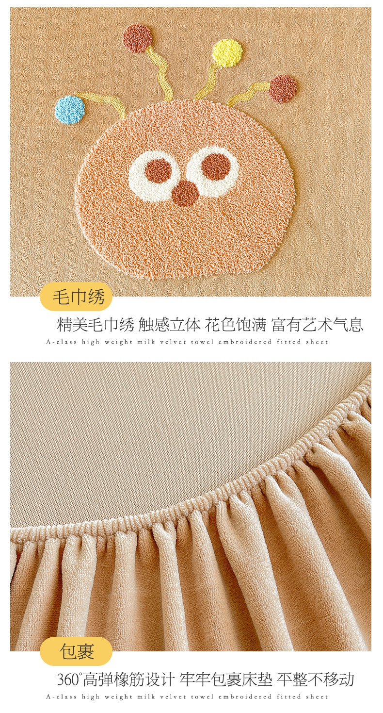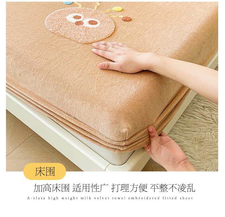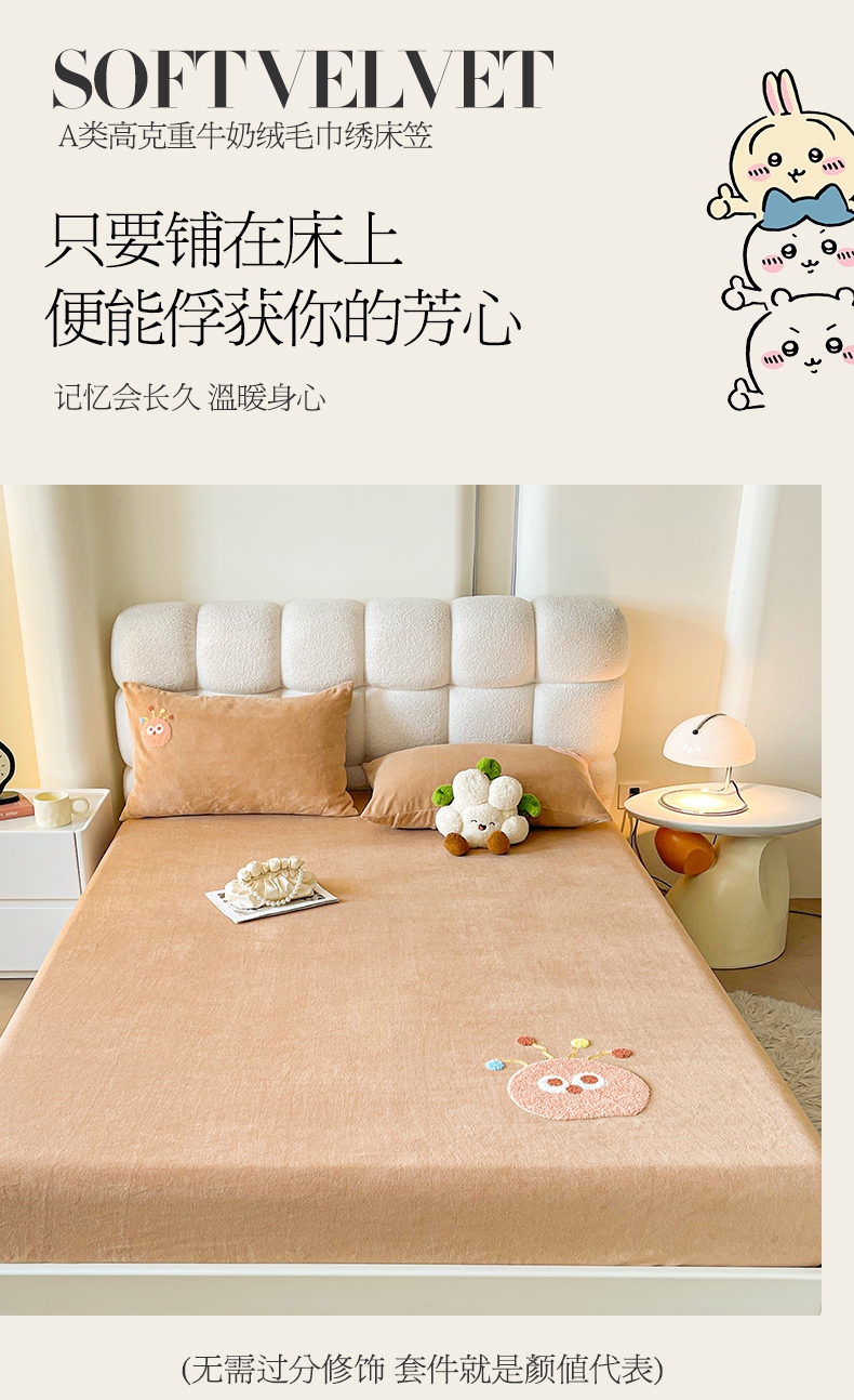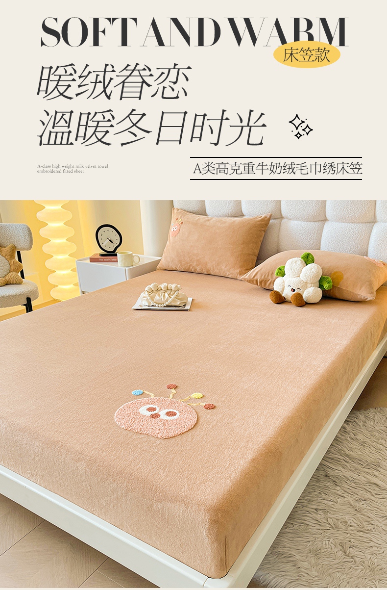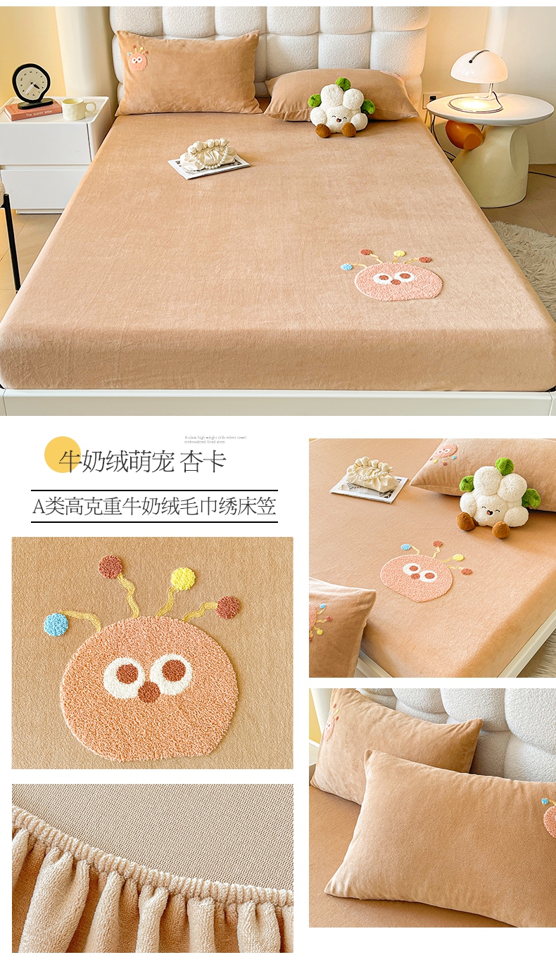 居眠 2024新款单层高克重牛奶绒毛巾绣床笠 牛奶绒萌宠 杏卡