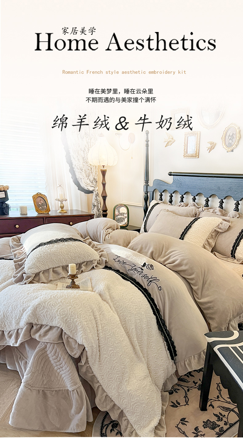 (总)乐朵家居 2025新款 南法庄园 牛奶绒 夹棉床盖四件套,粉玉,奶白