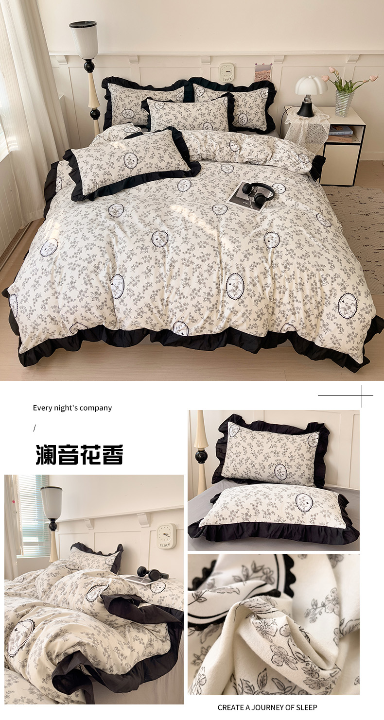 当前位置: 91家纺网 > 商品网购 > 床品套件 > 四件套 > 水洗棉四件套 > 艺玲家纺 2025新款韩版法式赫本风黑色花边水洗棉印花四件套 澜音花香