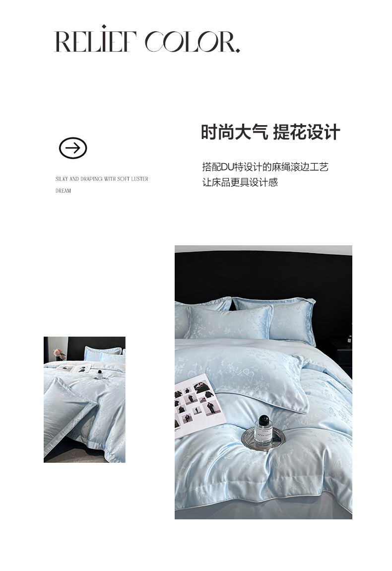 (总)米彩家纺 2025新款A类水洗真丝亮光浮雕花边四件套,粉香槟,粉玉,奶昔白,浅灰,天兰