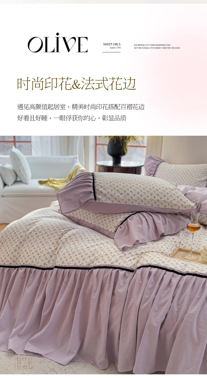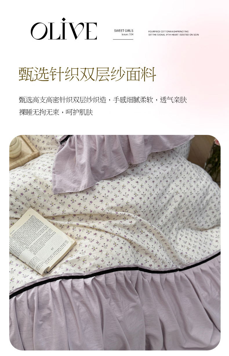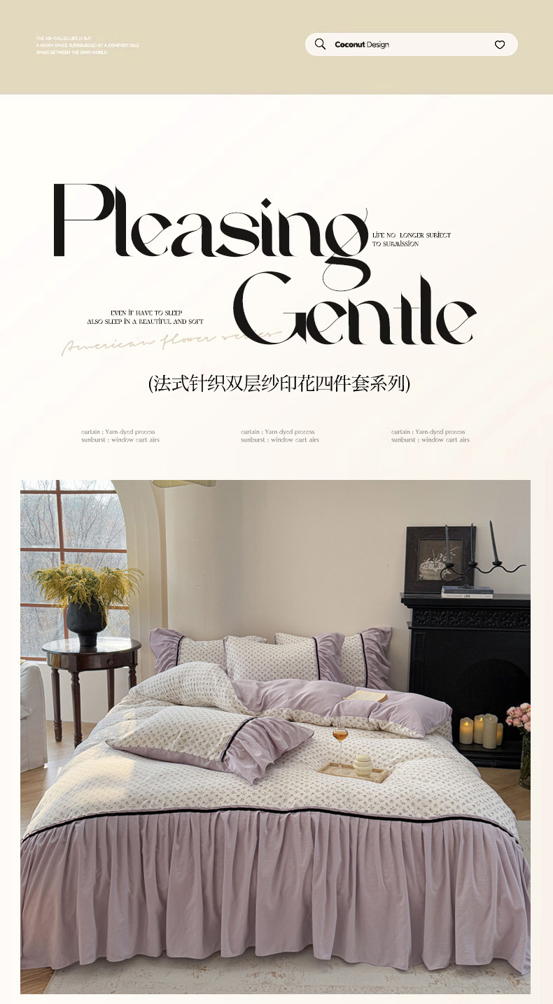 当前位置: 91家纺网 > 商品网购 > 床品套件 > 四件套 > 其它四件套 > 沐慕 2025新款法式针织双层纱印花系列四件套 紫苏